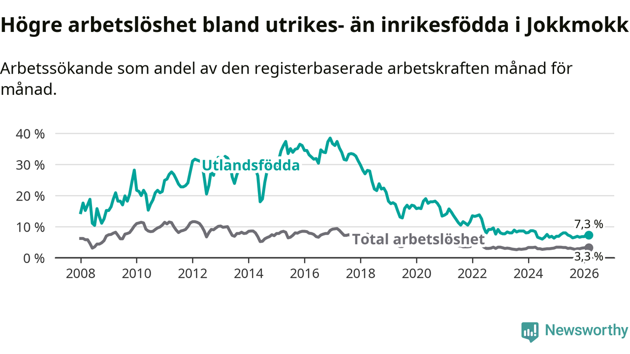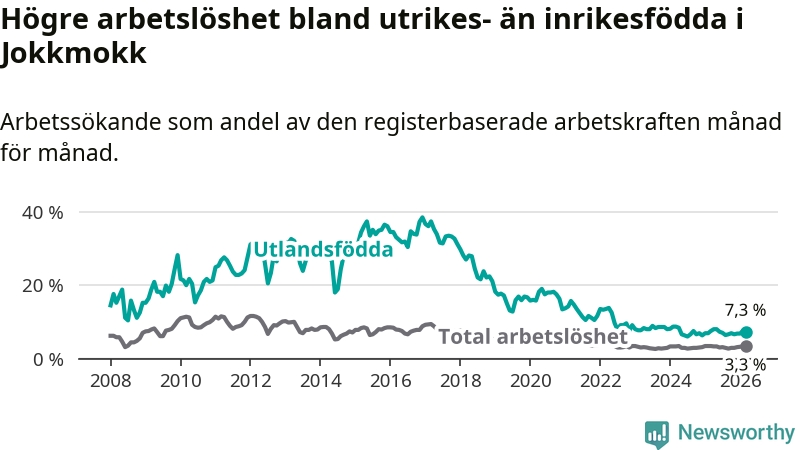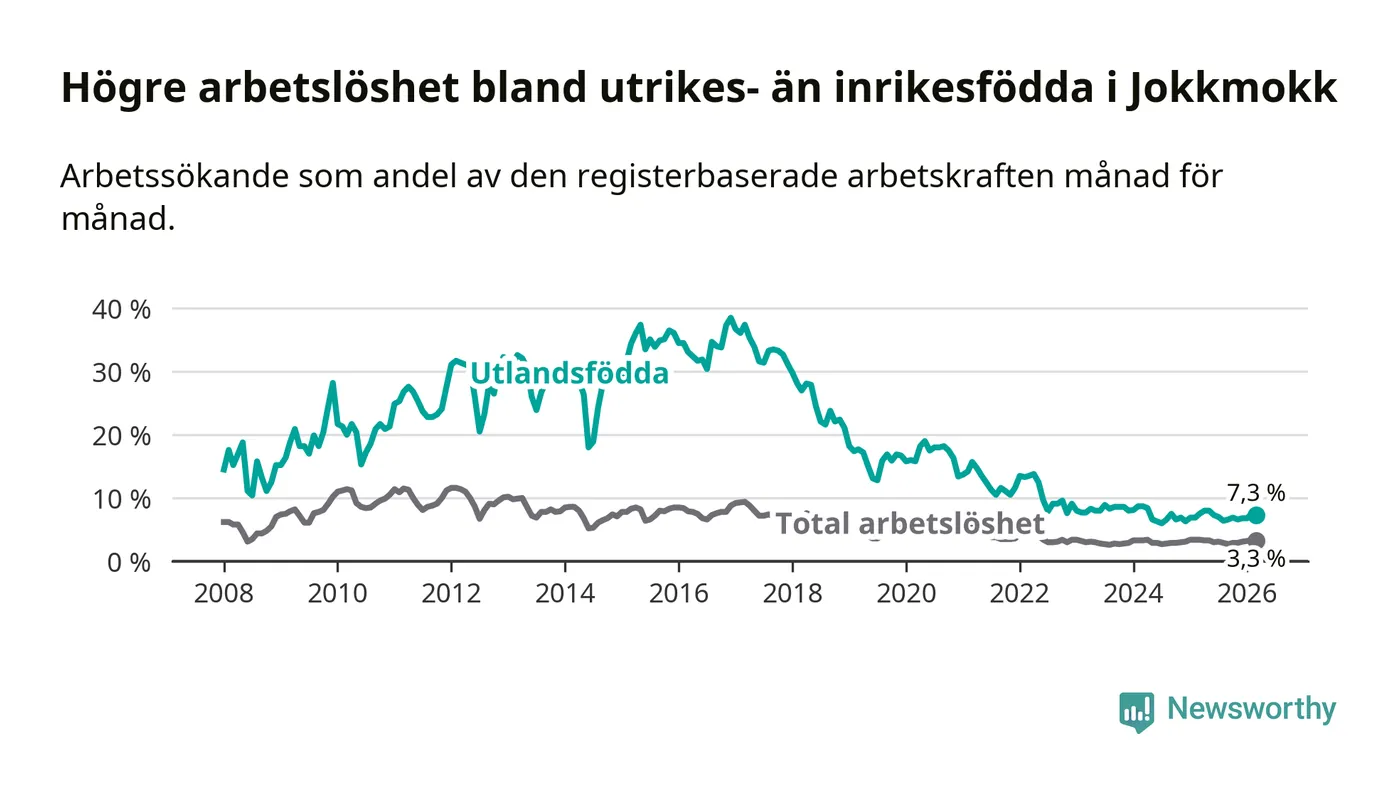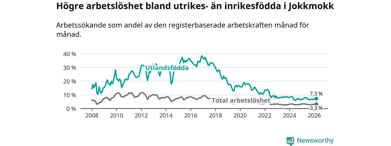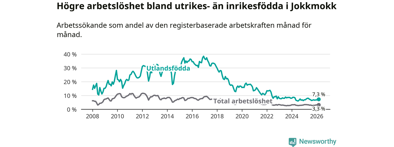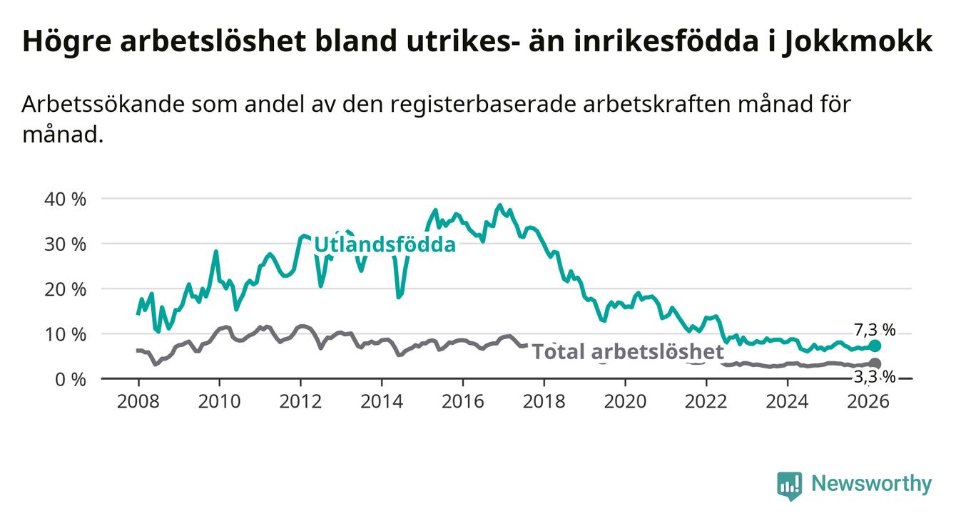 Arbetslösheten bland utlandsfödda var 7,3 procent i Jokkmokk under mars månad, motsvarande 26 av 356 personer. Det är 0,2 procentenheter färre än vid samma tidpunkt i fjol (+1 om man räknar personer). Den senaste månadens nedgång innebär ett trendbrott. Under de ett föregående månaderna hade arbetslösheten bland utlandsfödda varit högre än motsvarande tidpunkt året innan.
