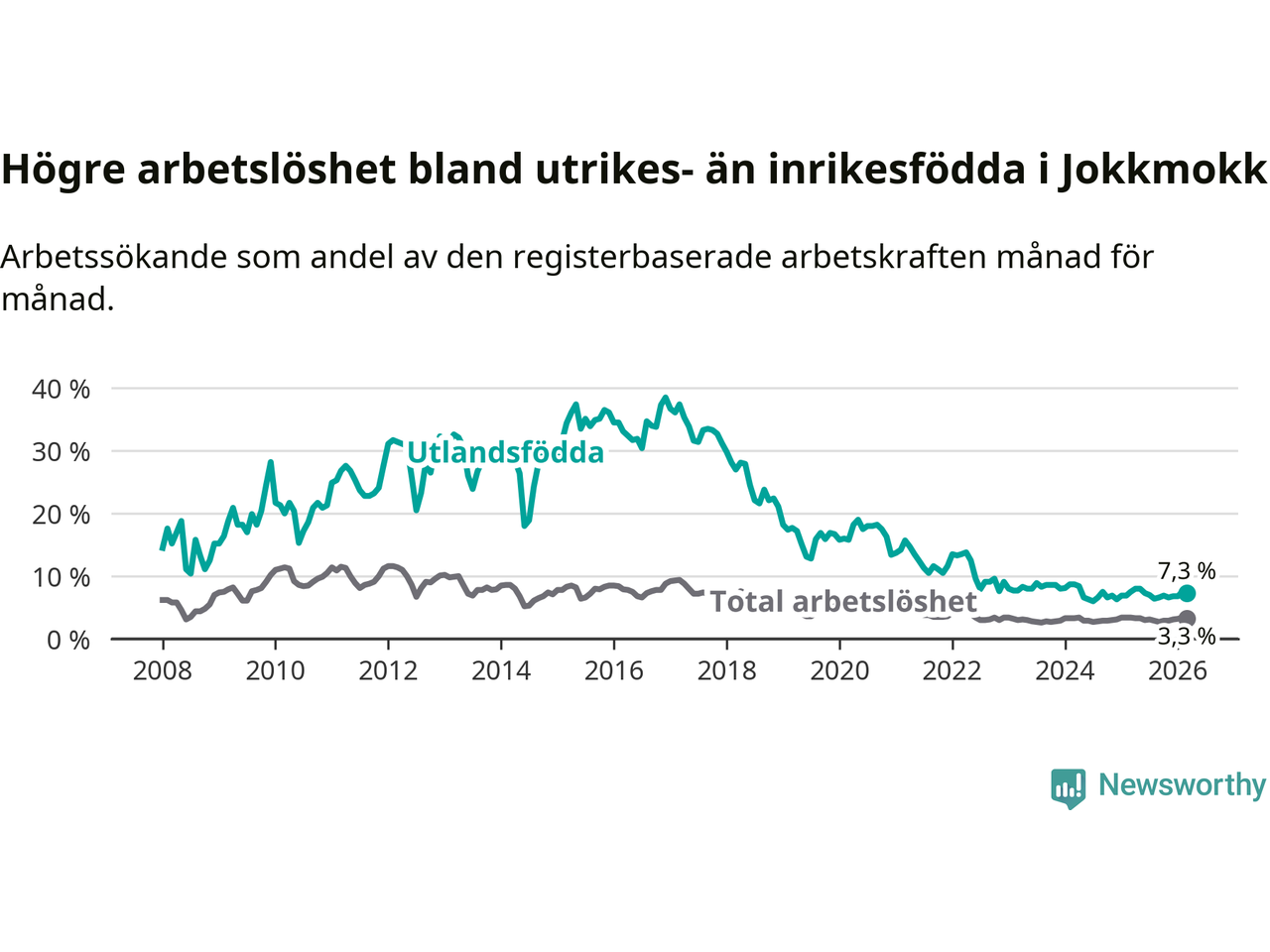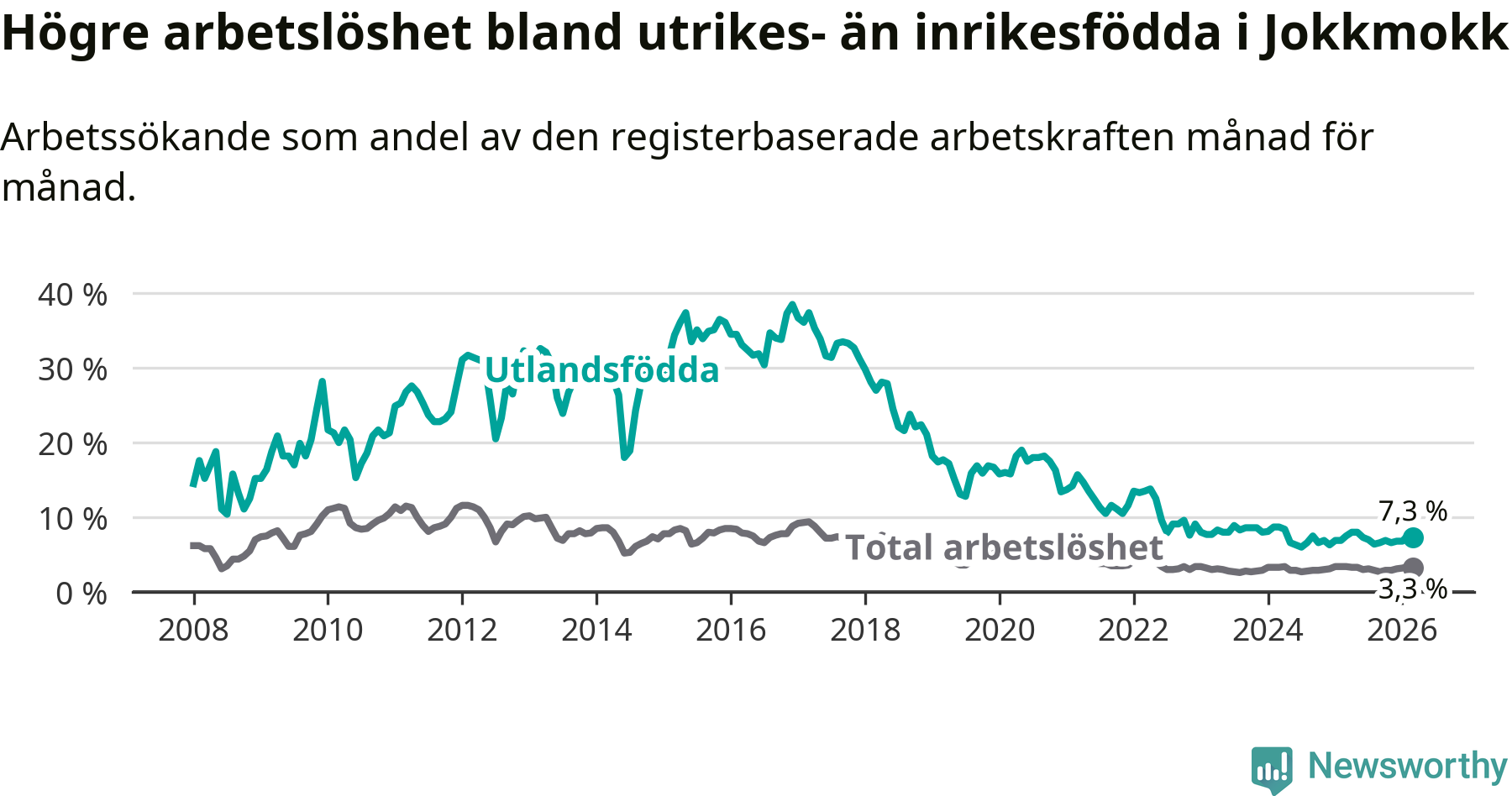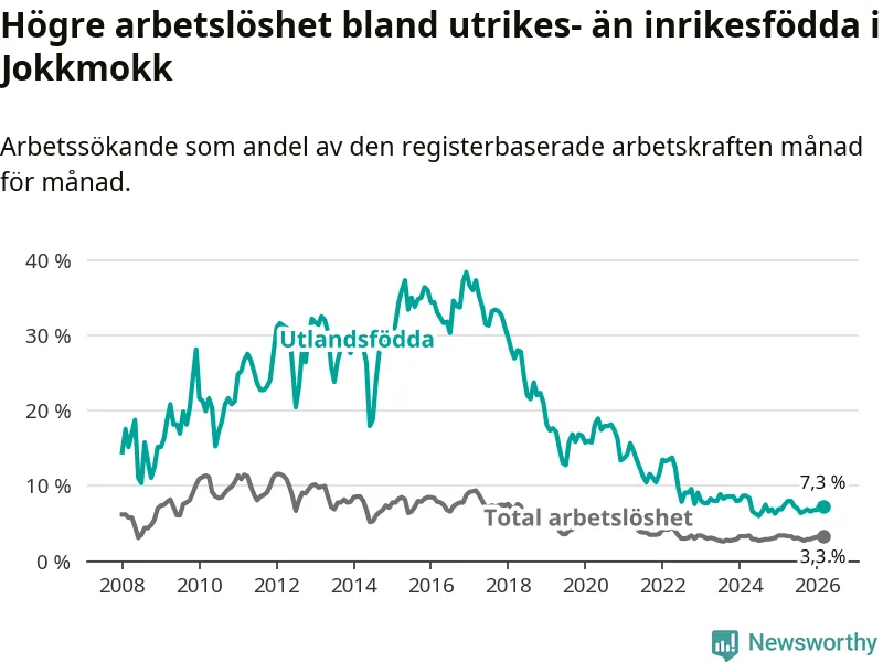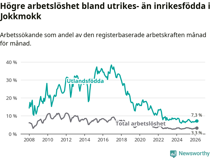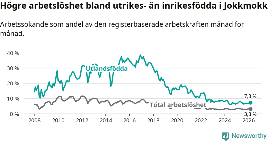 Arbetslösheten bland utlandsfödda var 7,3 procent i Jokkmokk under mars månad, motsvarande 26 av 356 personer. Det är 0,2 procentenheter färre än vid samma tidpunkt i fjol (+1 om man räknar personer). Den senaste månadens nedgång innebär ett trendbrott. Under de ett föregående månaderna hade arbetslösheten bland utlandsfödda varit högre än motsvarande tidpunkt året innan.