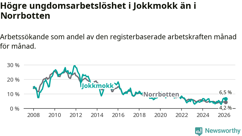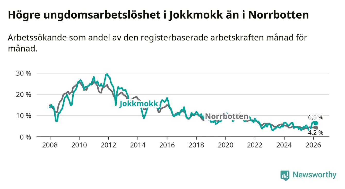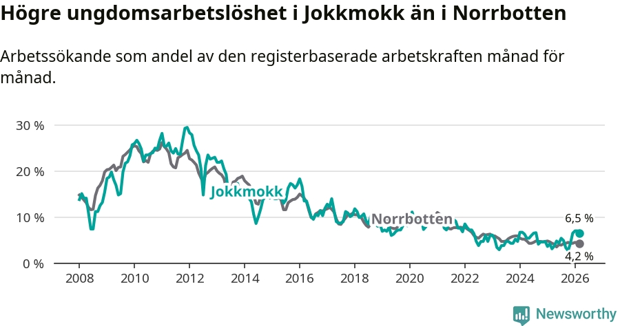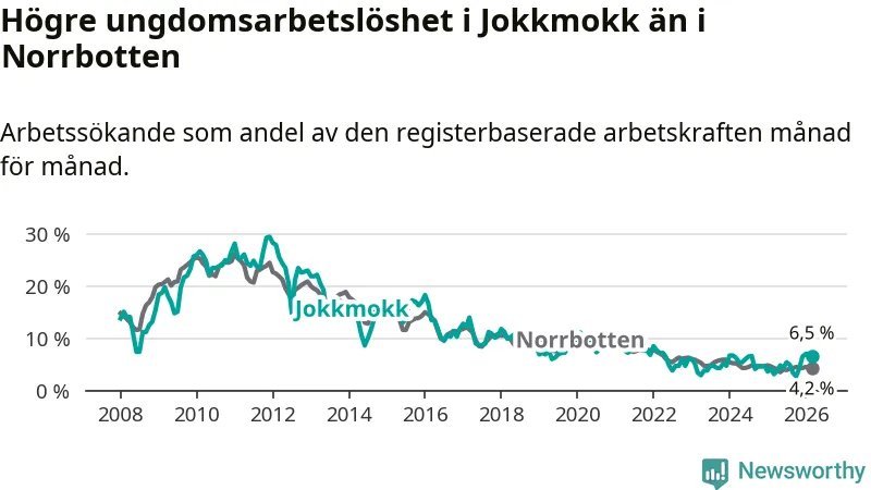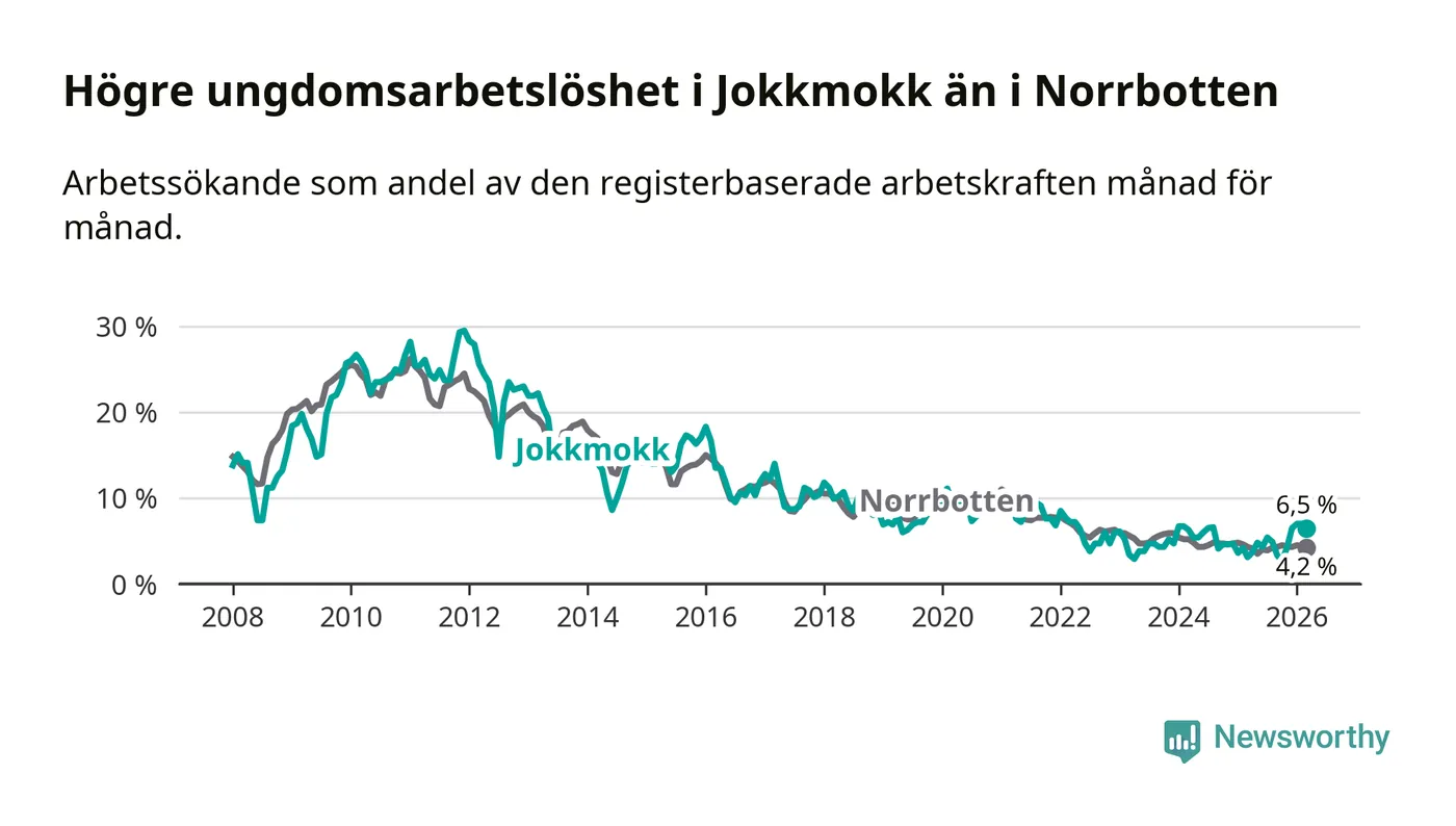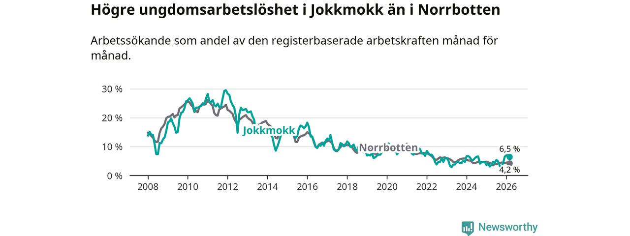 Medan Jokkmokk har lägre total arbetslöshet än Norrbotten, ligger ungdomsarbetslösheten 2,3 procentenheter högre i Jokkmokk.