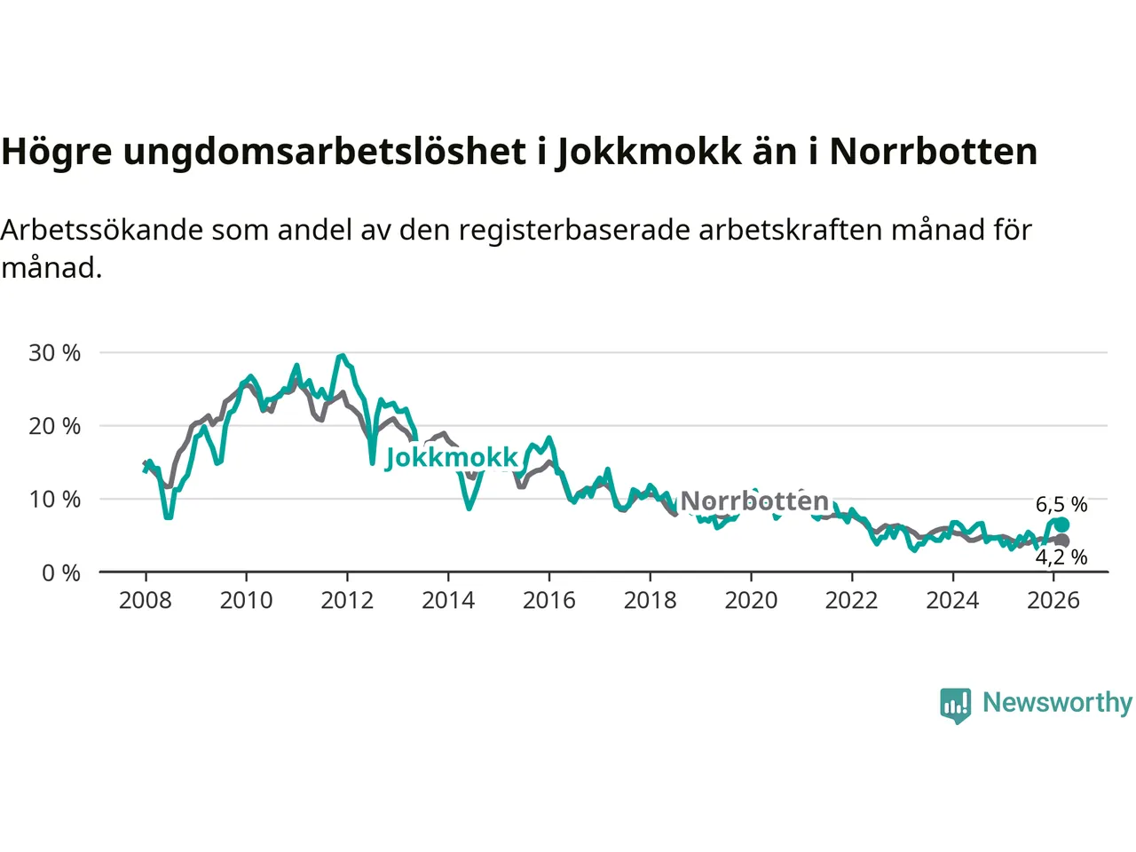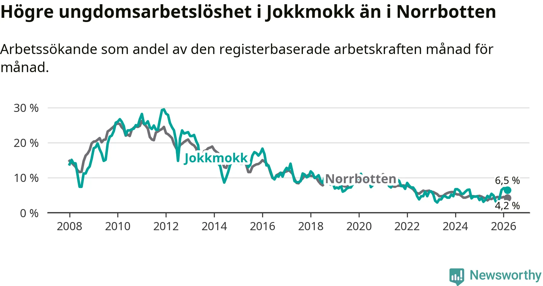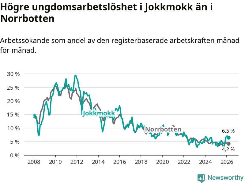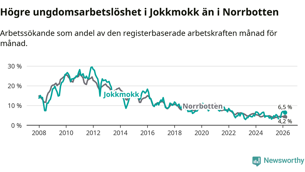 Medan Jokkmokk har lägre total arbetslöshet än Norrbotten, ligger ungdomsarbetslösheten 2,3 procentenheter högre i Jokkmokk.