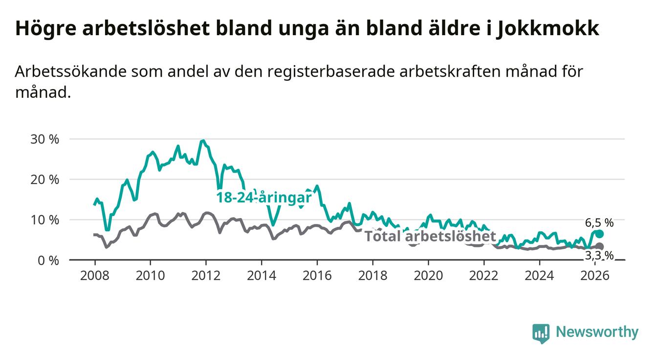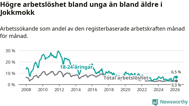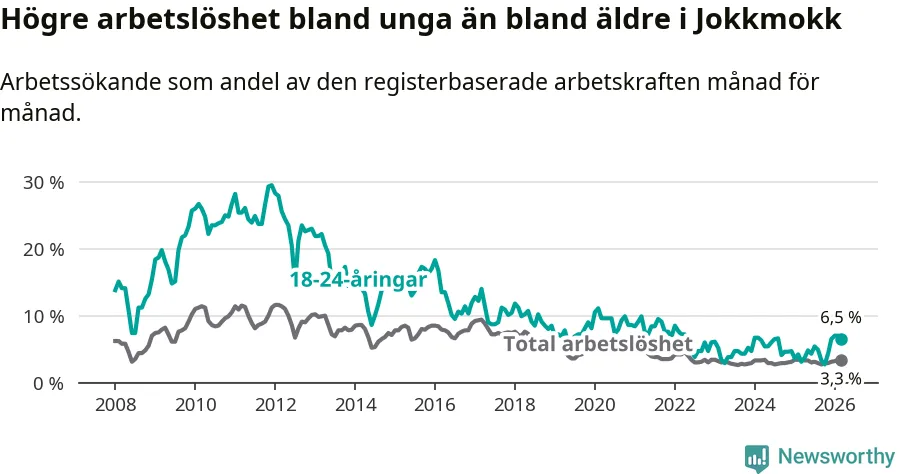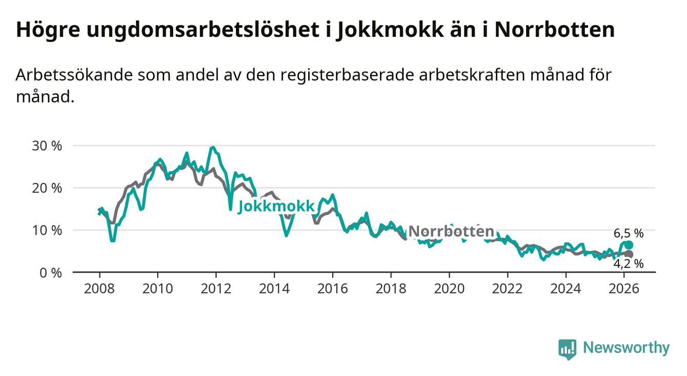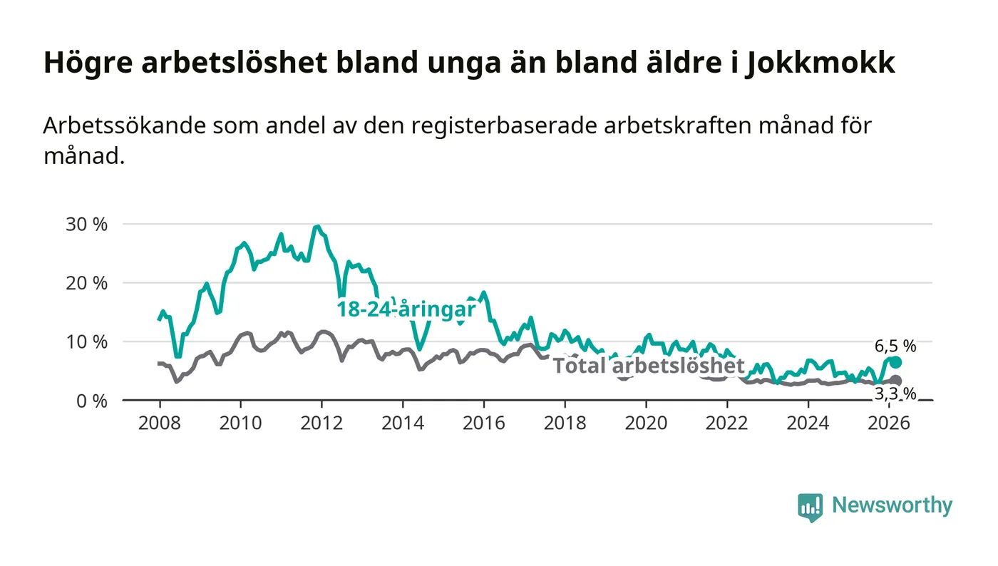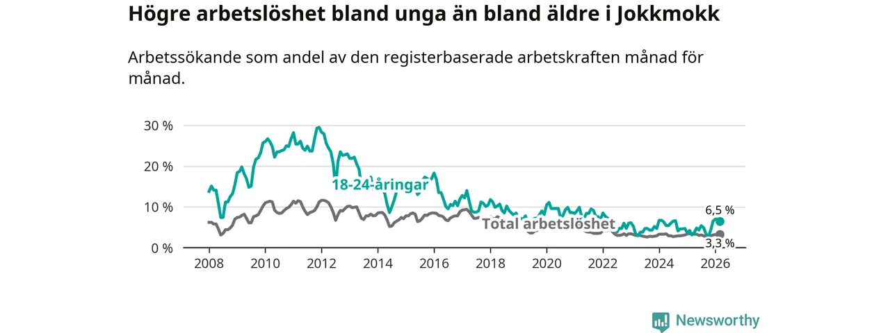 Den senaste månadsstatistiken från Arbetsförmedlingen visar på en uppgång i ungdomsarbetslöshet i Jokkmokks kommun med 3,4 procentenheter. Arbetslösheten bland personer i åldern 18–24 år låg i mars på 6,5 procent.