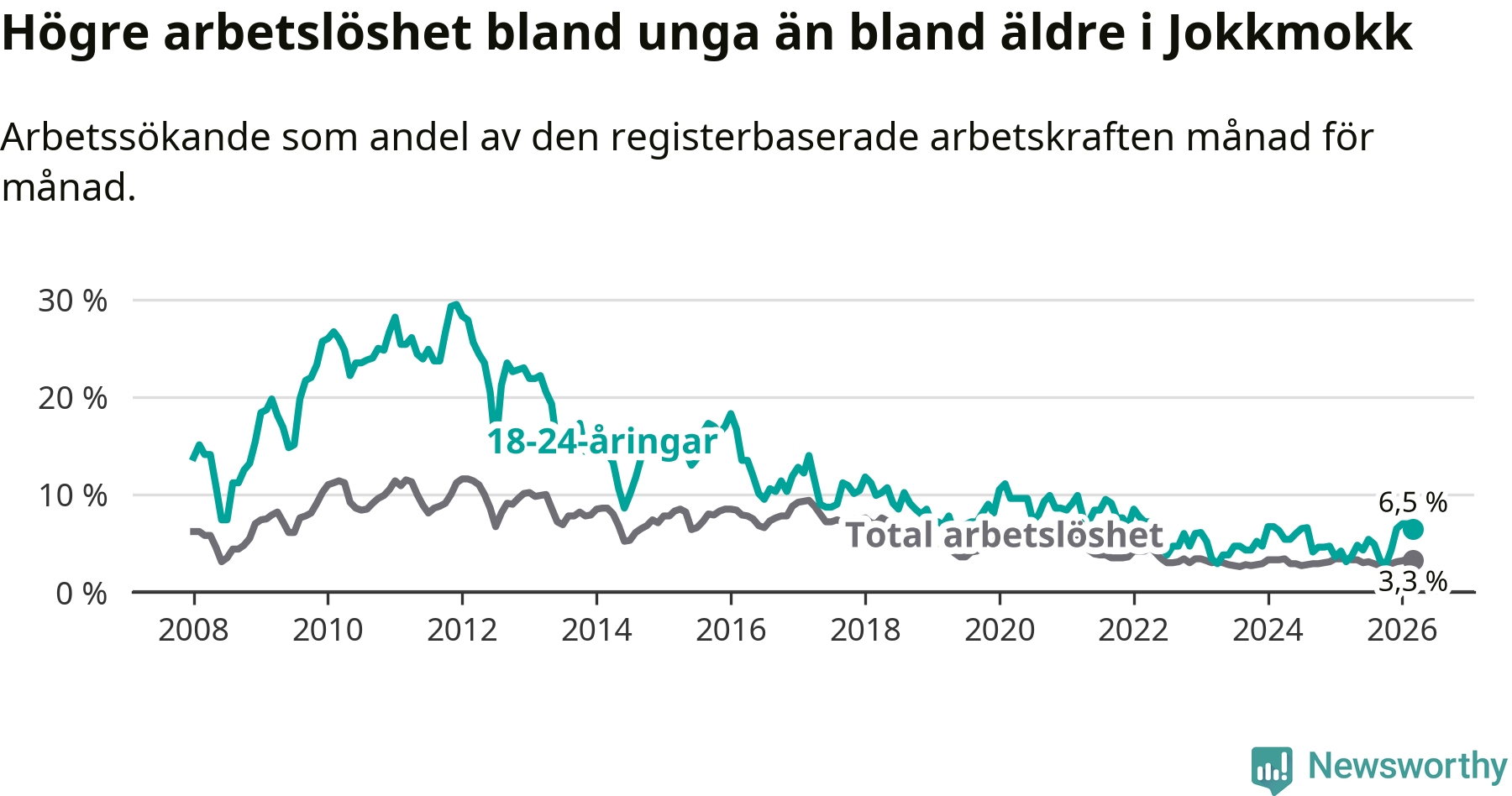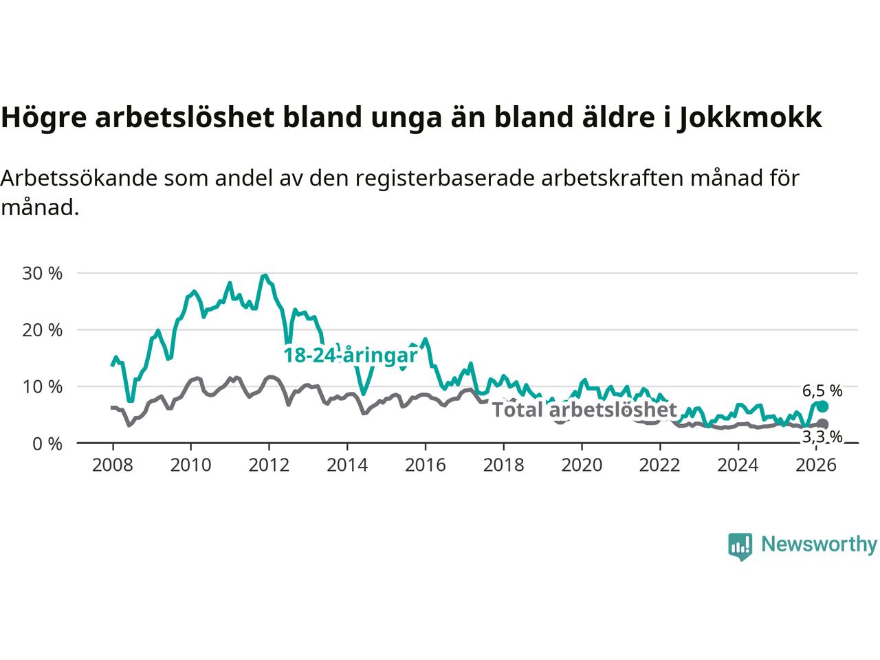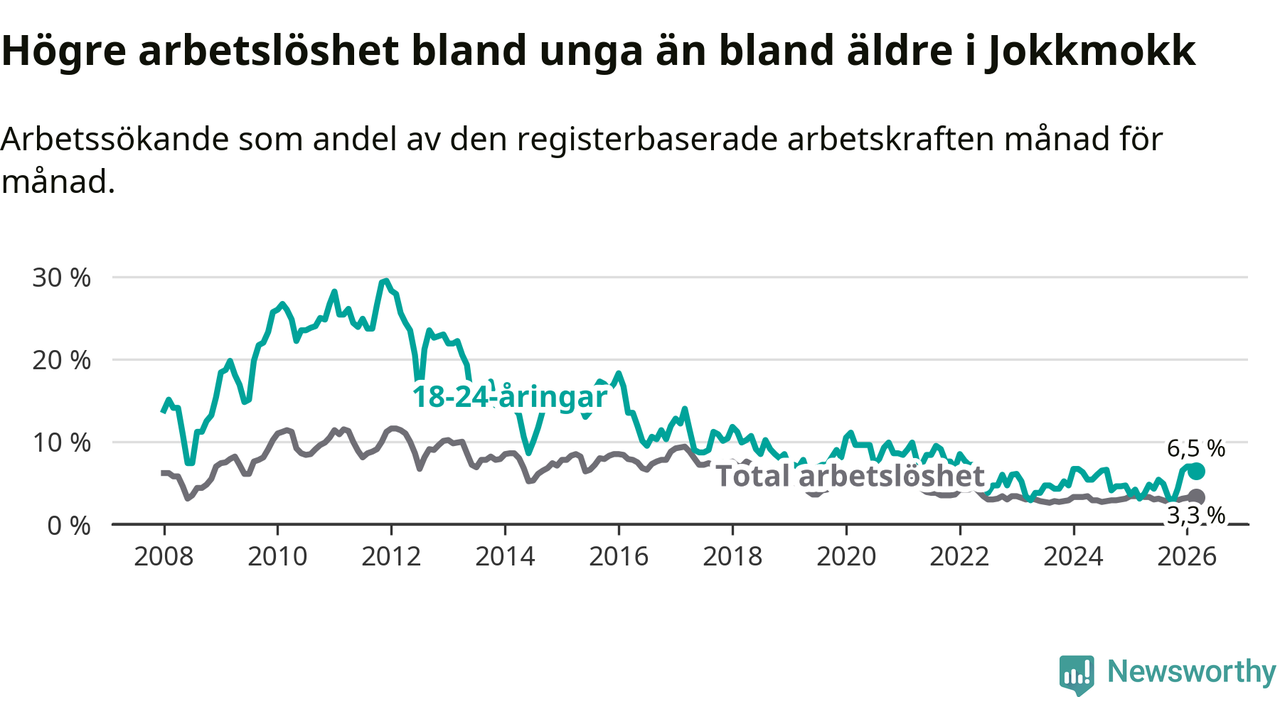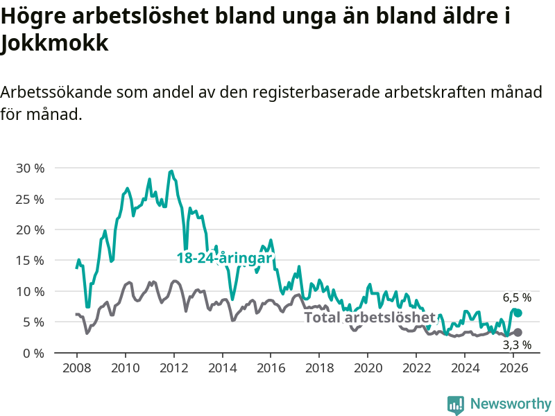 Den senaste månadsstatistiken från Arbetsförmedlingen visar på en uppgång i ungdomsarbetslöshet i Jokkmokks kommun med 3,4 procentenheter. Arbetslösheten bland personer i åldern 18–24 år låg i mars på 6,5 procent.