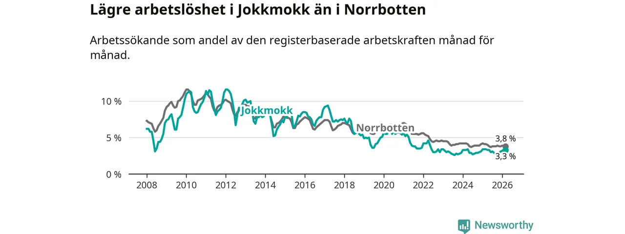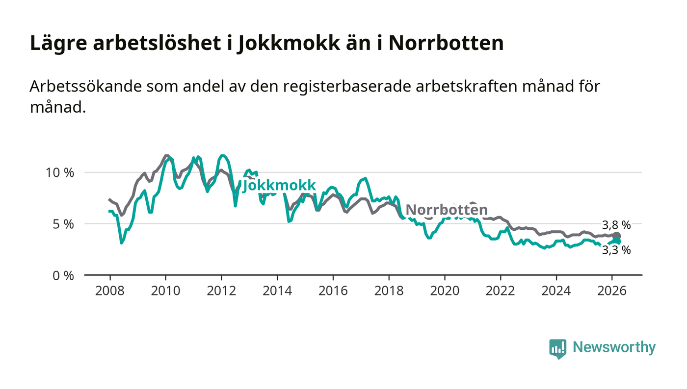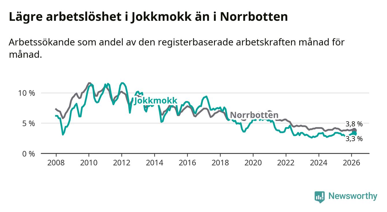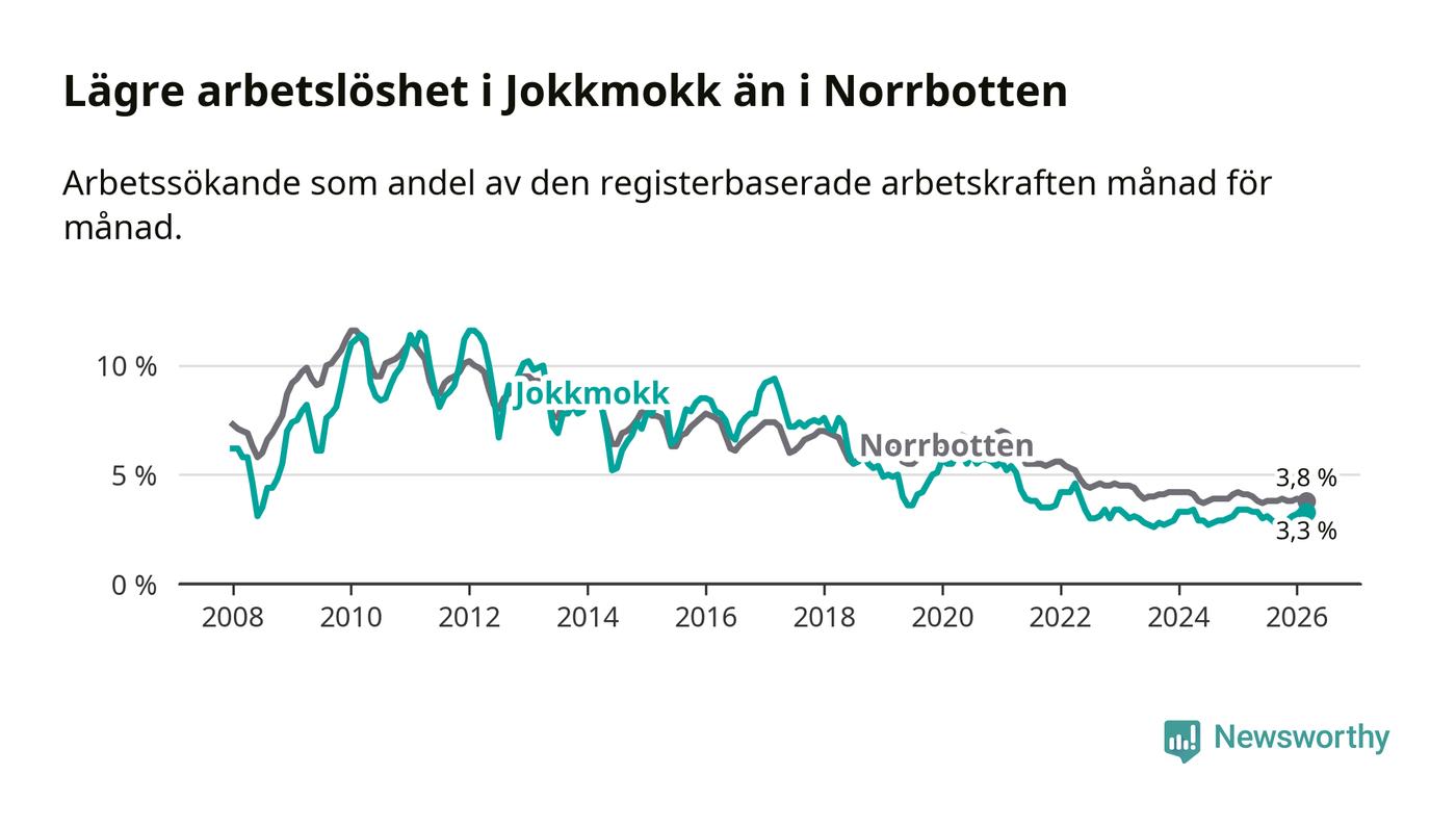 Under mars månad rapporterade Jokkmokks kommun en total arbetslöshet på 3,3 procent. Det är en minskning jämfört med samma tidpunkt i fjol (−0,1 procentenheter). Även i Norrbottens län sjunker arbetslösheten .