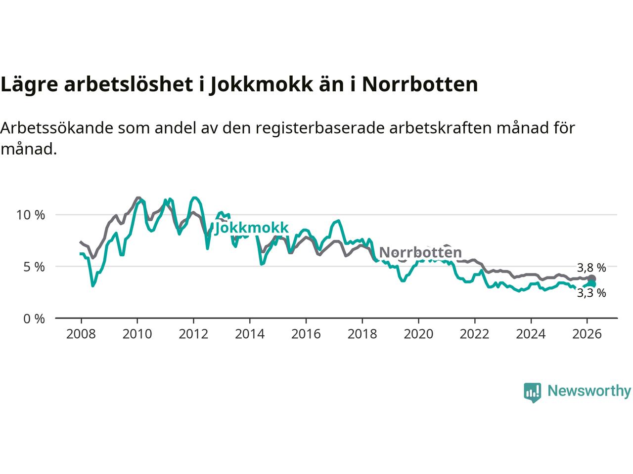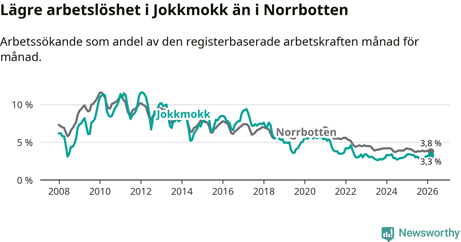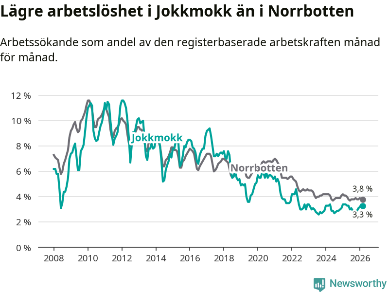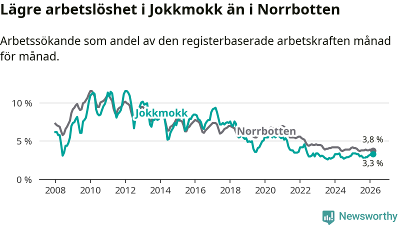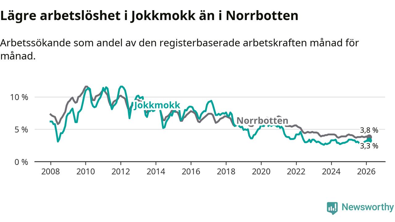 Under mars månad rapporterade Jokkmokks kommun en total arbetslöshet på 3,3 procent. Det är en minskning jämfört med samma tidpunkt i fjol (−0,1 procentenheter). Även i Norrbottens län sjunker arbetslösheten .