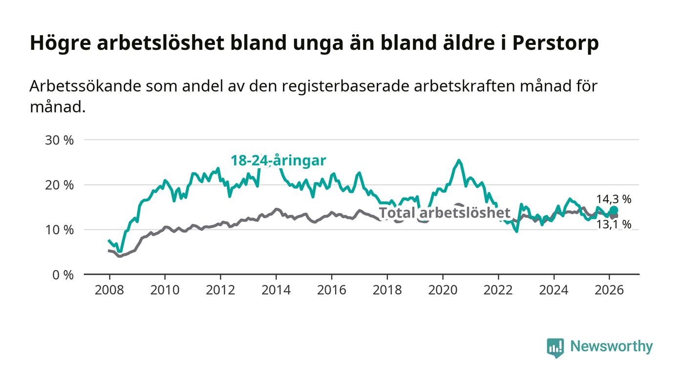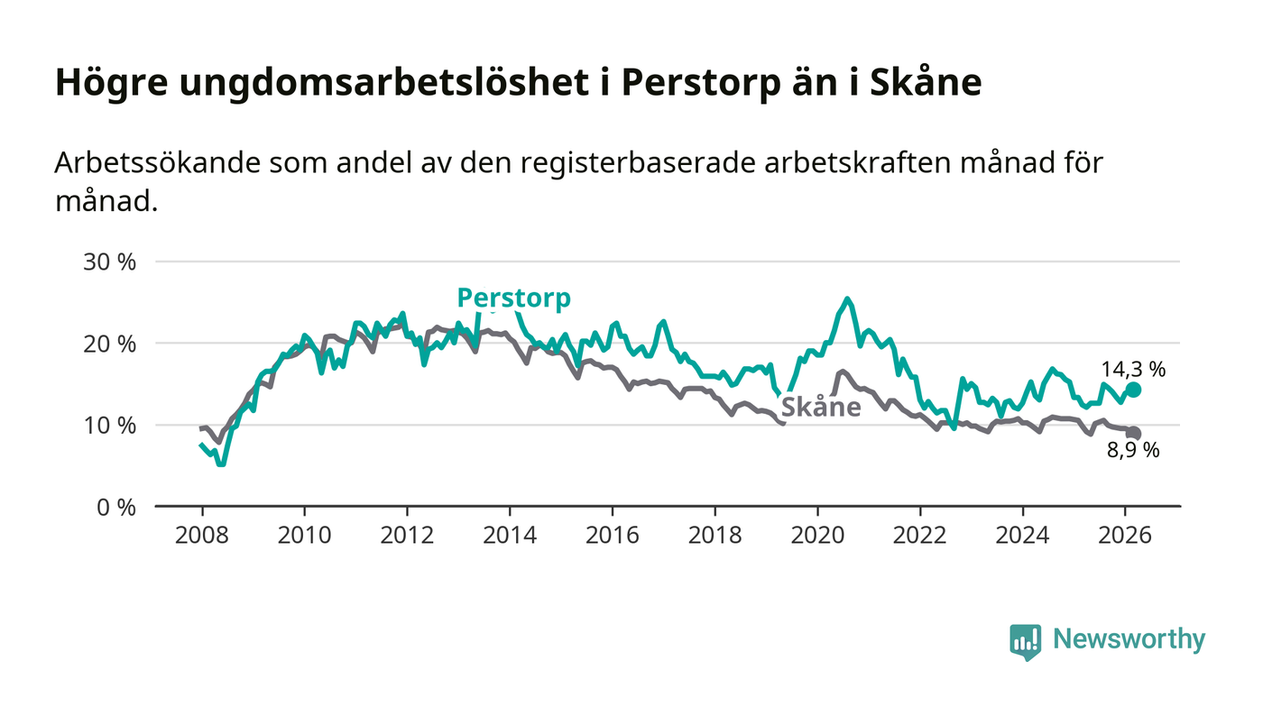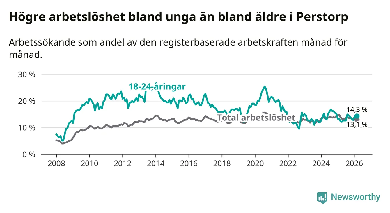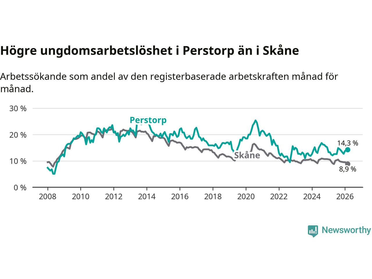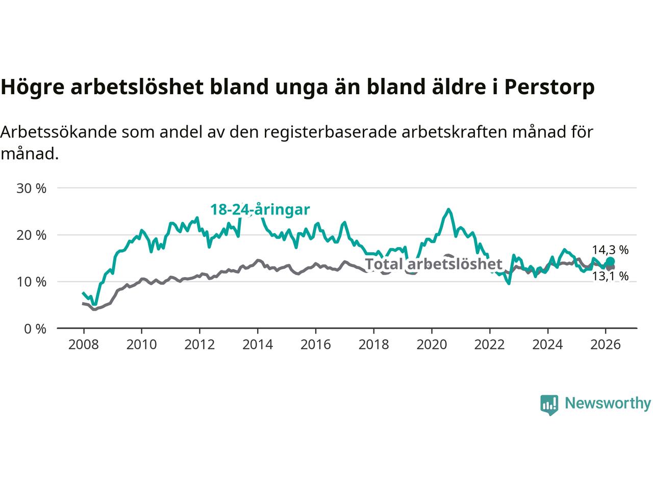 Den senaste månadsstatistiken från Arbetsförmedlingen visar på en uppgång i ungdomsarbetslöshet i Perstorps kommun med 1,9 procentenheter. Arbetslösheten bland personer i åldern 18–24 år låg i mars på 14,3 procent.