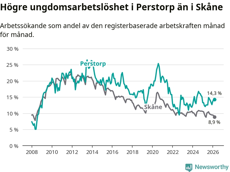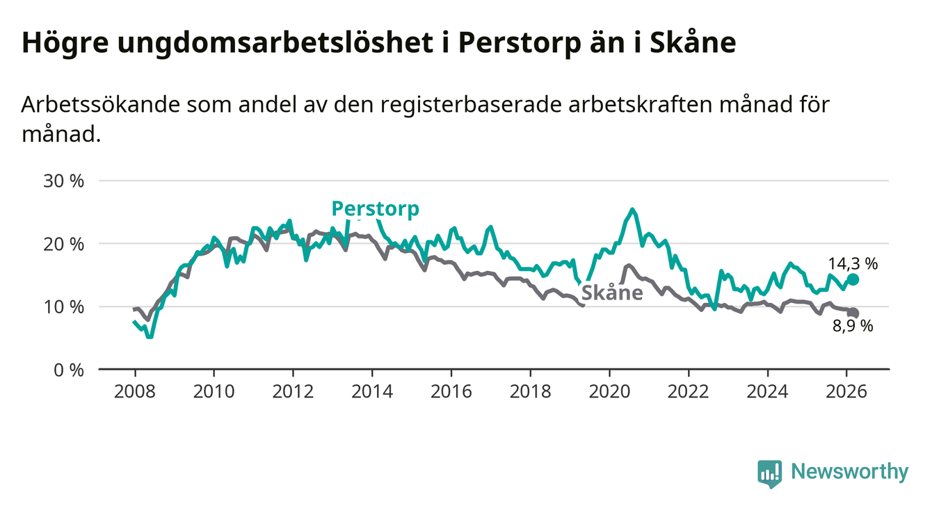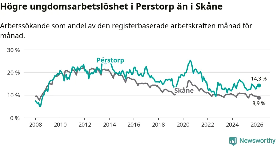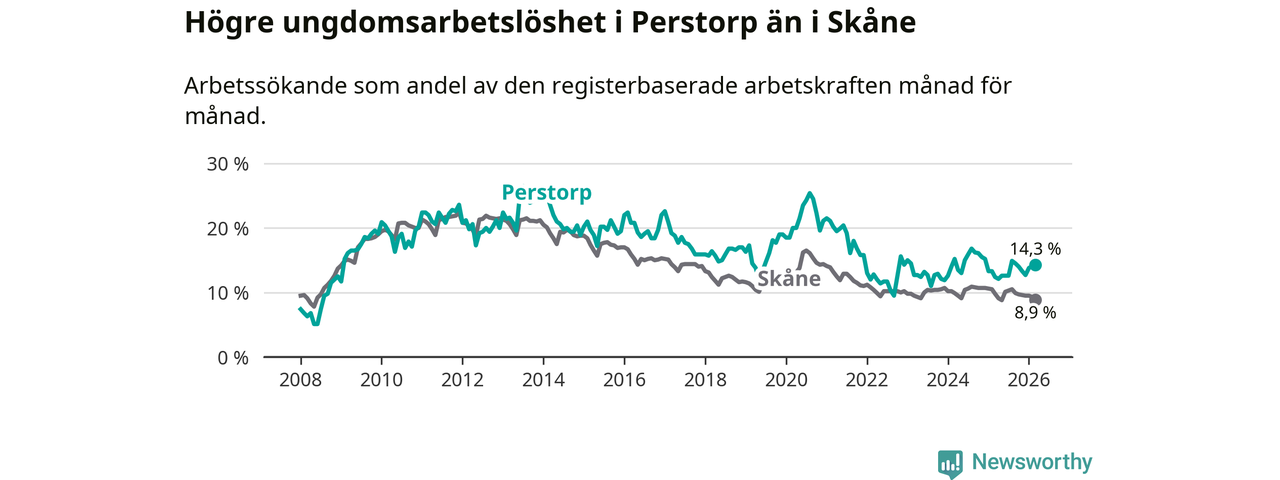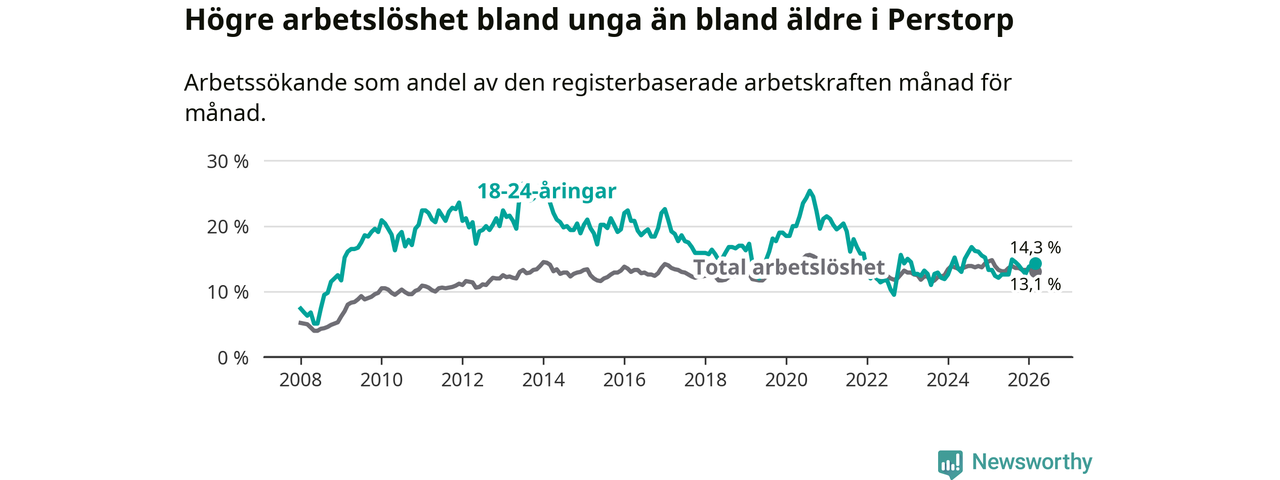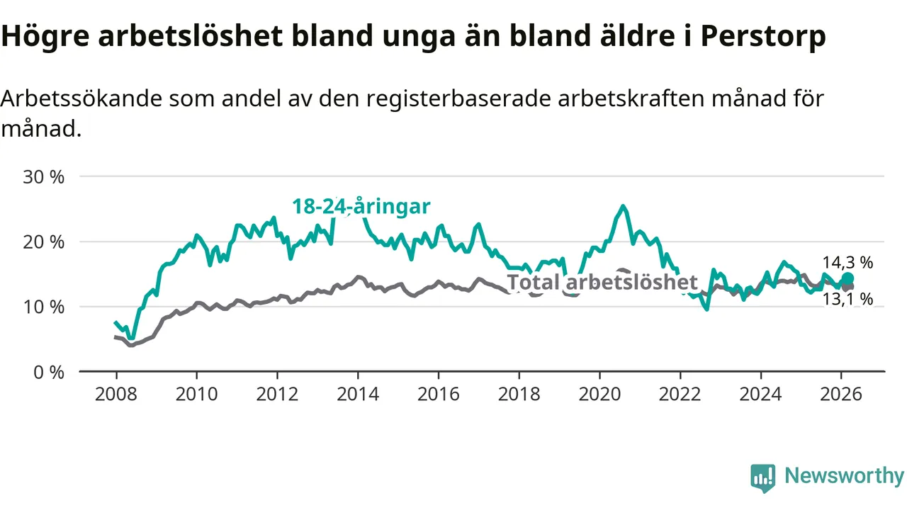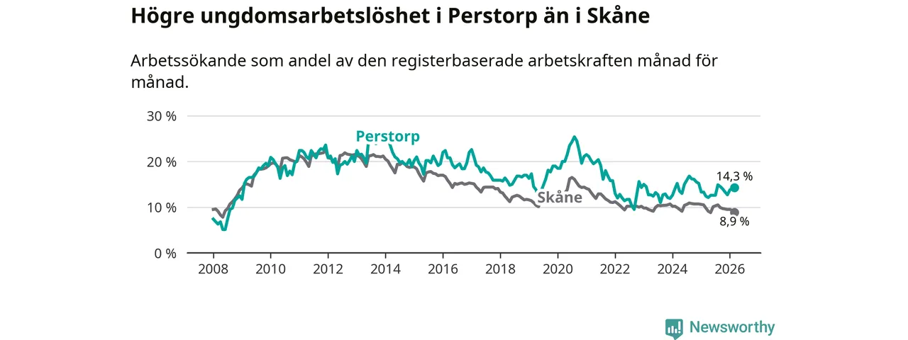 Den senaste månadsstatistiken från Arbetsförmedlingen visar på en uppgång i ungdomsarbetslöshet i Perstorps kommun med 1,9 procentenheter. Arbetslösheten bland personer i åldern 18–24 år låg i mars på 14,3 procent.
