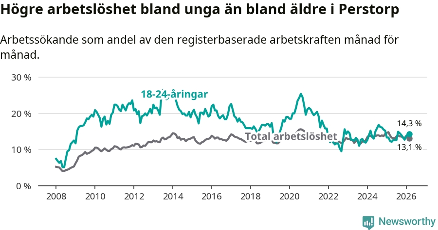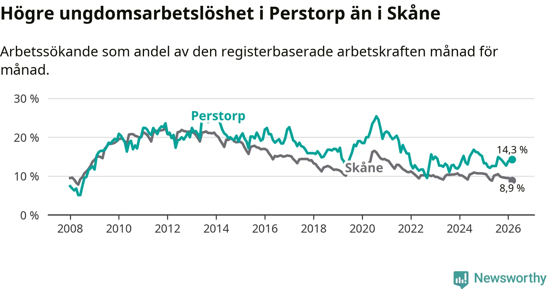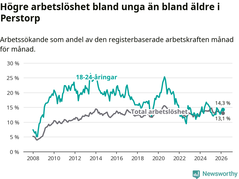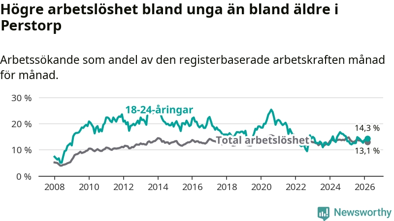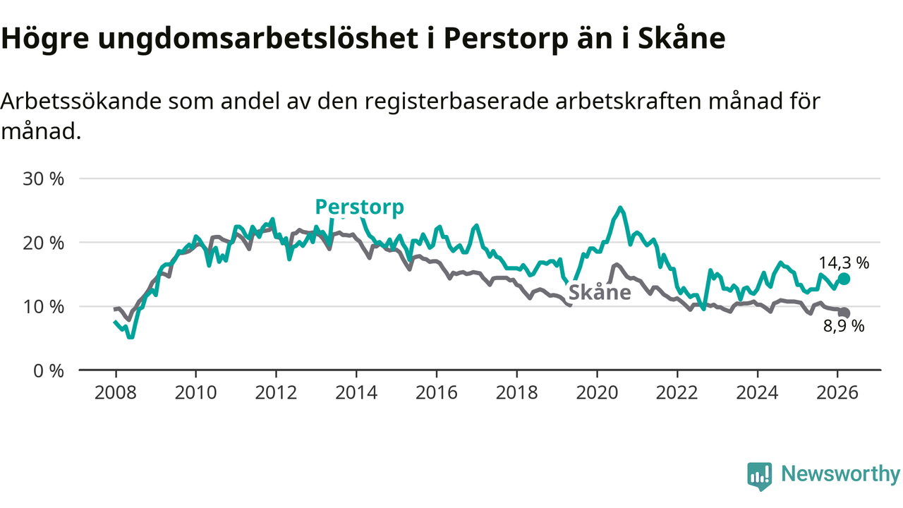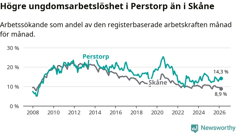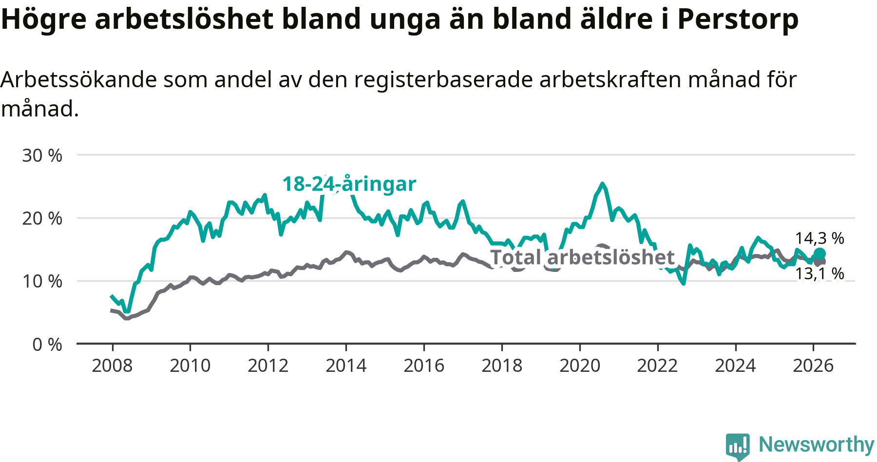 Den senaste månadsstatistiken från Arbetsförmedlingen visar på en uppgång i ungdomsarbetslöshet i Perstorps kommun med 1,9 procentenheter. Arbetslösheten bland personer i åldern 18–24 år låg i mars på 14,3 procent.