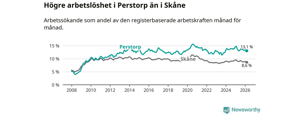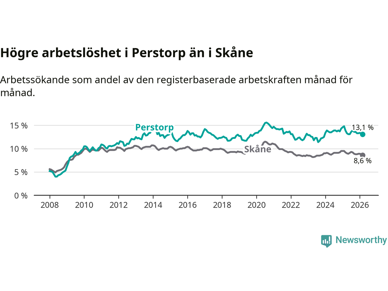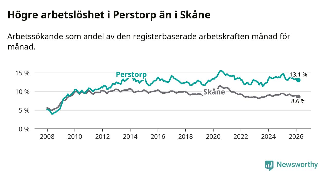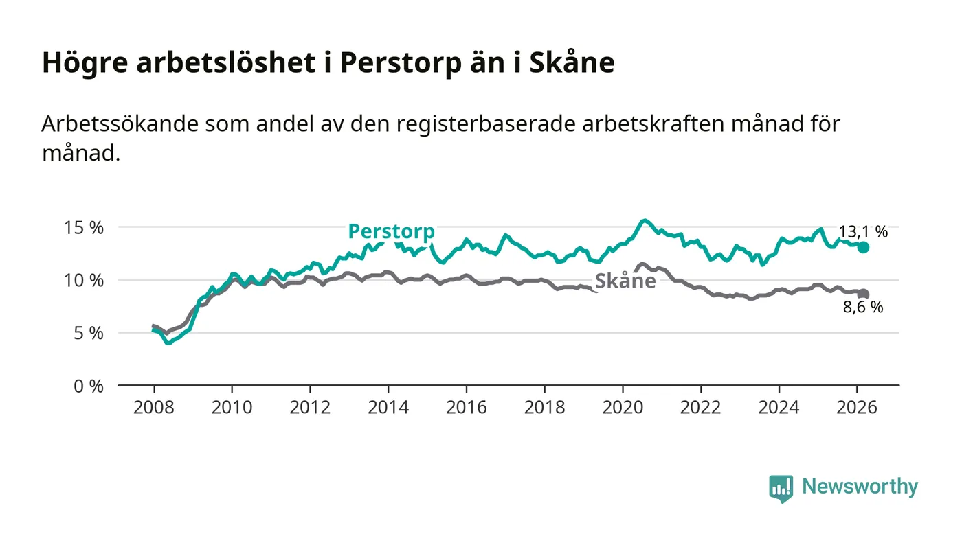 Under mars månad rapporterade Perstorps kommun en total arbetslöshet på 13,1 procent. Det är en minskning jämfört med samma tidpunkt i fjol (−0,8 procentenheter). Även i Skåne län sjunker arbetslösheten .