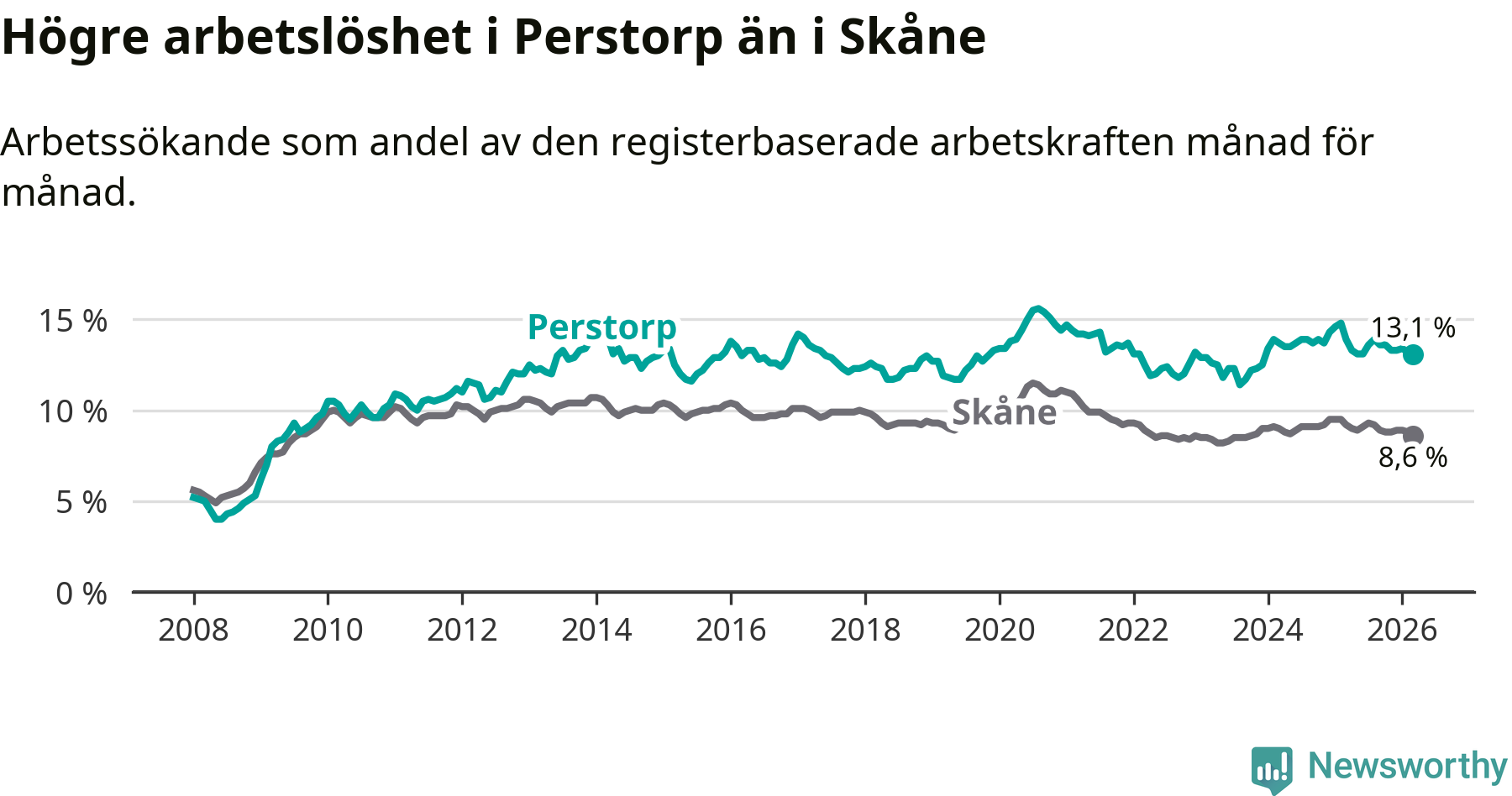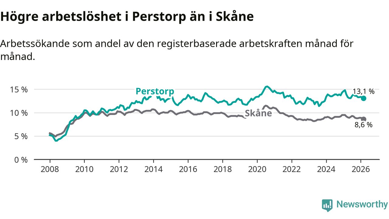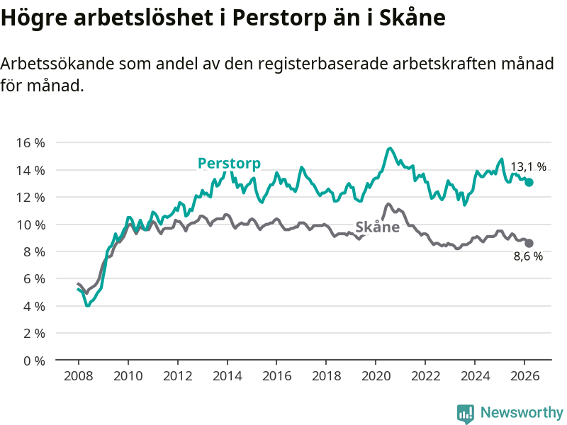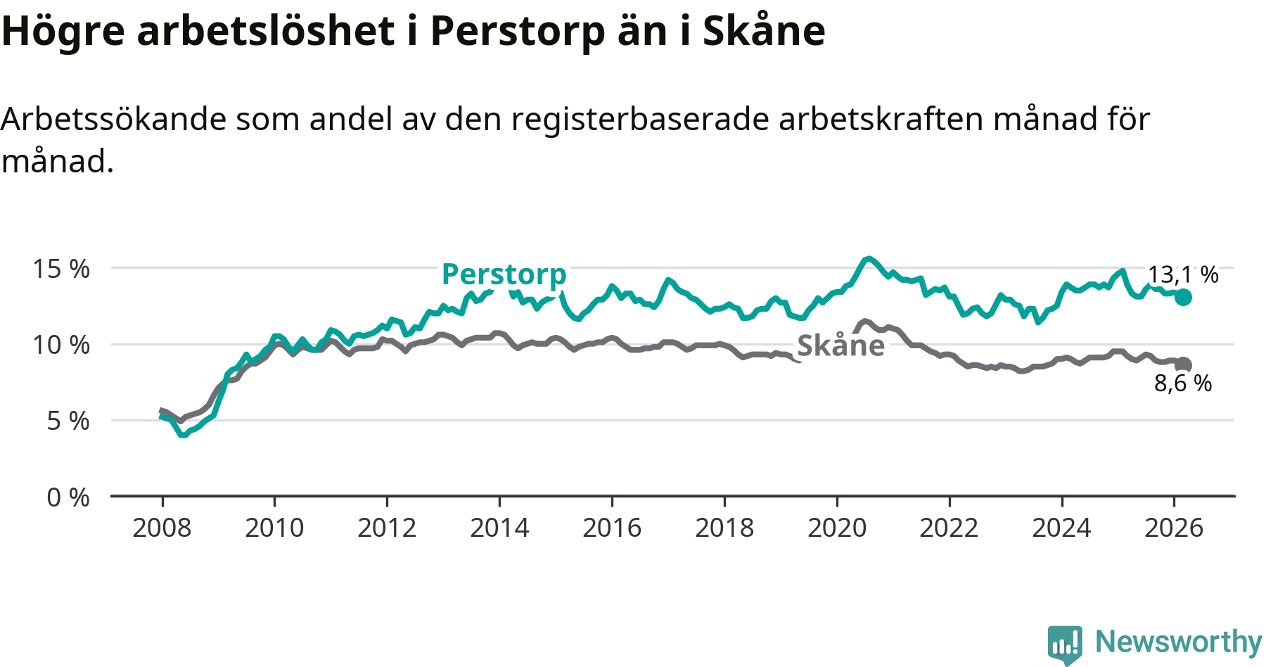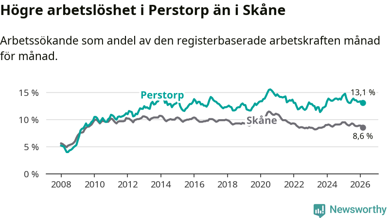 Under mars månad rapporterade Perstorps kommun en total arbetslöshet på 13,1 procent. Det är en minskning jämfört med samma tidpunkt i fjol (−0,8 procentenheter). Även i Skåne län sjunker arbetslösheten .