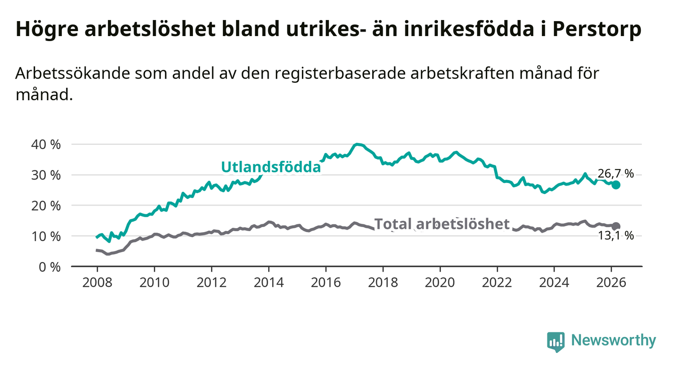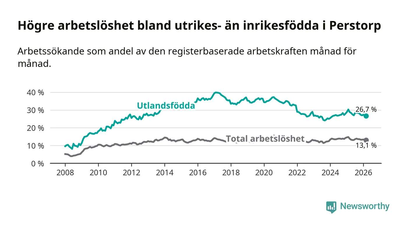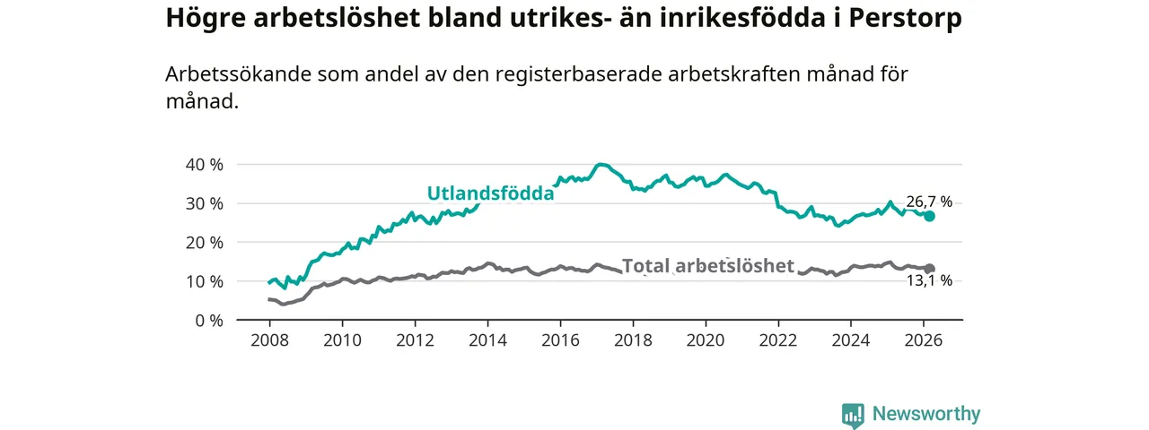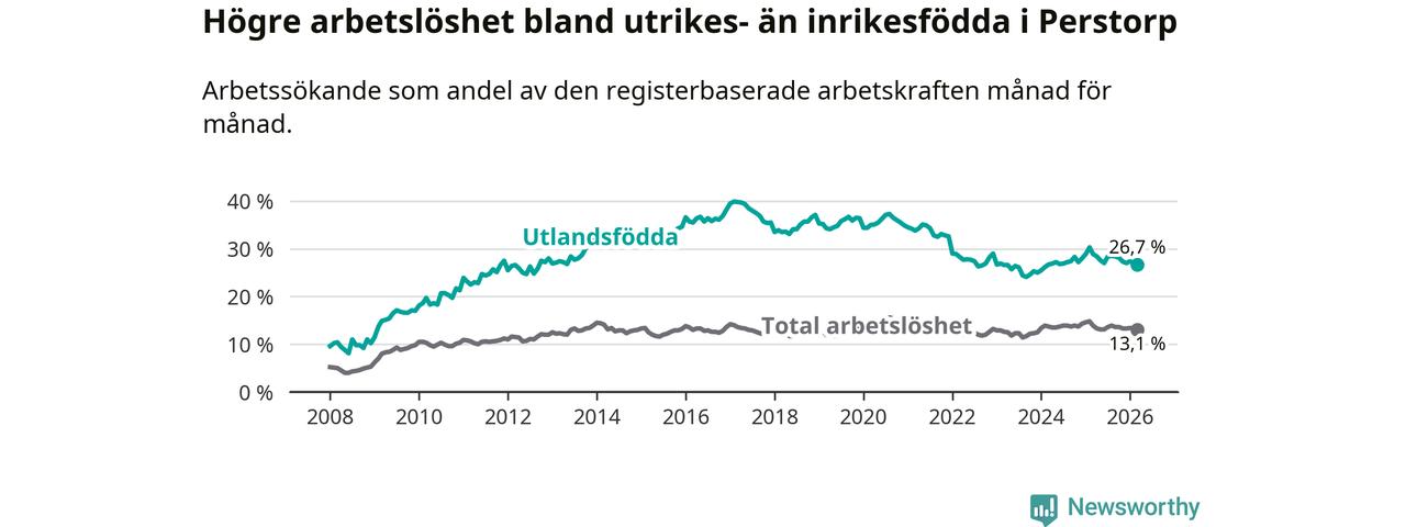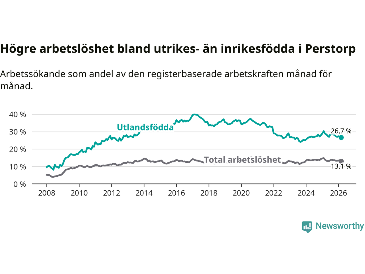 Skillnaden i arbetslöshet mellan utrikesfödda och hela befolkningen är 13,6 procentenheter i Perstorp. Det är en mindre skillnad än för ett år sedan (−1,4 procentenheter).