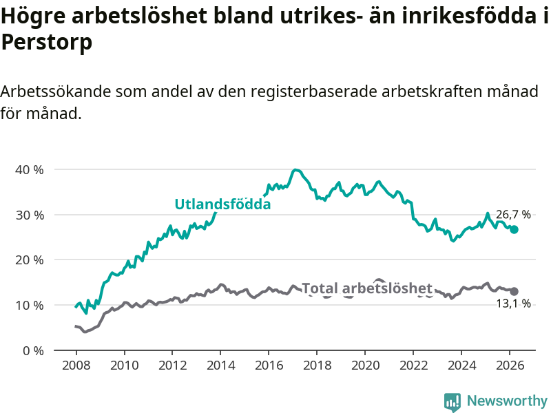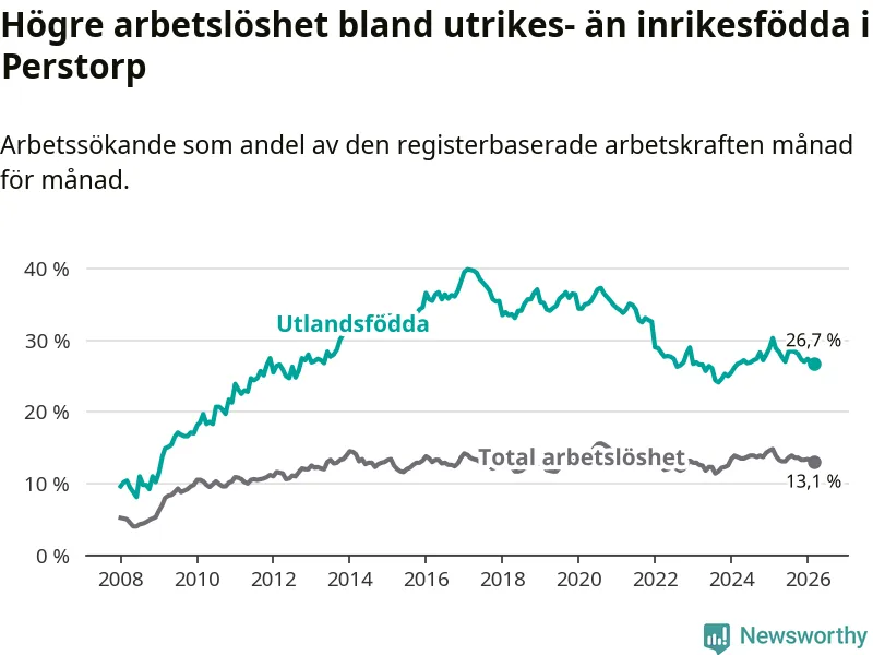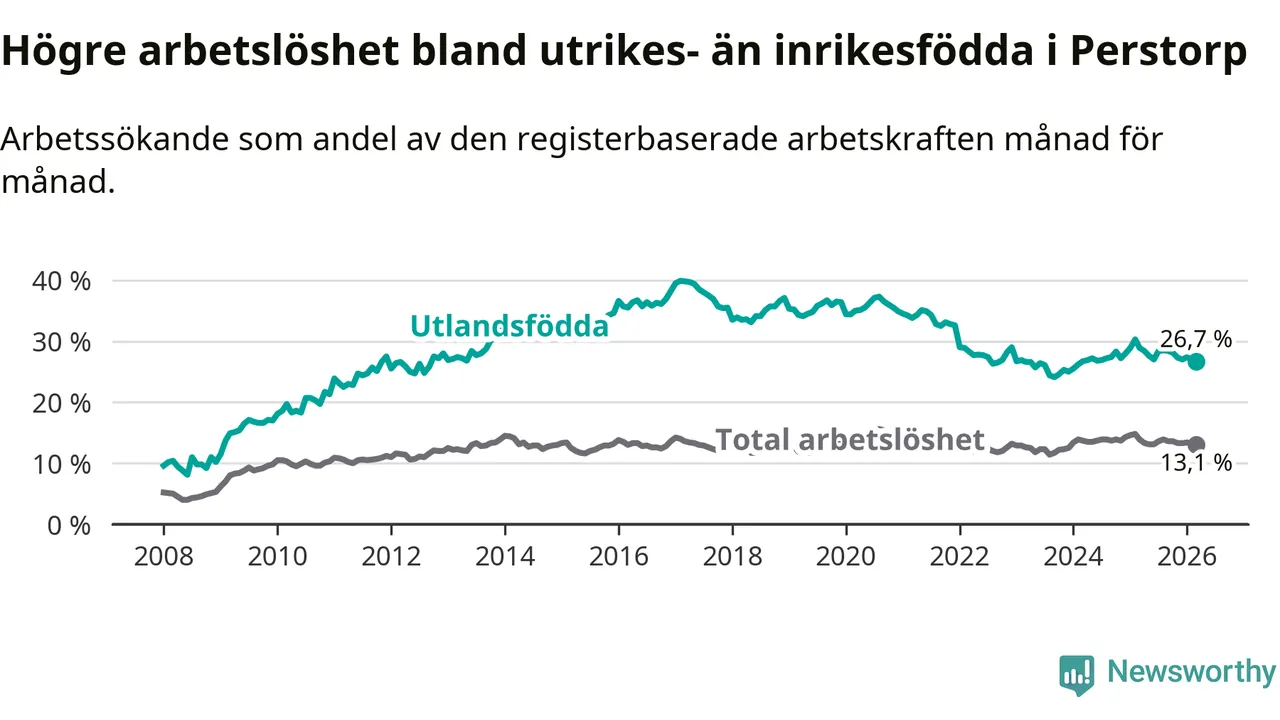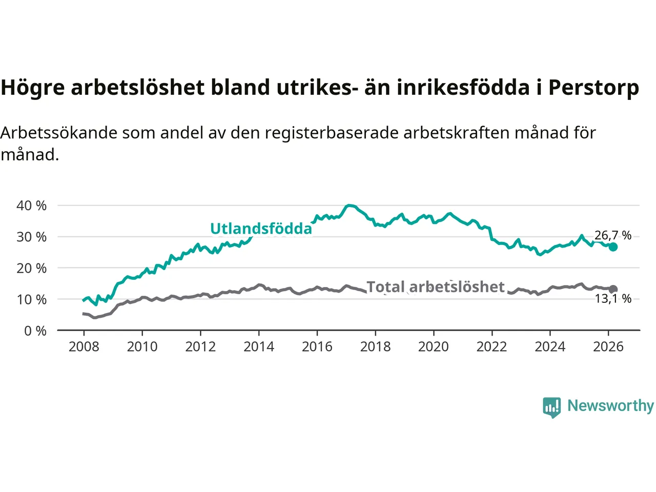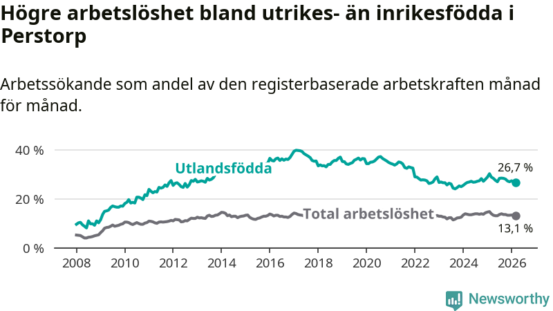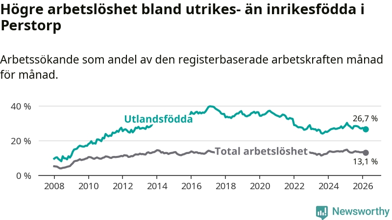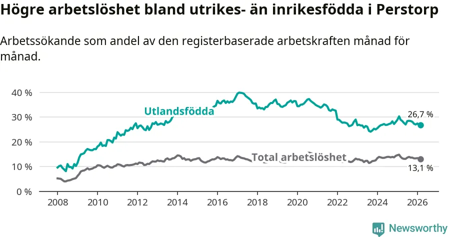 Skillnaden i arbetslöshet mellan utrikesfödda och hela befolkningen är 13,6 procentenheter i Perstorp. Det är en mindre skillnad än för ett år sedan (−1,4 procentenheter).