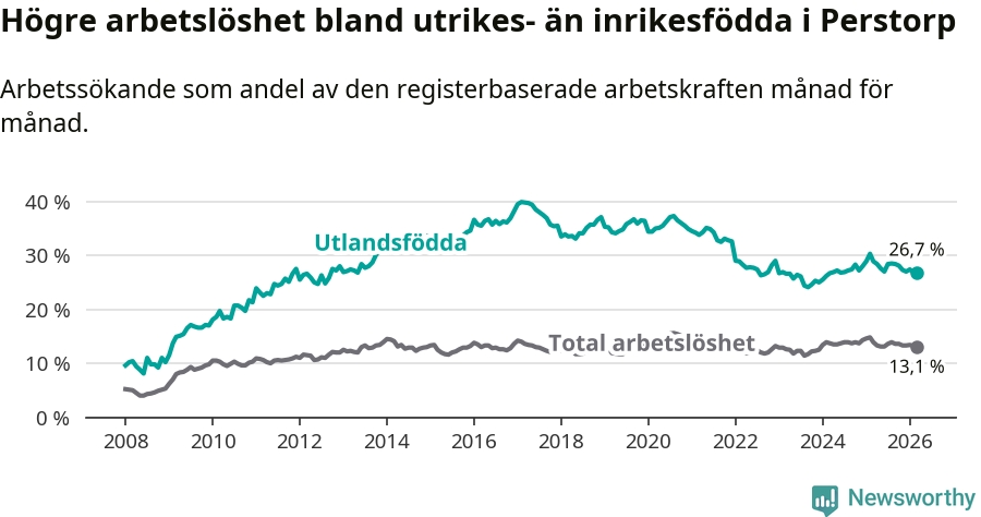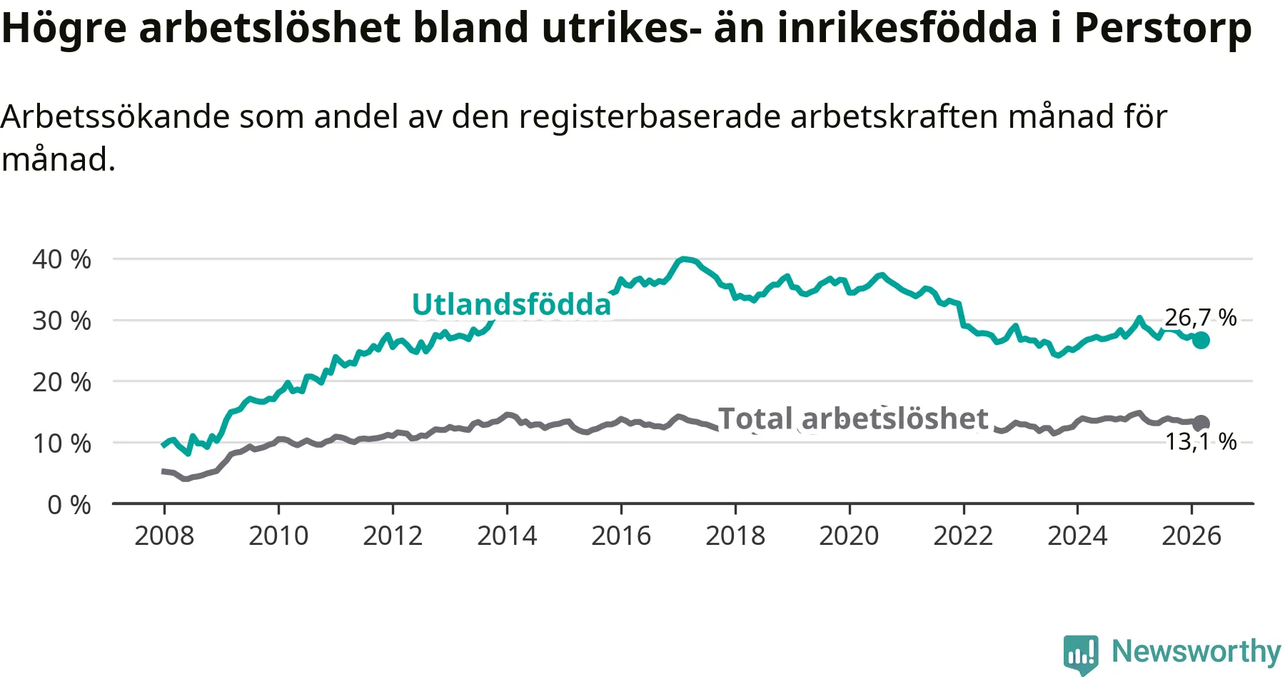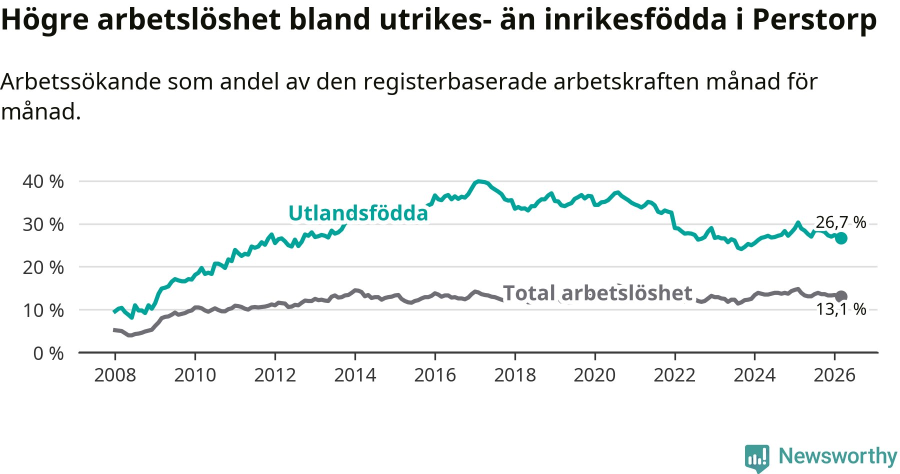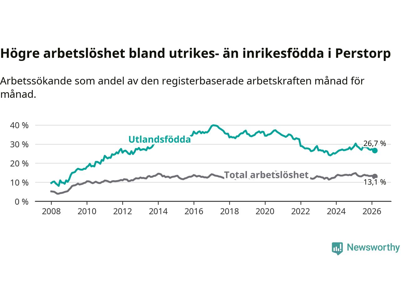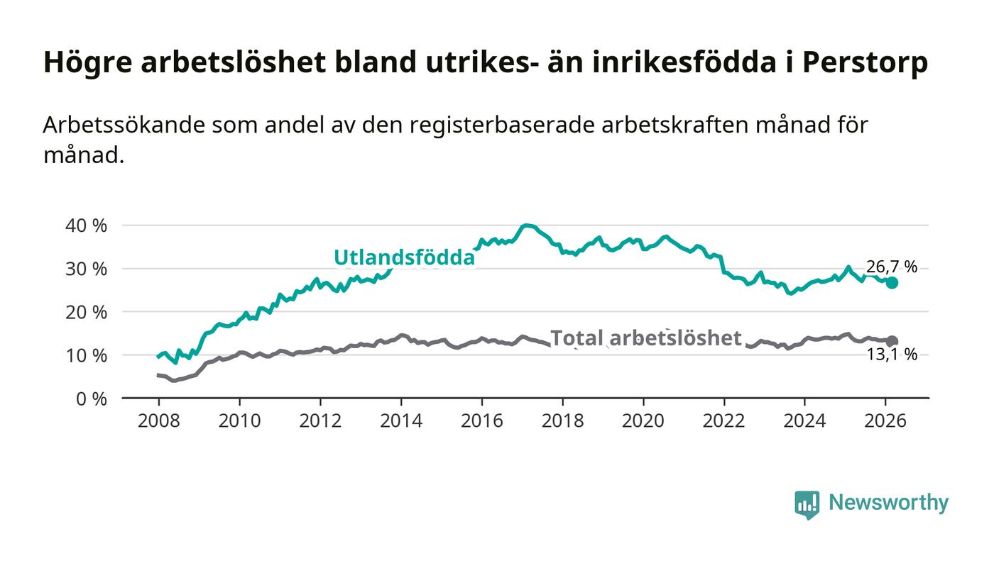 Arbetslösheten bland utlandsfödda var 26,7 procent i Perstorp under mars månad, motsvarande 272 av 1 019 personer. Det är 2,2 procentenheter färre än vid samma tidpunkt i fjol (−15 om man räknar personer).