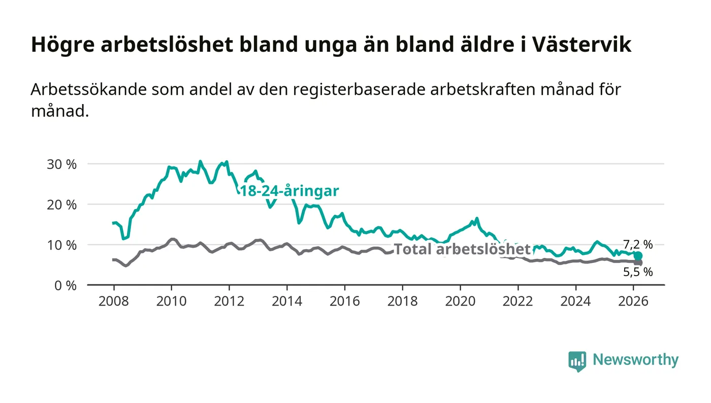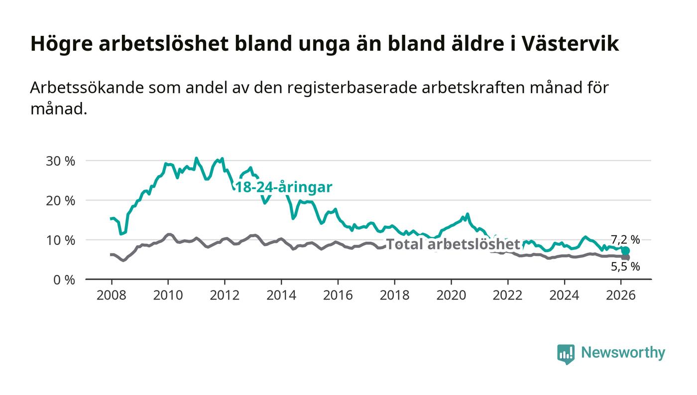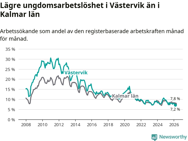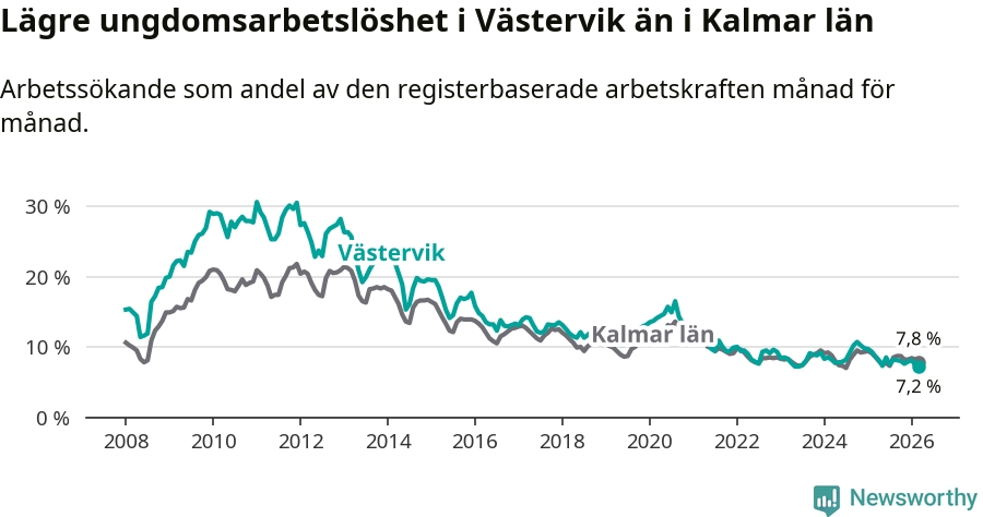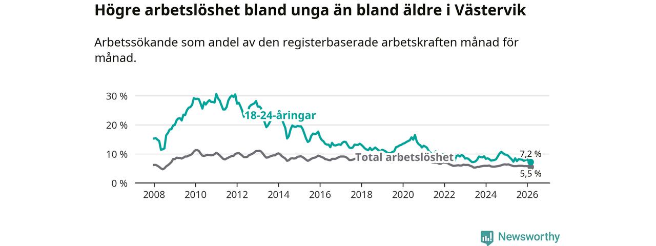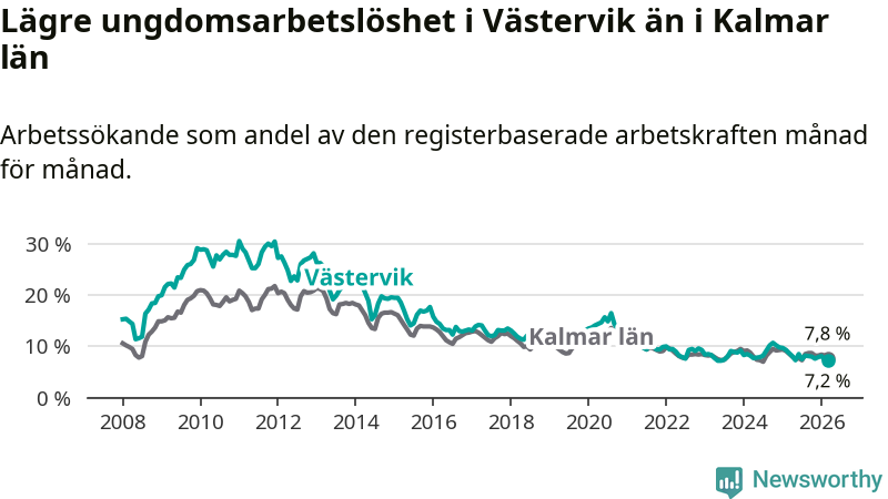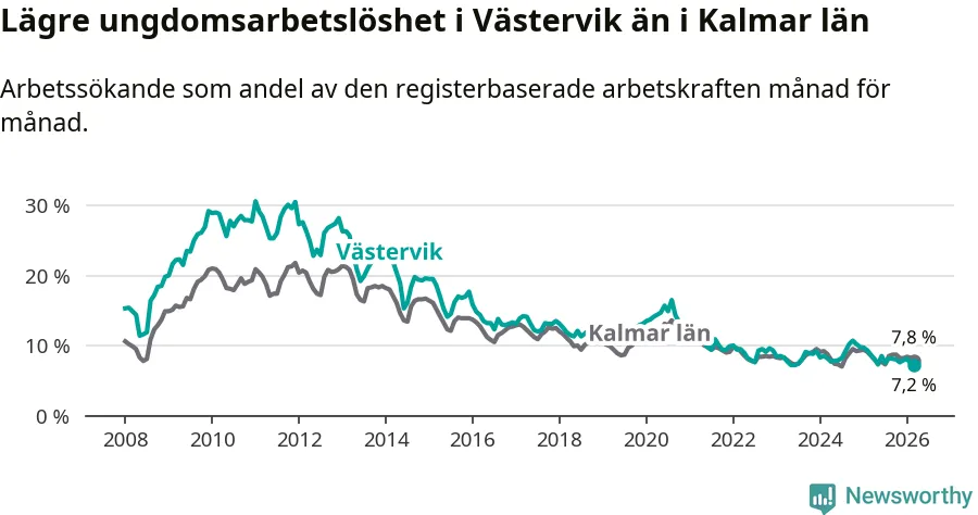 I och med den senaste månadens nedgång har de ungas arbetslöshet i Västervik sjunkit nio månader i följd (ner från 8,5 procent i juni 2025 till 7,2 procent nu). Den nuvarande arbetslöshetsnivån är den lägsta sedan juni 2023.