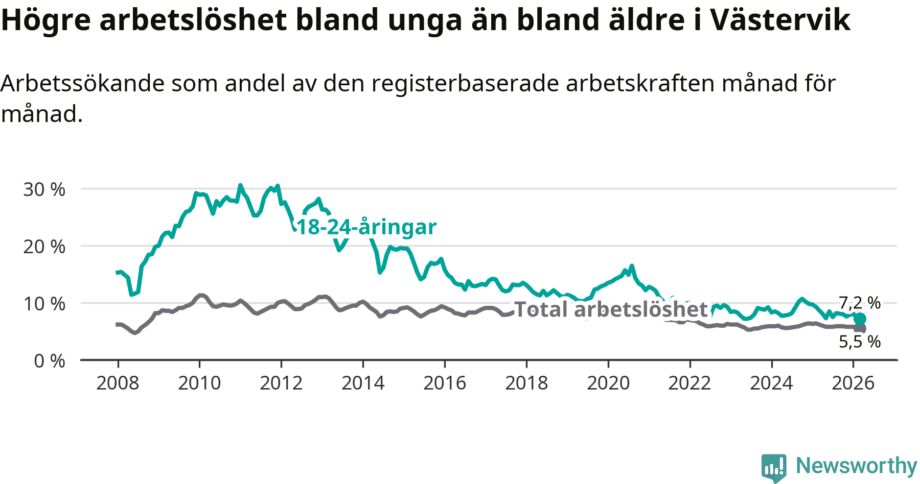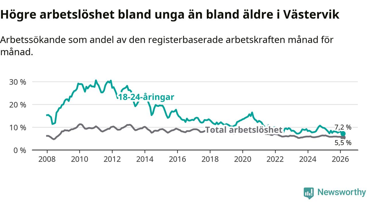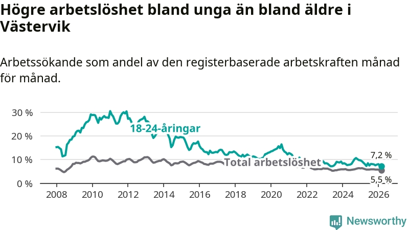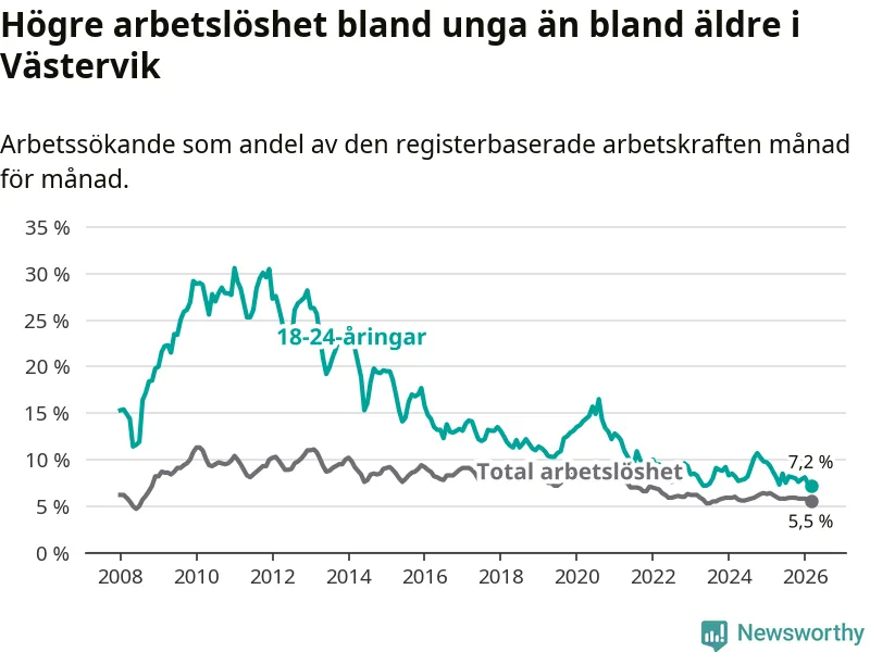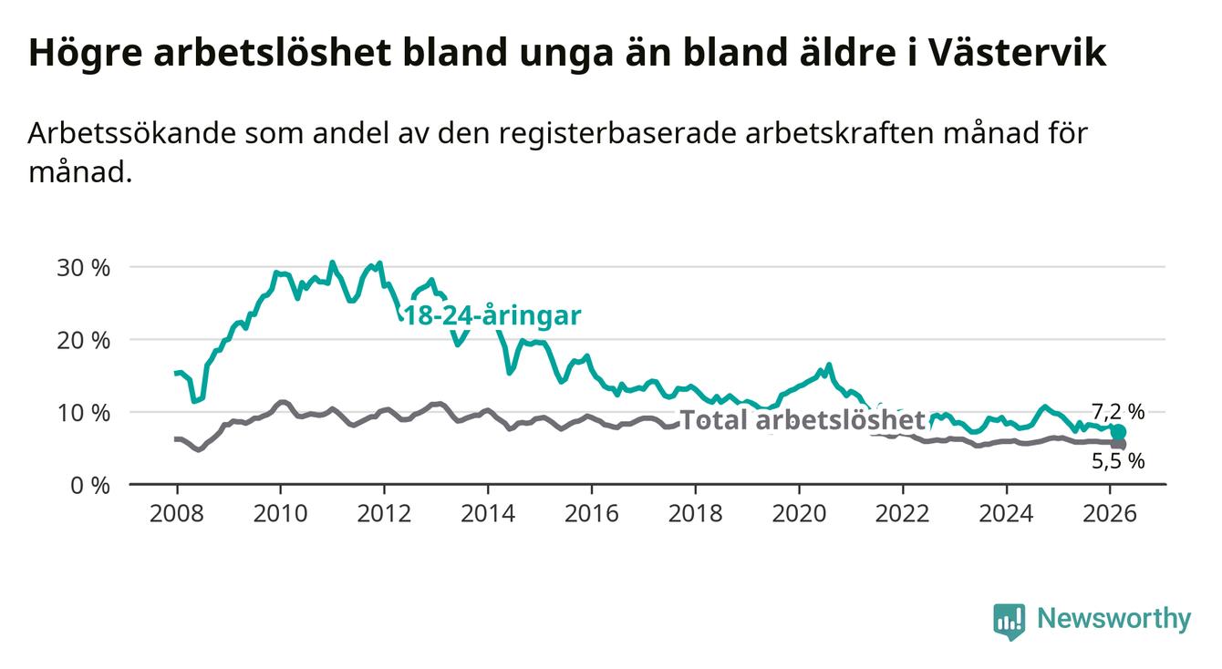 I och med den senaste månadens nedgång har de ungas arbetslöshet i Västervik sjunkit nio månader i följd (ner från 8,5 procent i juni 2025 till 7,2 procent nu). Den nuvarande arbetslöshetsnivån är den lägsta sedan juni 2023.
