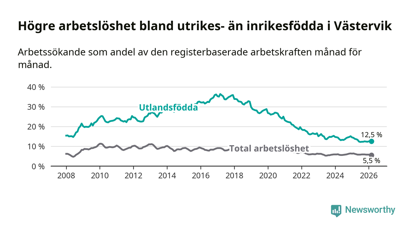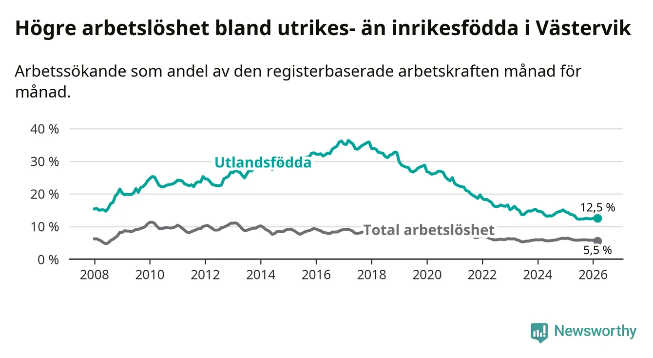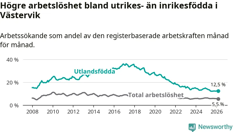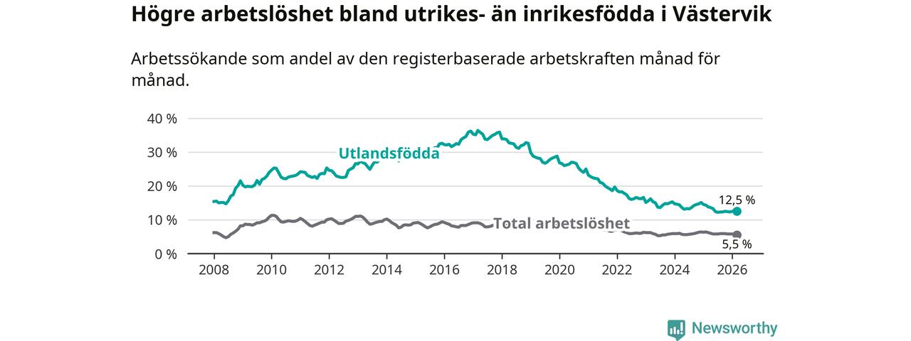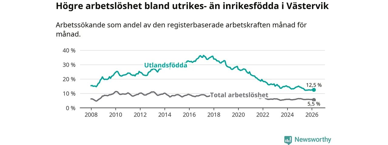 Skillnaden i arbetslöshet mellan utrikesfödda och hela befolkningen är 7,0 procentenheter i Västervik. Det är en mindre skillnad än för ett år sedan (−0,6 procentenheter).