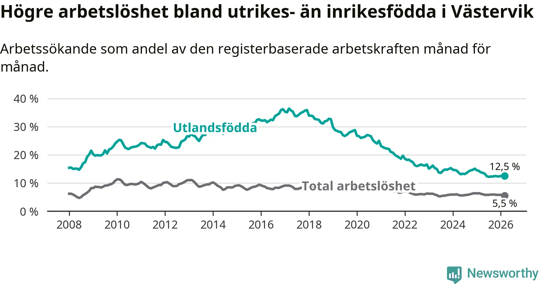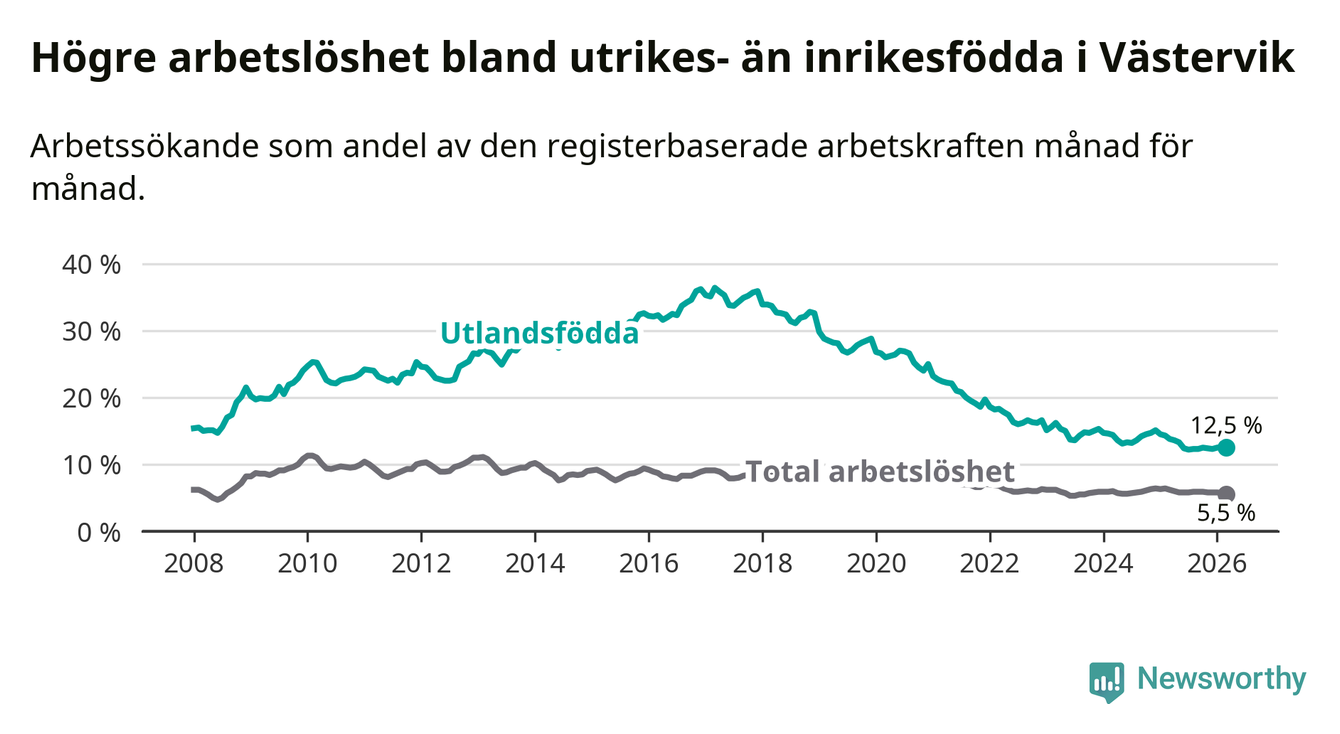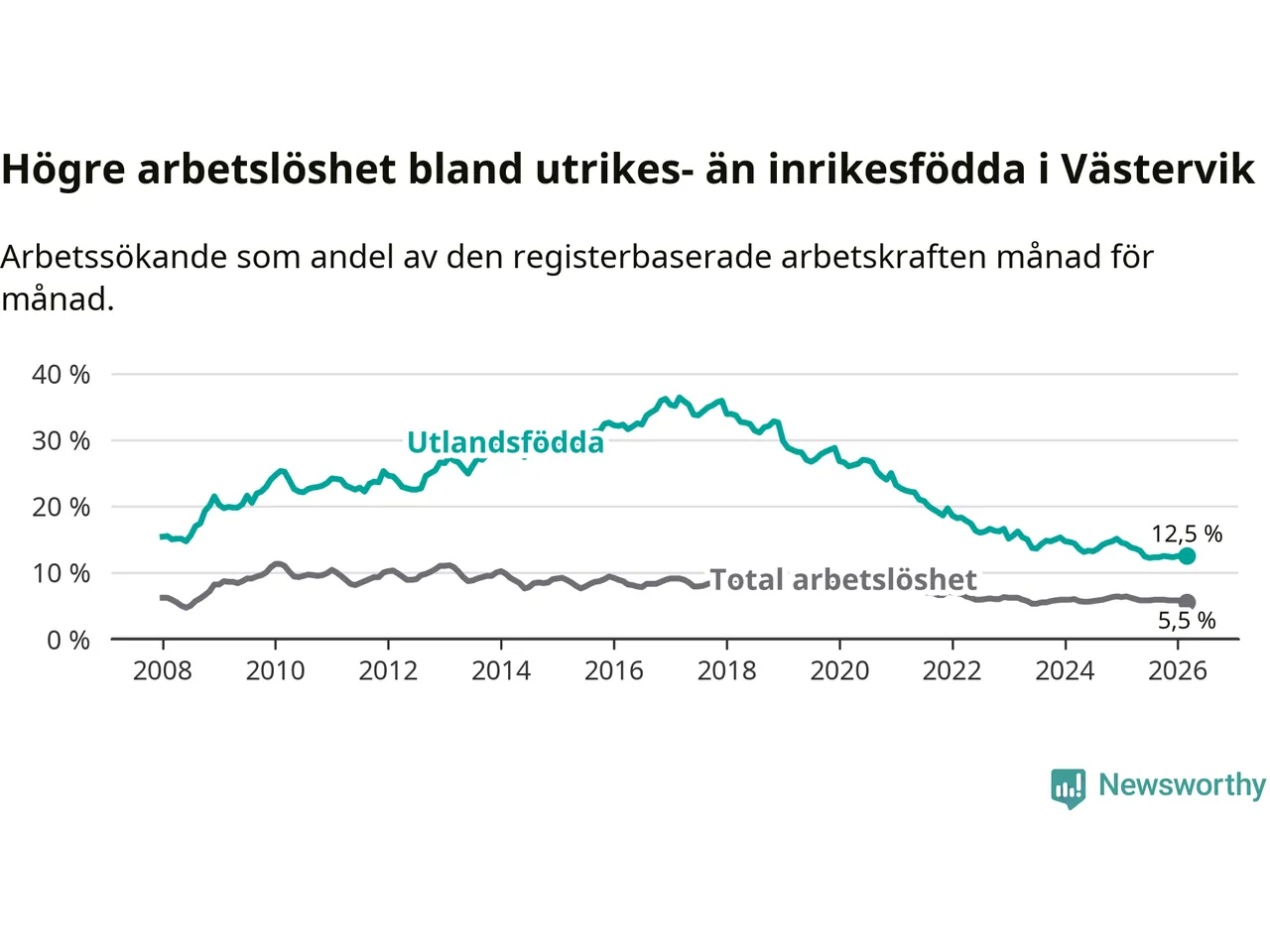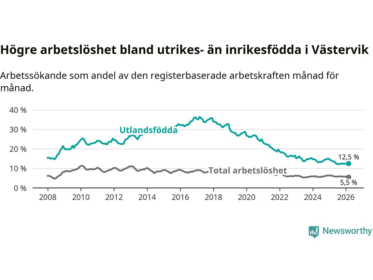 Arbetslösheten bland utlandsfödda var 12,5 procent i Västervik under mars månad, motsvarande 316 av 2 528 personer. Det är 1,3 procentenheter färre än vid samma tidpunkt i fjol (−22 om man räknar personer). Därmed är de utlandsföddas arbetslöshet lägre än vid samma tidpunkt i fjol för tionde månaden i följd.