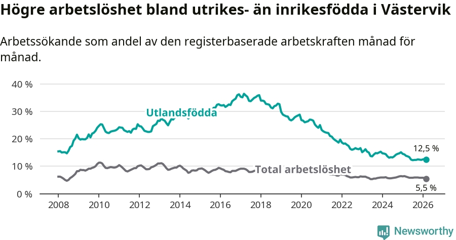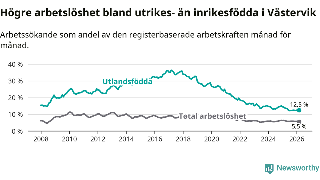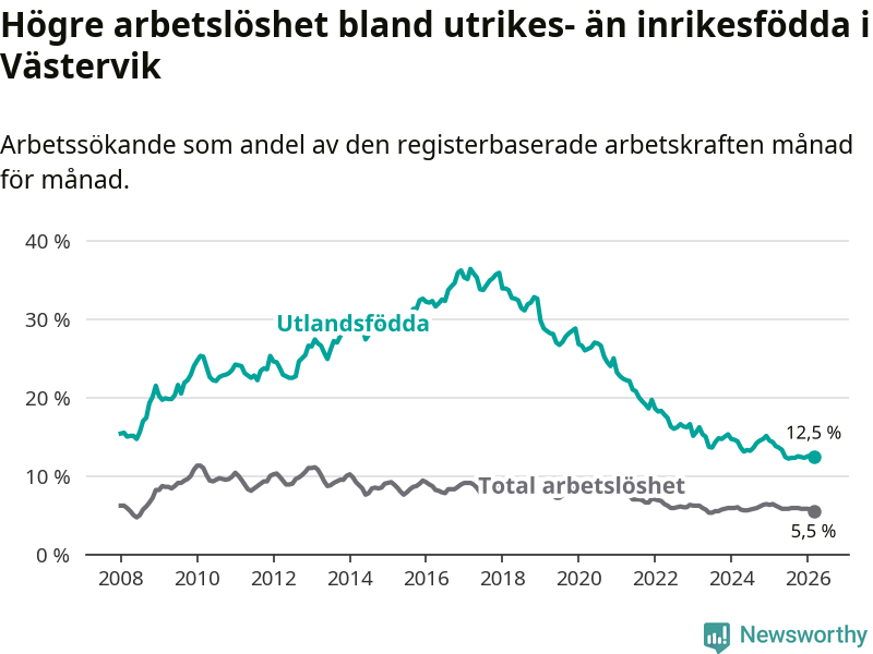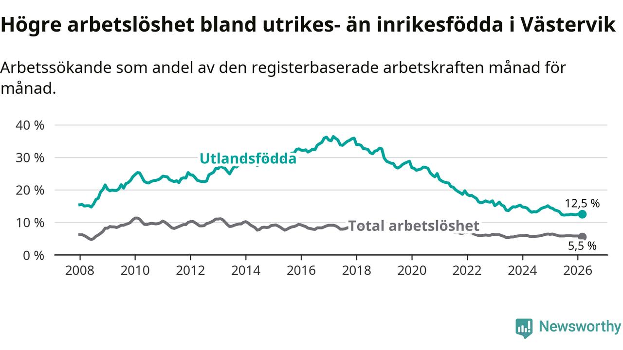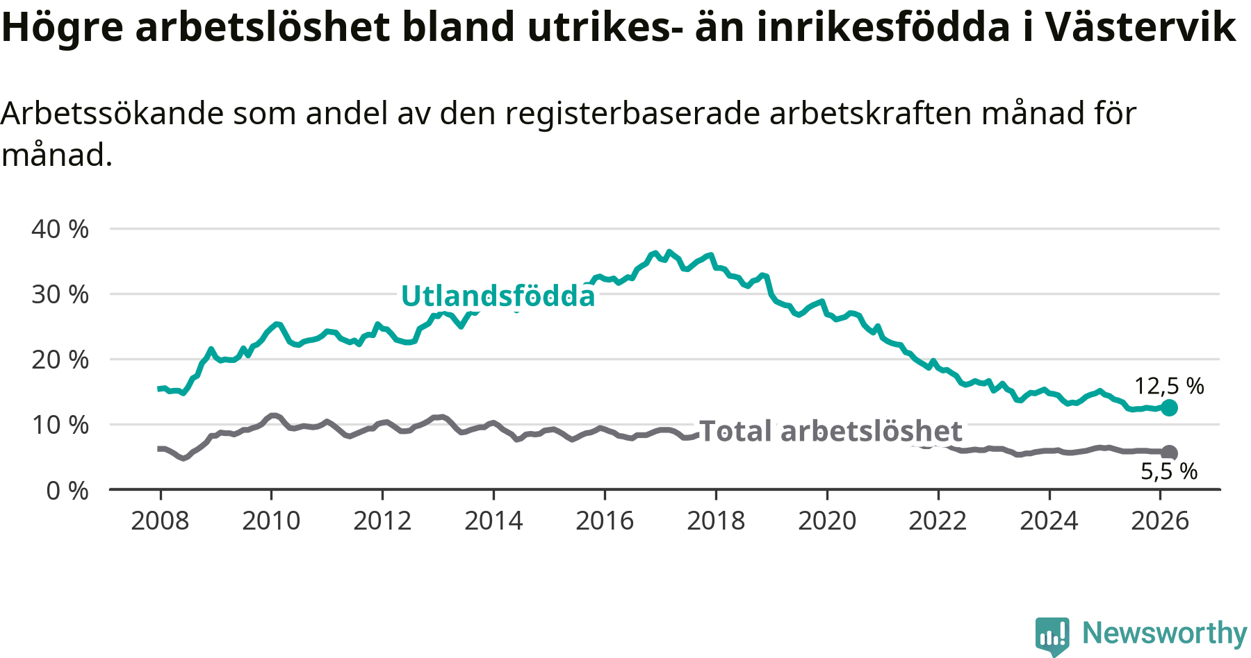 Arbetslösheten bland utlandsfödda var 12,5 procent i Västervik under mars månad, motsvarande 316 av 2 528 personer. Det är 1,3 procentenheter färre än vid samma tidpunkt i fjol (−22 om man räknar personer). Därmed är de utlandsföddas arbetslöshet lägre än vid samma tidpunkt i fjol för tionde månaden i följd.