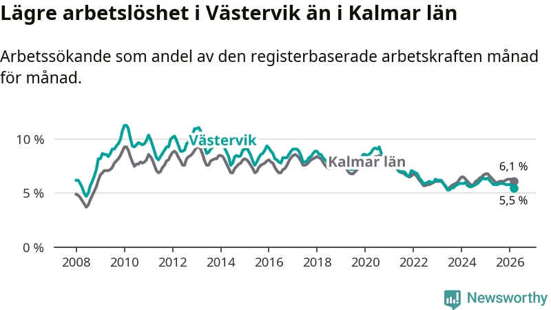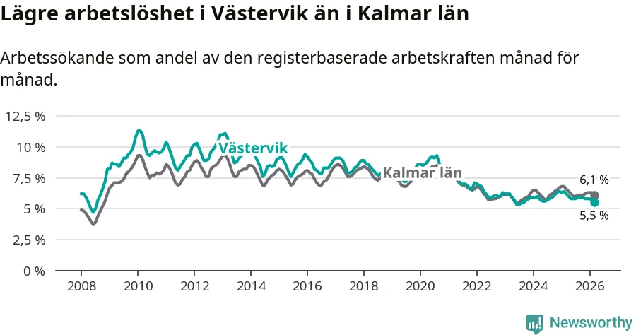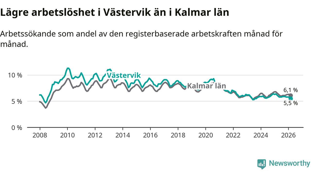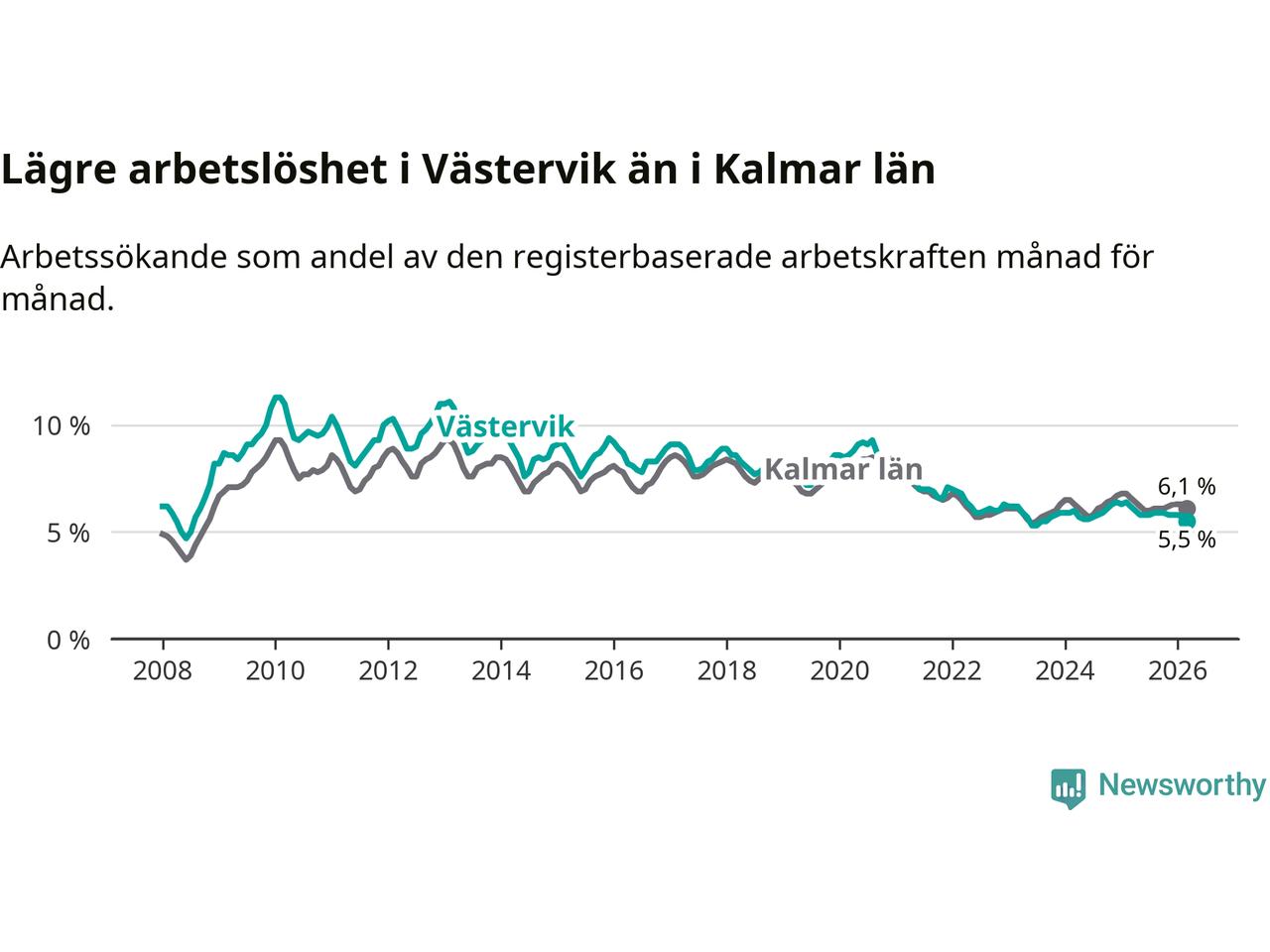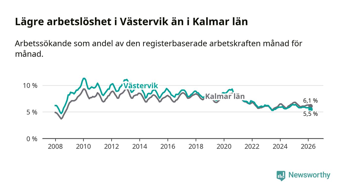 Under mars månad rapporterade Västerviks kommun en total arbetslöshet på 5,5 procent. Det är en minskning jämfört med samma tidpunkt i fjol (−0,7 procentenheter). Även i Kalmar län sjunker arbetslösheten .