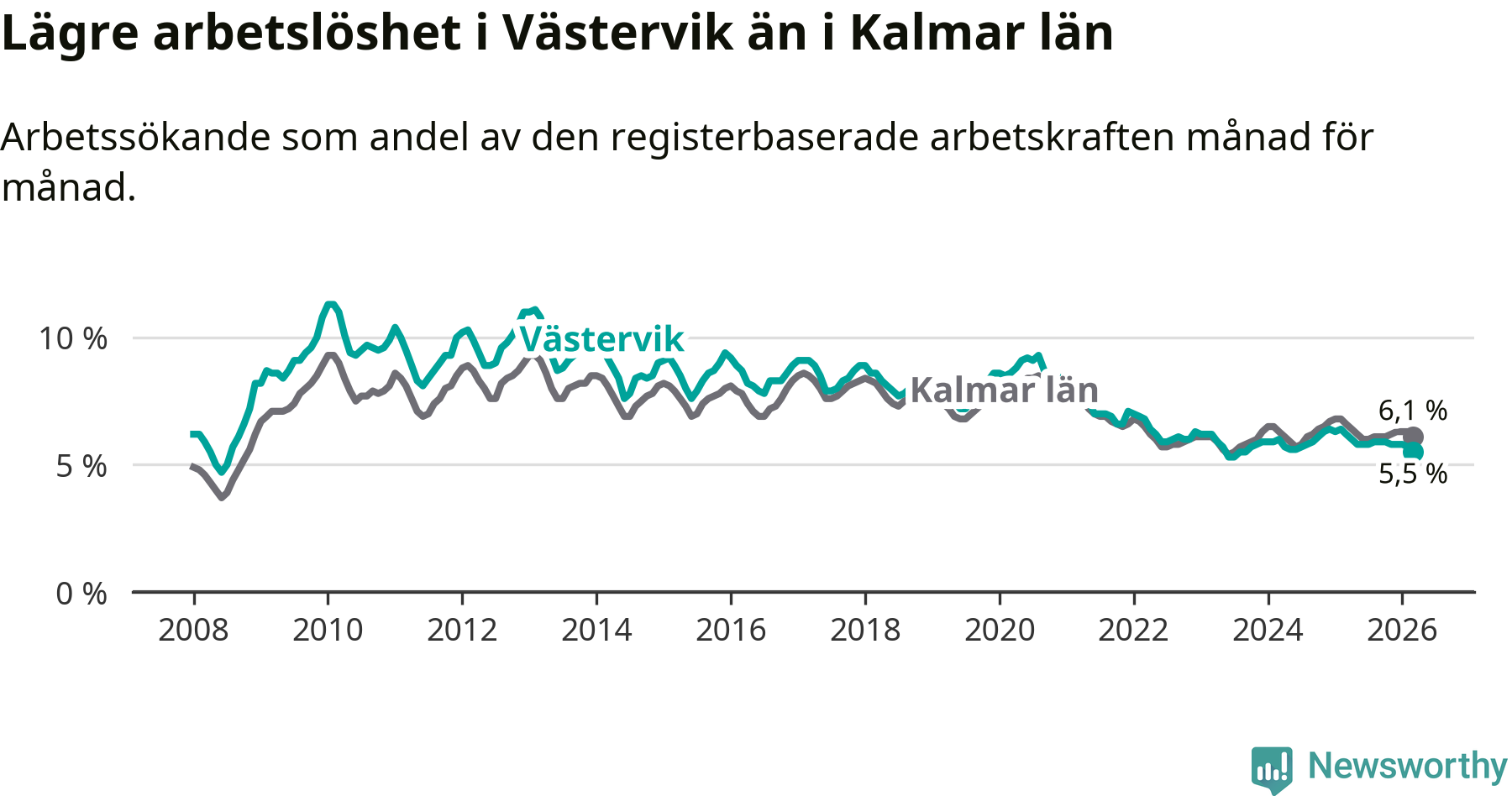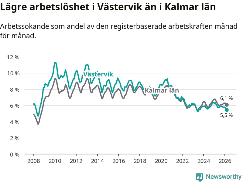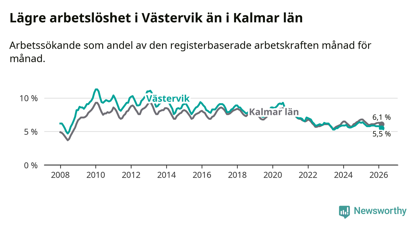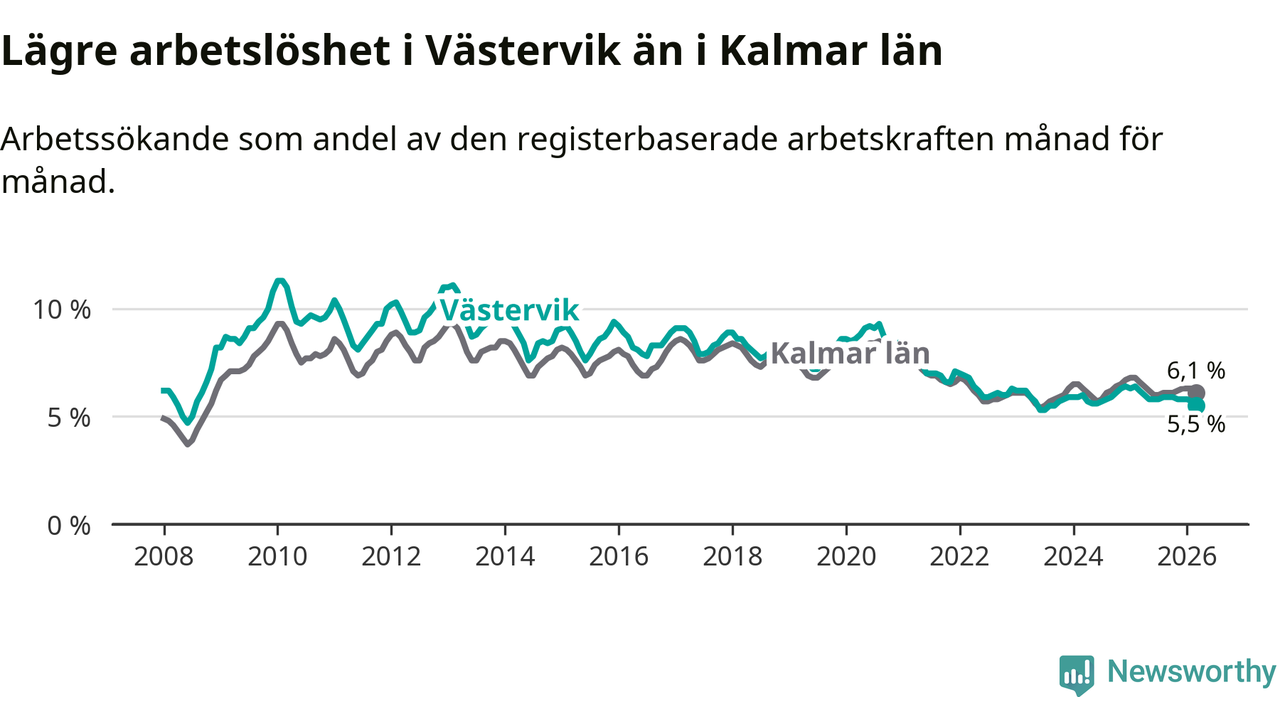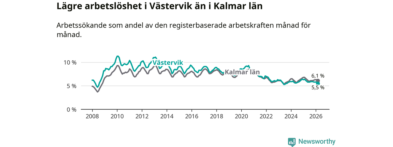 Under mars månad rapporterade Västerviks kommun en total arbetslöshet på 5,5 procent. Det är en minskning jämfört med samma tidpunkt i fjol (−0,7 procentenheter). Även i Kalmar län sjunker arbetslösheten .