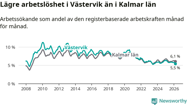Västervik hade redan tidigare lägre arbetslöshet än snittet i hela Kalmar län och nu växer klyftan (5,5 procent i kommunen, jämfört med 6,1 procent i hela länet). Mörbylånga har den lägsta arbetslösheten i länet (3,7 procent), medan Nybro har den högsta (8,1 procent). För att Västervik skulle komma ner i samma arbetslöshetsnivå som Mörbylånga skulle 297 personer behöva sysselsättas.