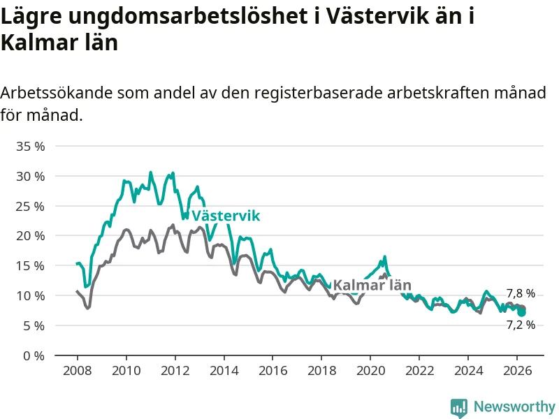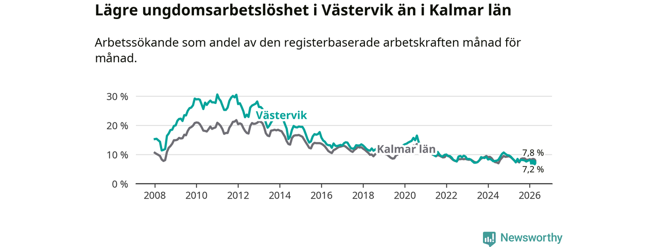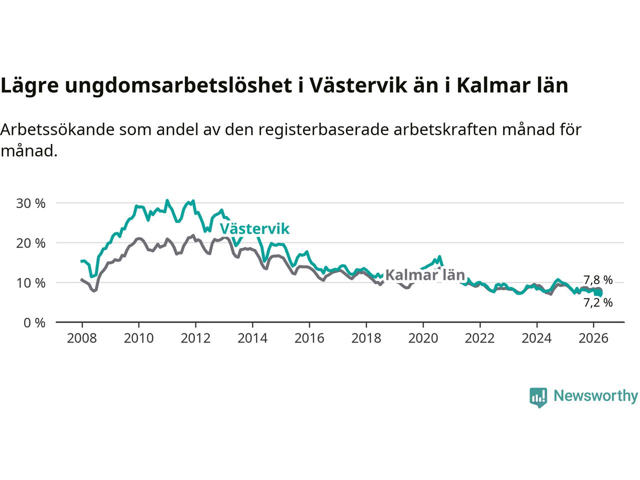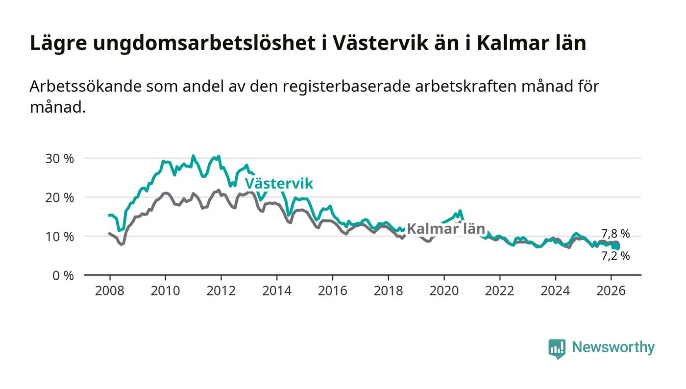 Precis som den totala arbetslösheten ligger ungdomsarbetslösheten i Västervik lägre än i Kalmar län som helhet. Skillnaden mellan kommunen och länet är 0,6 procentenheter.