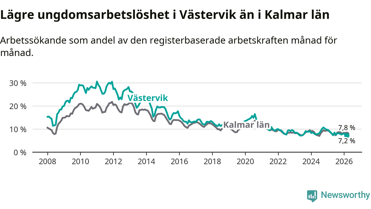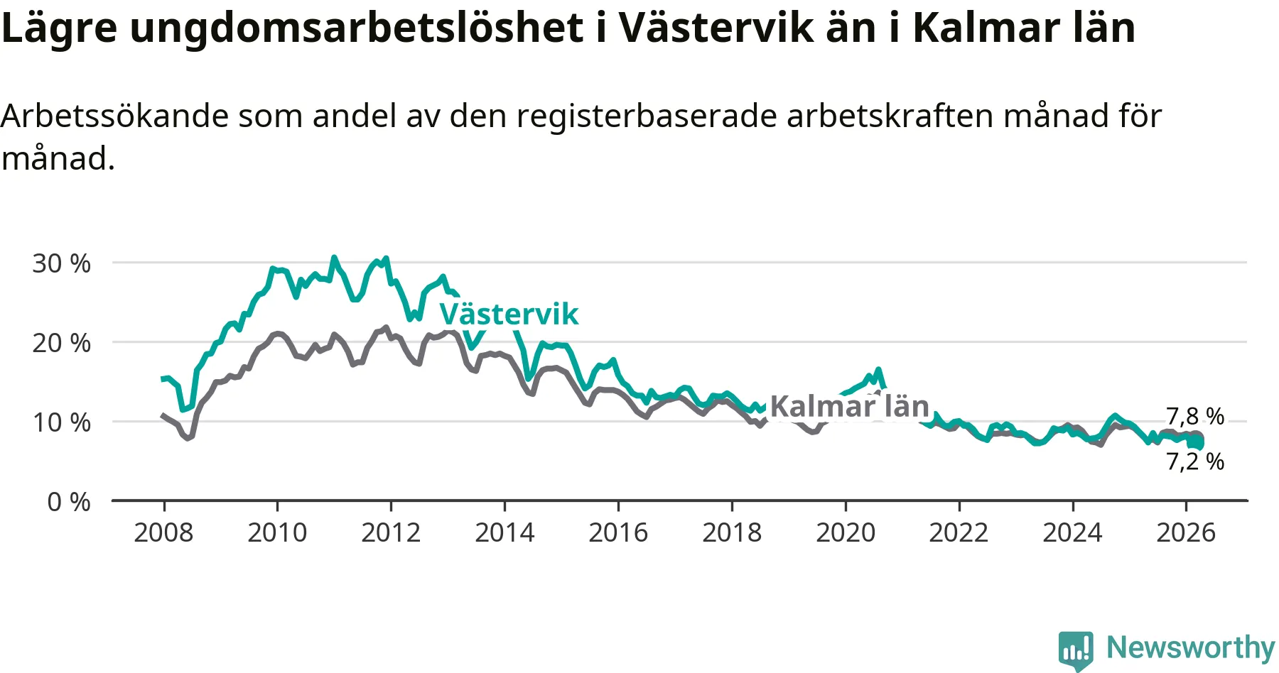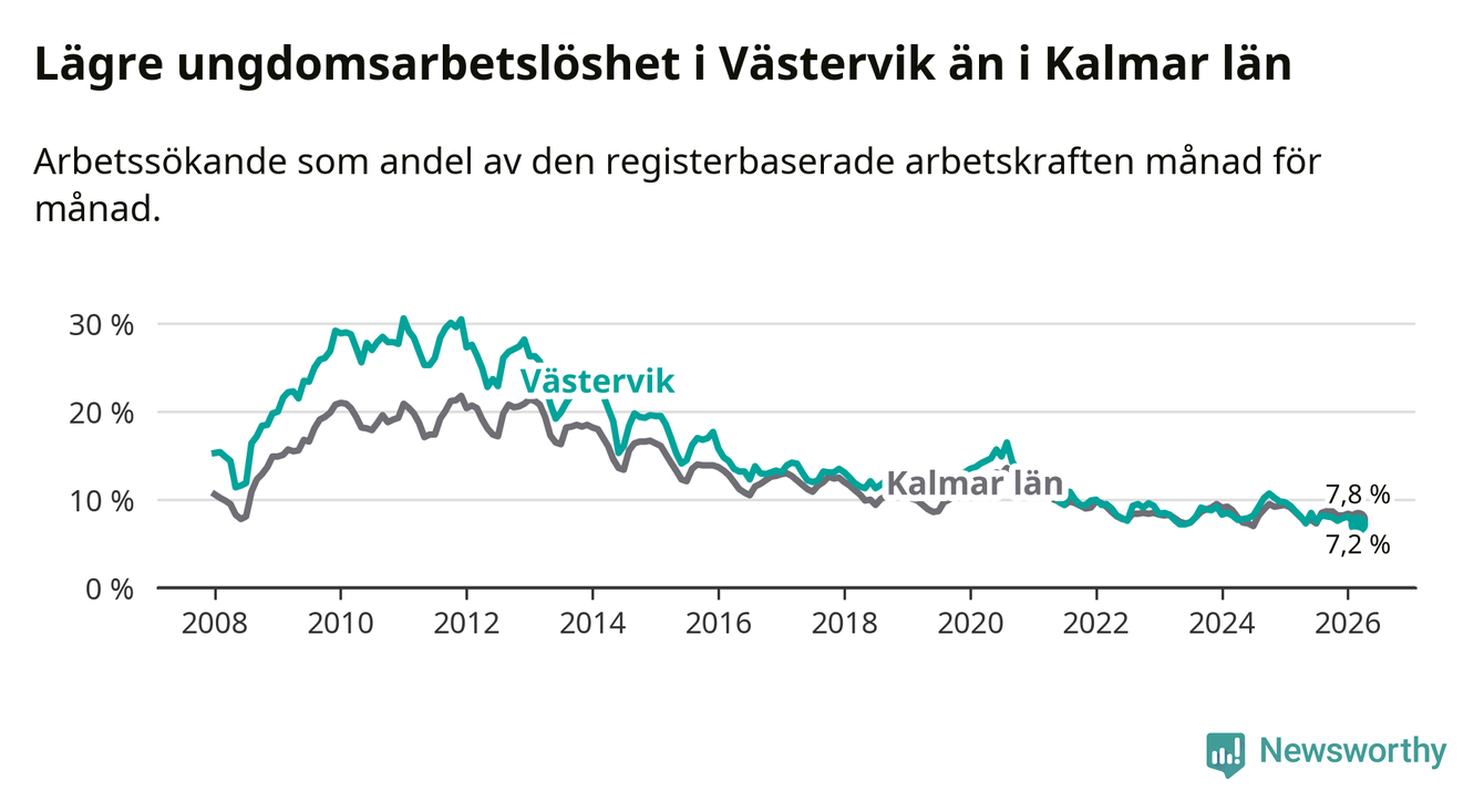 Precis som den totala arbetslösheten ligger ungdomsarbetslösheten i Västervik lägre än i Kalmar län som helhet. Skillnaden mellan kommunen och länet är 0,6 procentenheter.