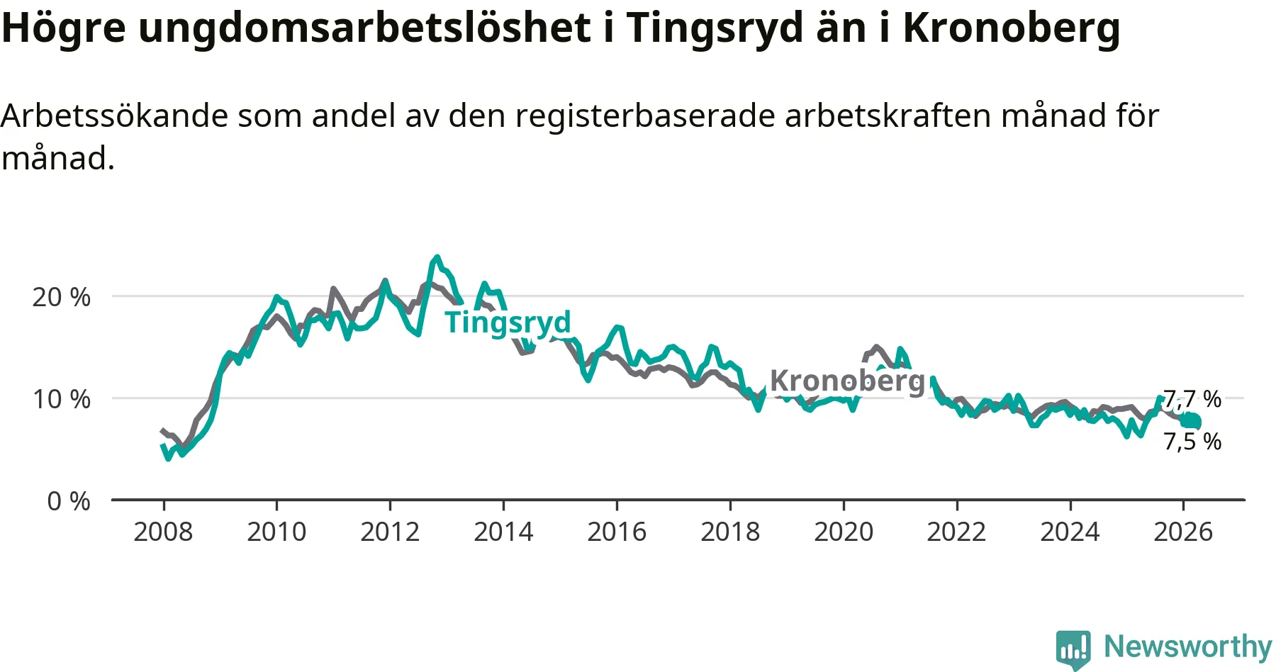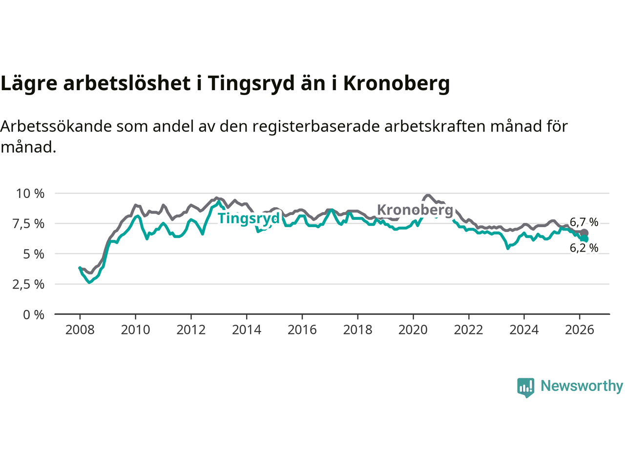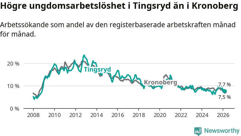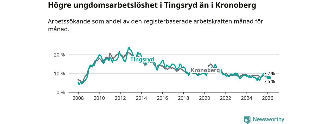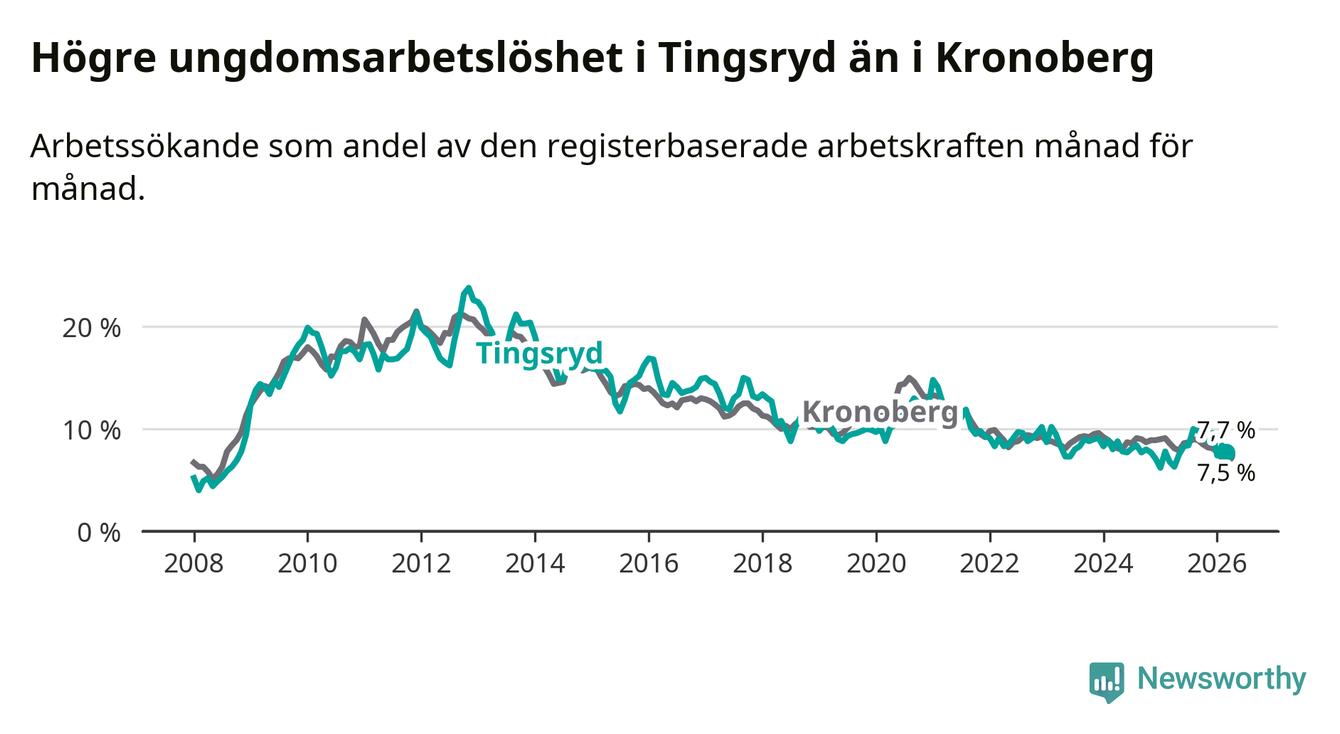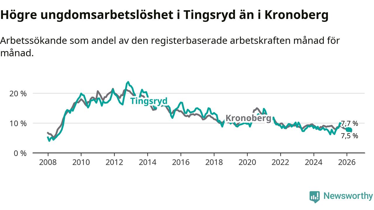 Medan Tingsryd har lägre total arbetslöshet än Kronoberg, ligger ungdomsarbetslösheten 0,2 procentenheter högre i Tingsryd.