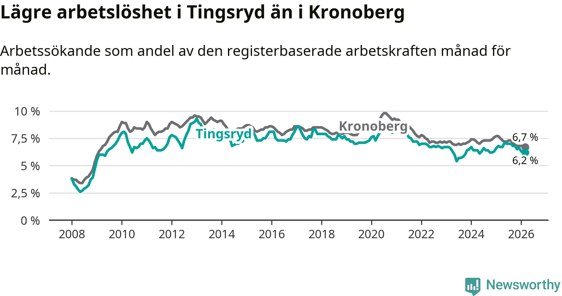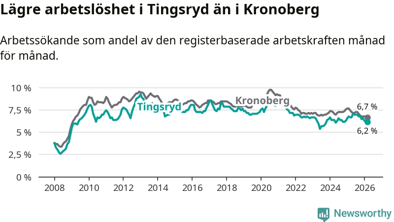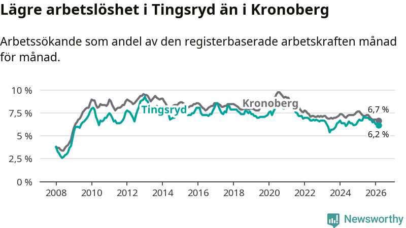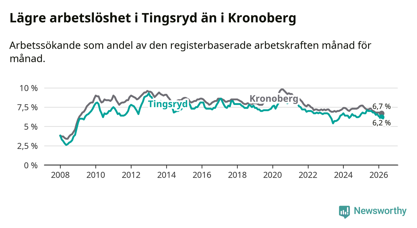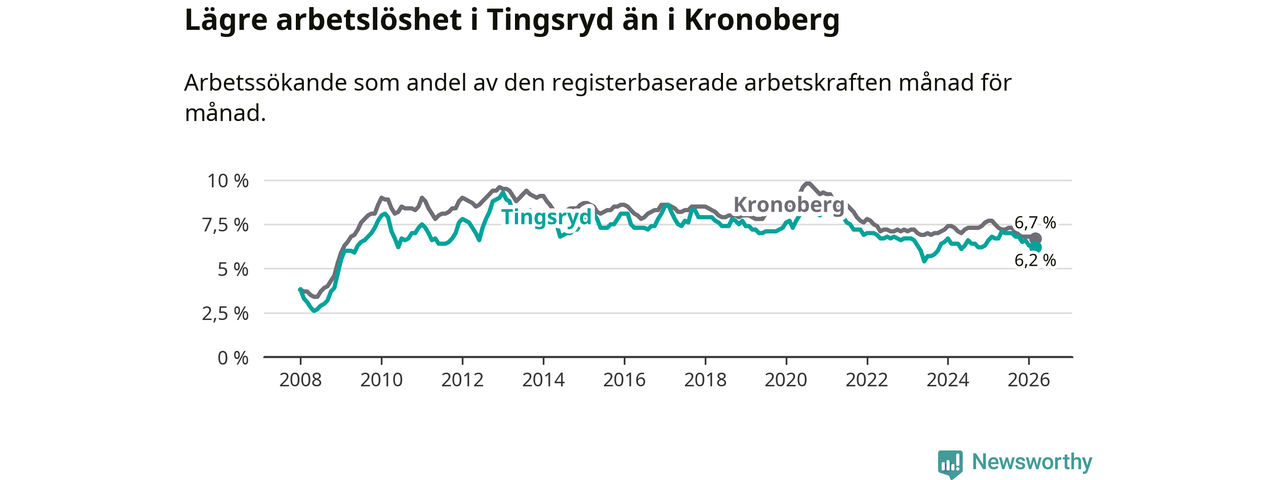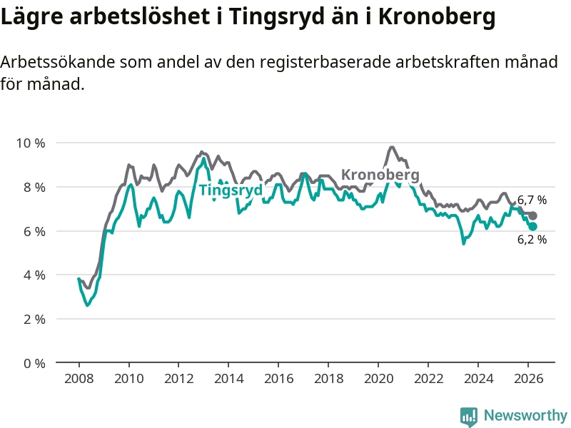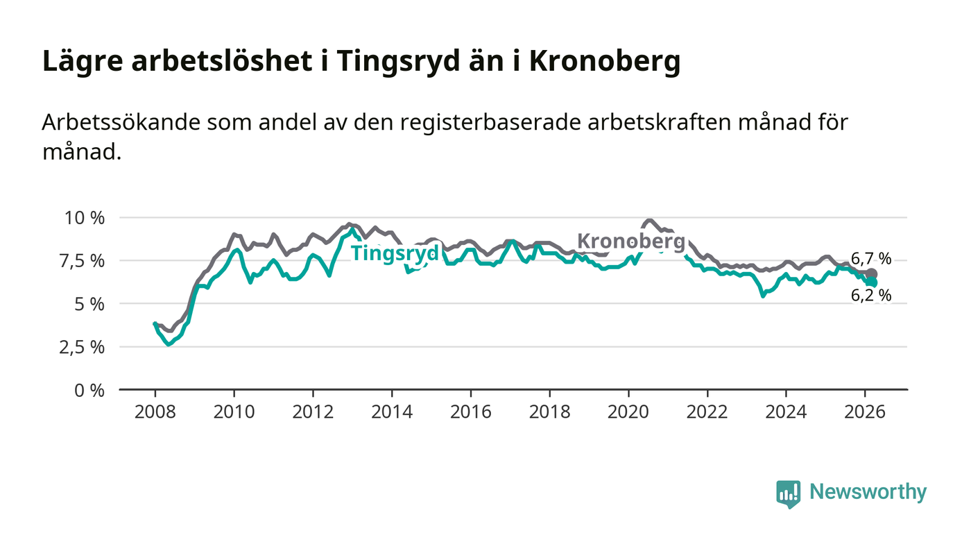 Medan Tingsryd har lägre total arbetslöshet än Kronoberg, ligger ungdomsarbetslösheten 0,2 procentenheter högre i Tingsryd.