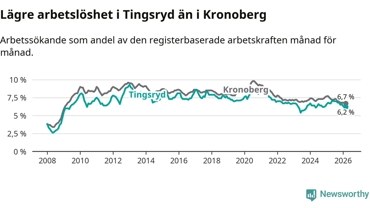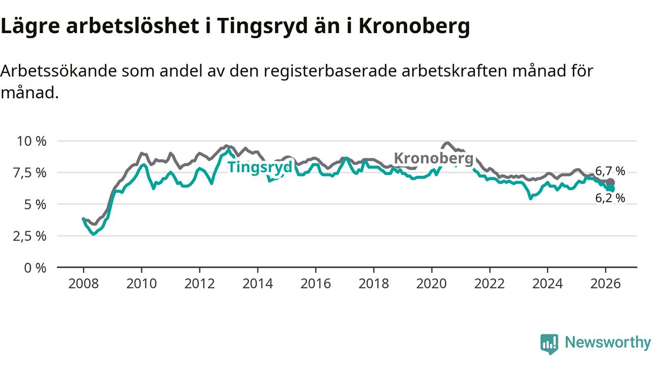 Under mars månad rapporterade Tingsryds kommun en total arbetslöshet på 6,2 procent. Det är en minskning jämfört med samma tidpunkt i fjol (−0,5 procentenheter). Även i Kronobergs län sjunker arbetslösheten .