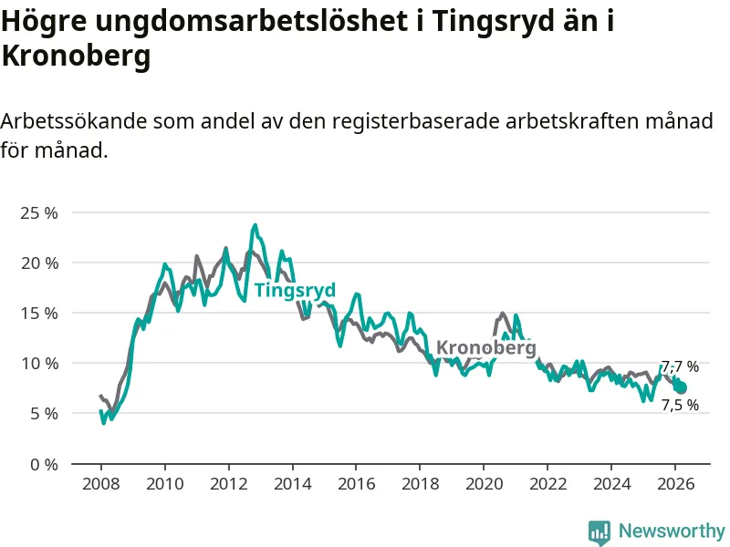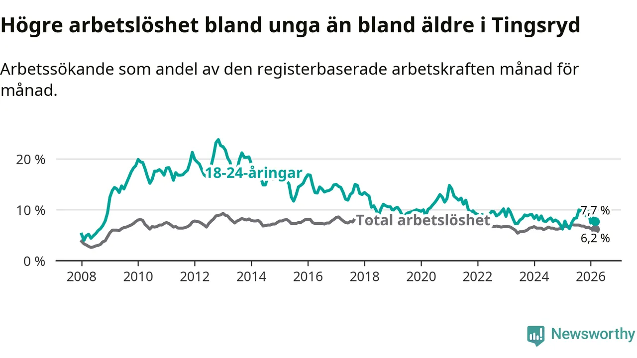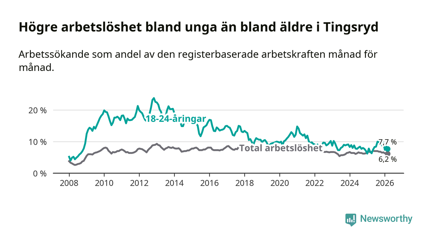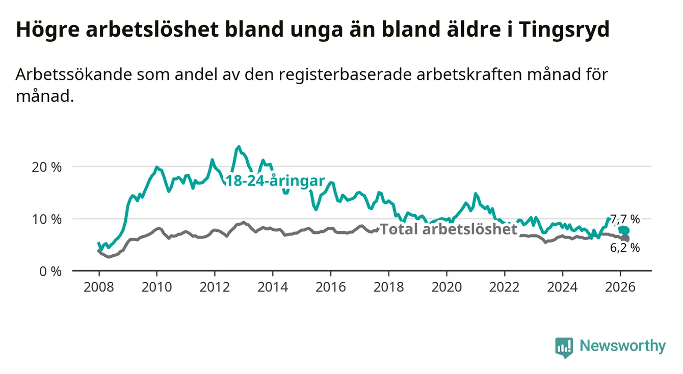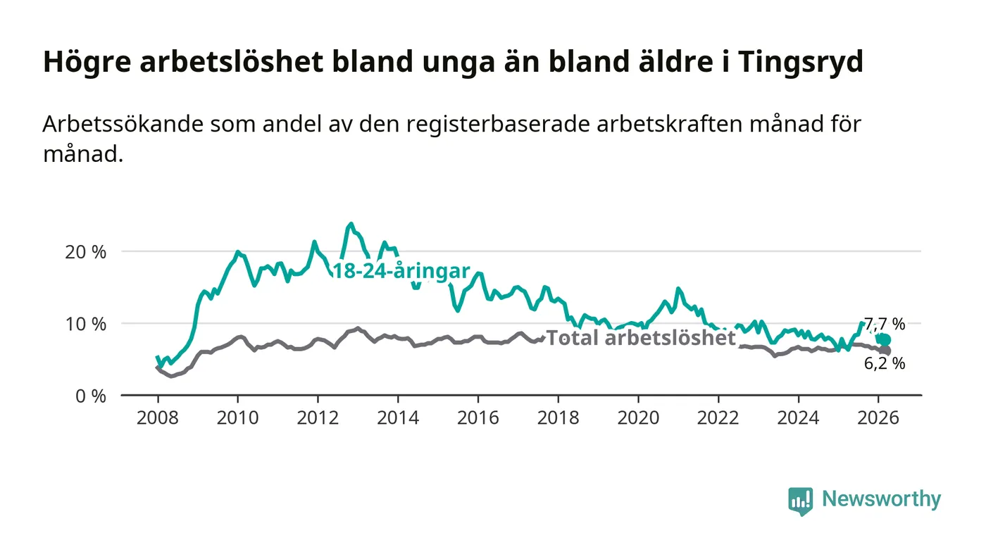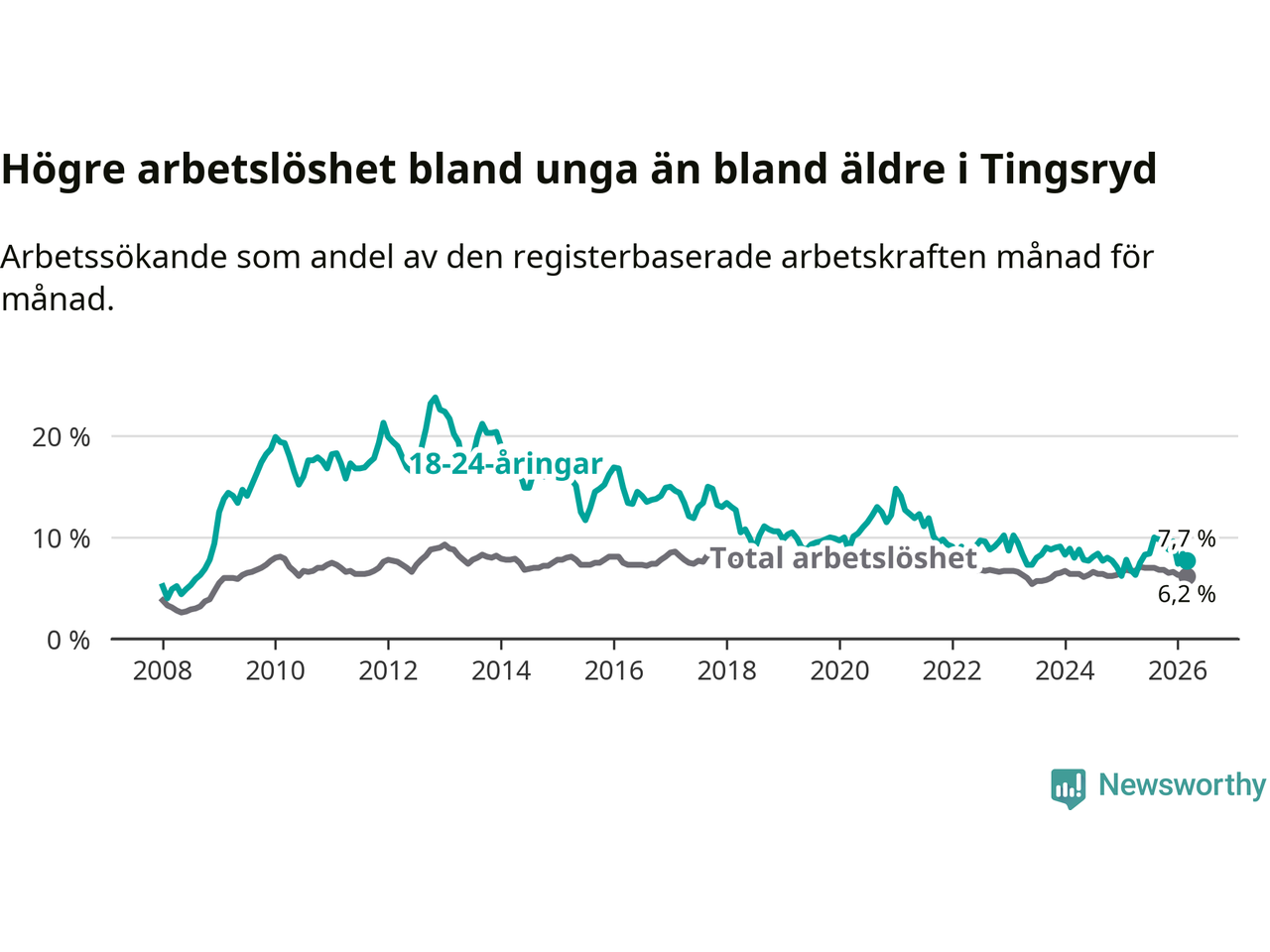 I och med den senaste månadens uppgång har de ungas arbetslöshet i Tingsryd stigit tio månader i följd (upp från 7,5 procent i maj 2025 till 7,7 procent nu).