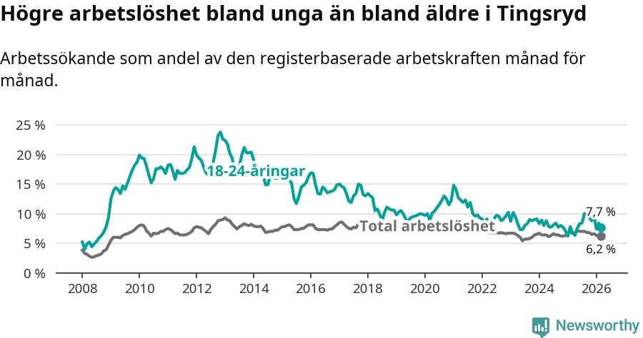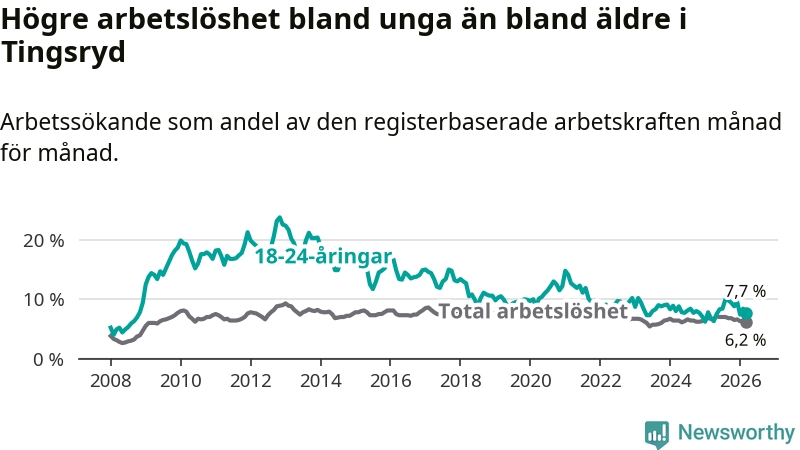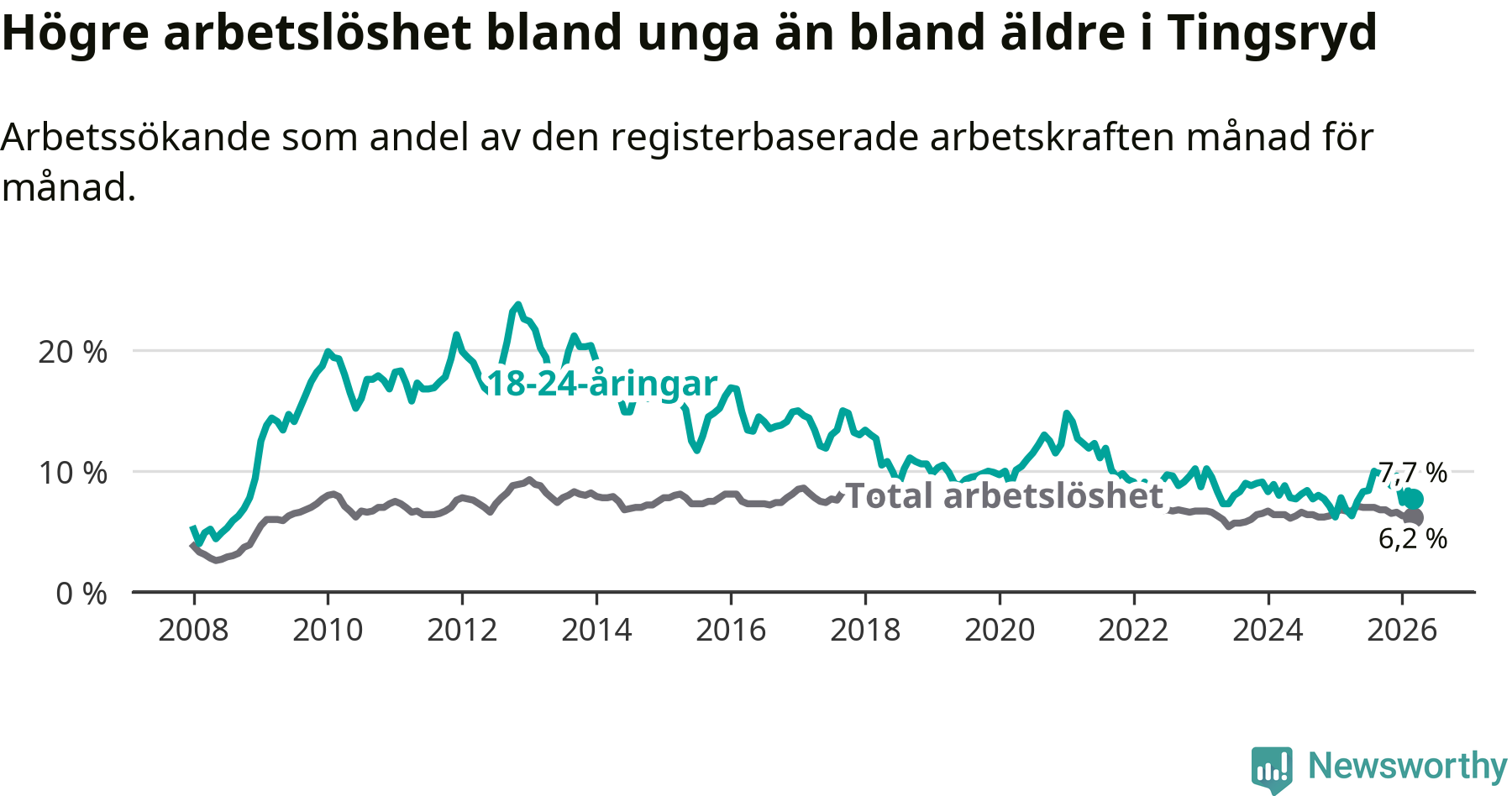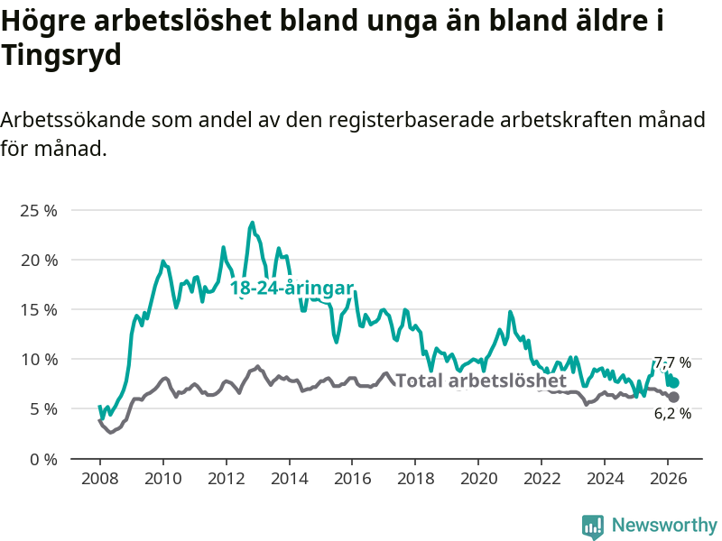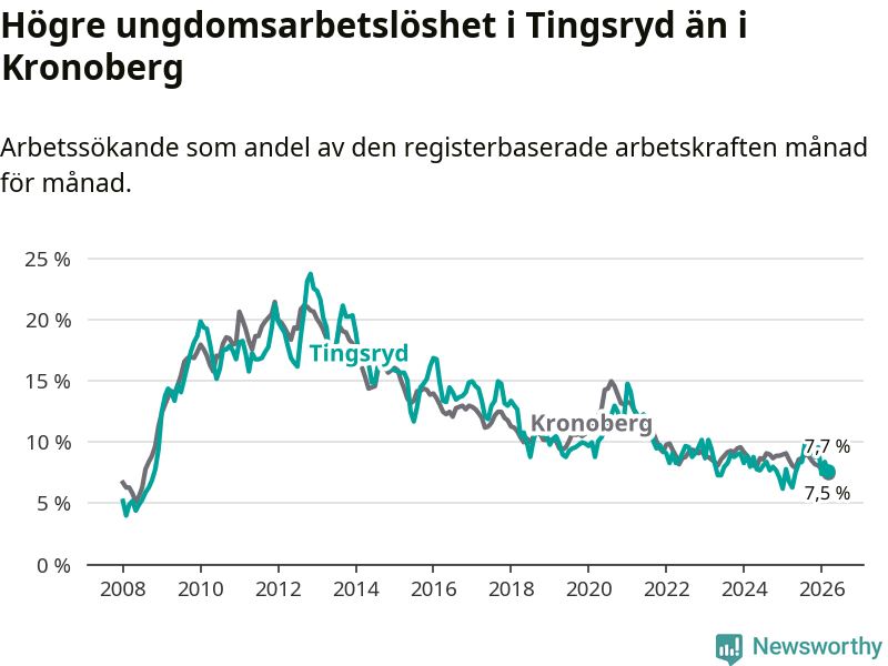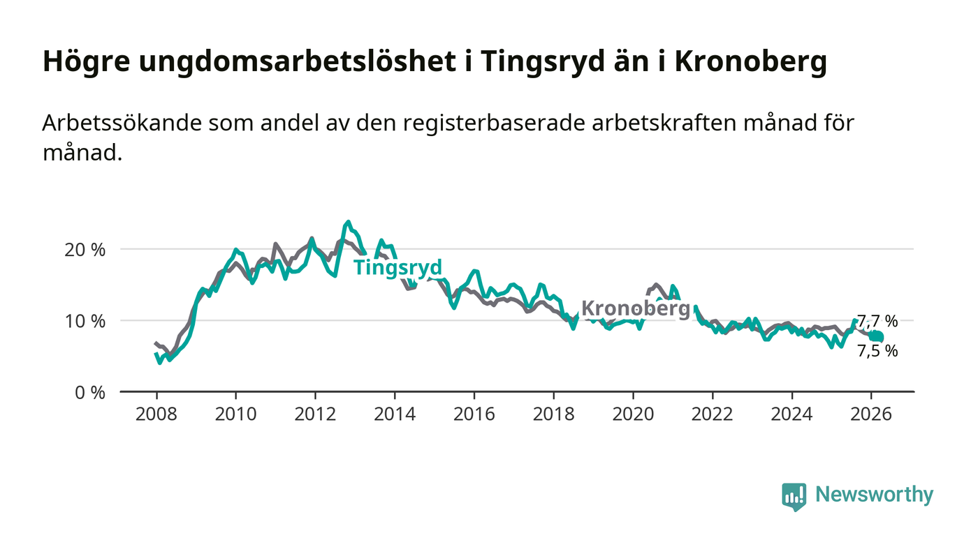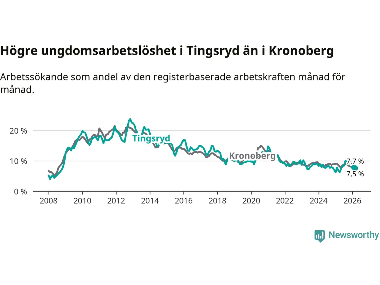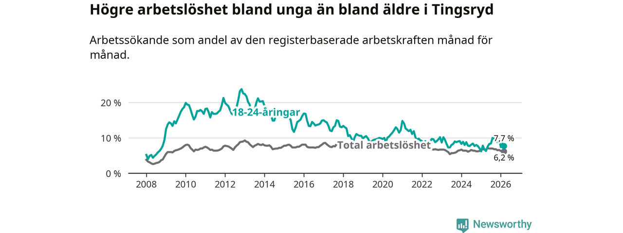 I och med den senaste månadens uppgång har de ungas arbetslöshet i Tingsryd stigit tio månader i följd (upp från 7,5 procent i maj 2025 till 7,7 procent nu).