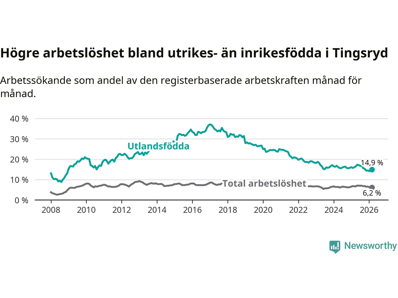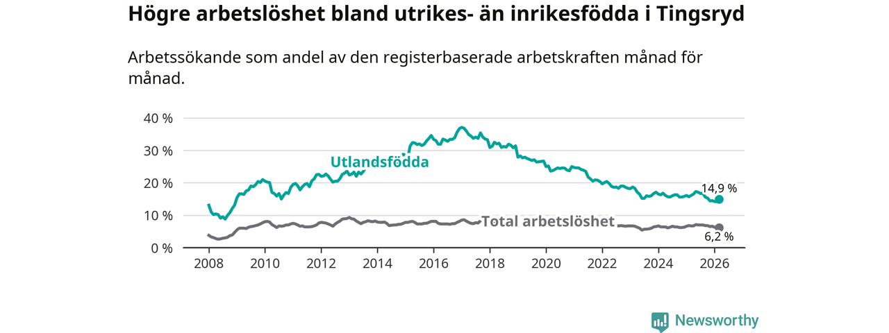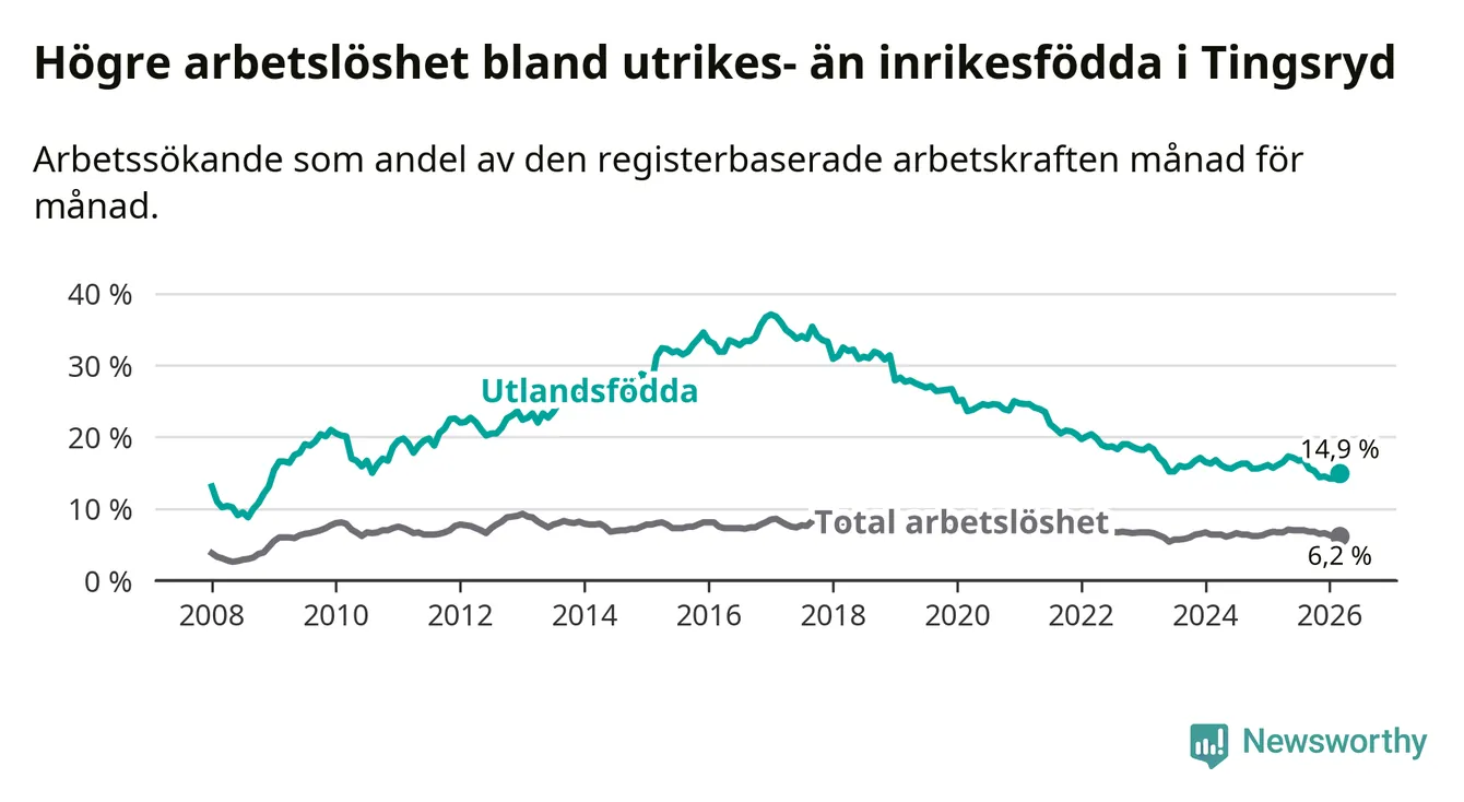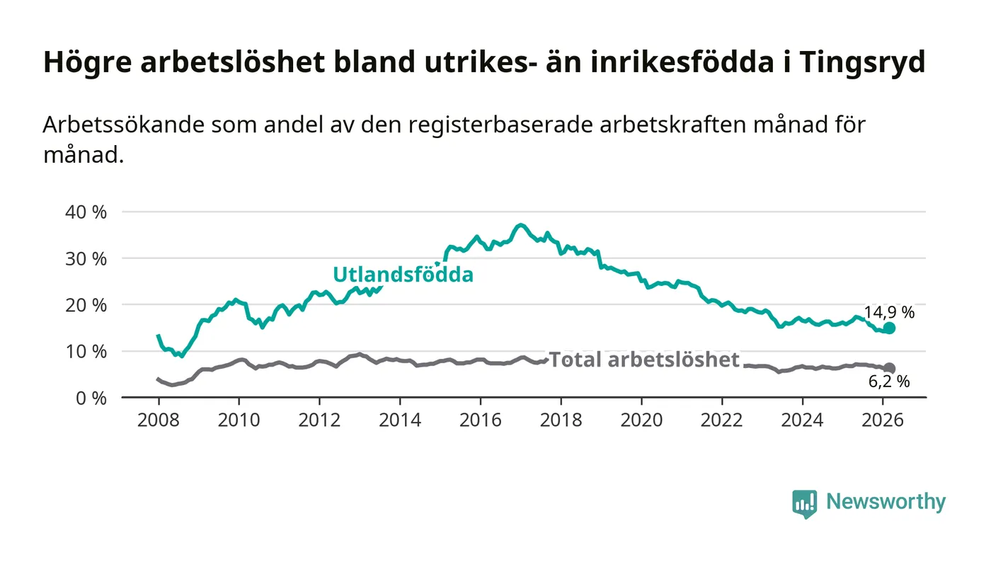 Arbetslösheten bland utlandsfödda var 14,9 procent i Tingsryd under mars månad, motsvarande 158 av 1 060 personer. Det är 1,2 procentenheter färre än vid samma tidpunkt i fjol (−11 om man räknar personer). Därmed är de utlandsföddas arbetslöshet lägre än vid samma tidpunkt i fjol för sjunde månaden i följd. Sedan augusti 2025 har arbetslösheten bland utlandsfödda minskat från 16,8 till 14,9 procent.