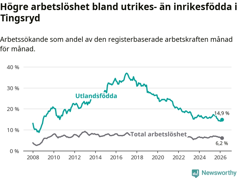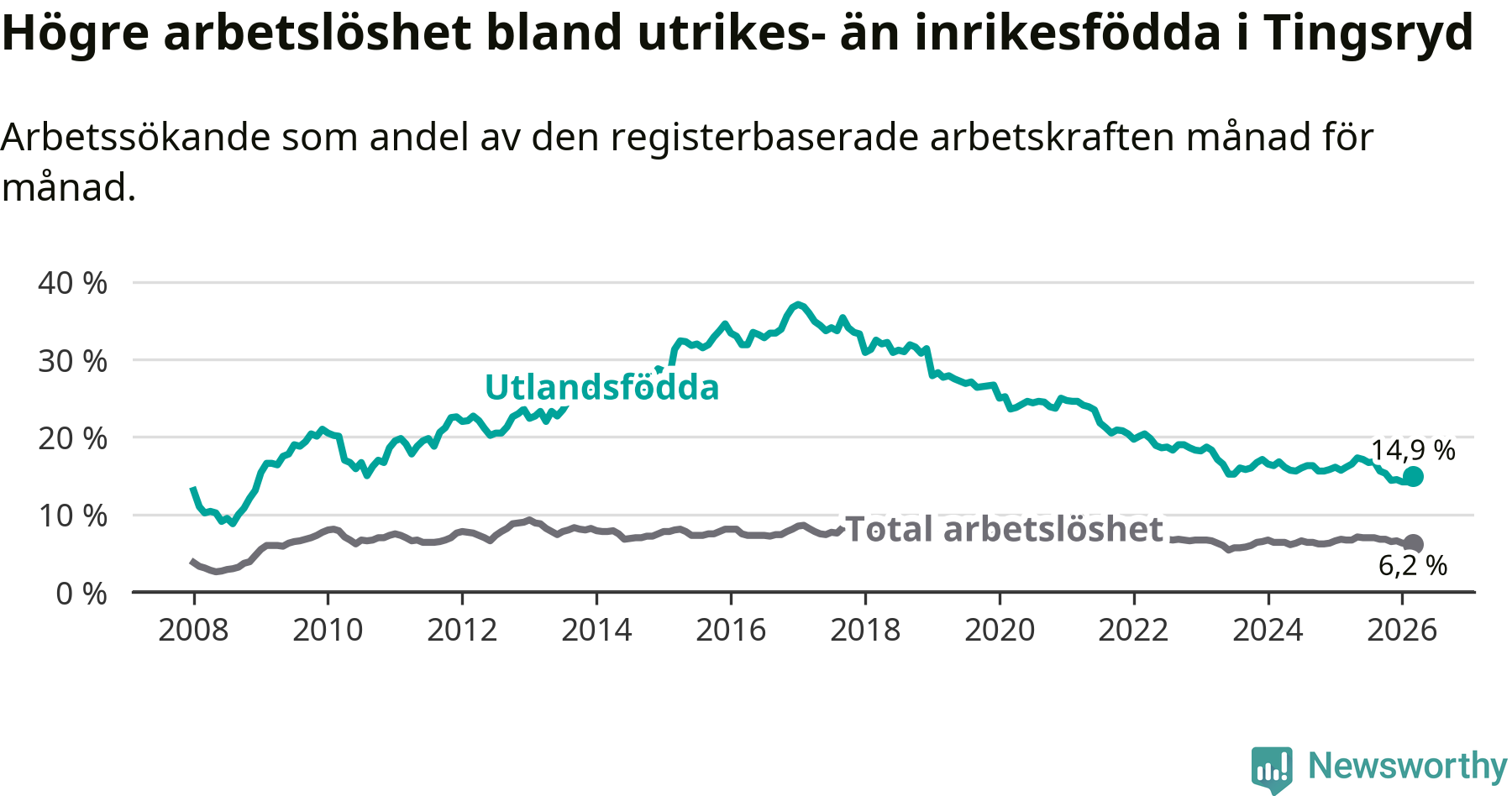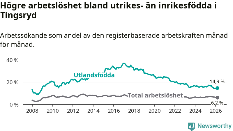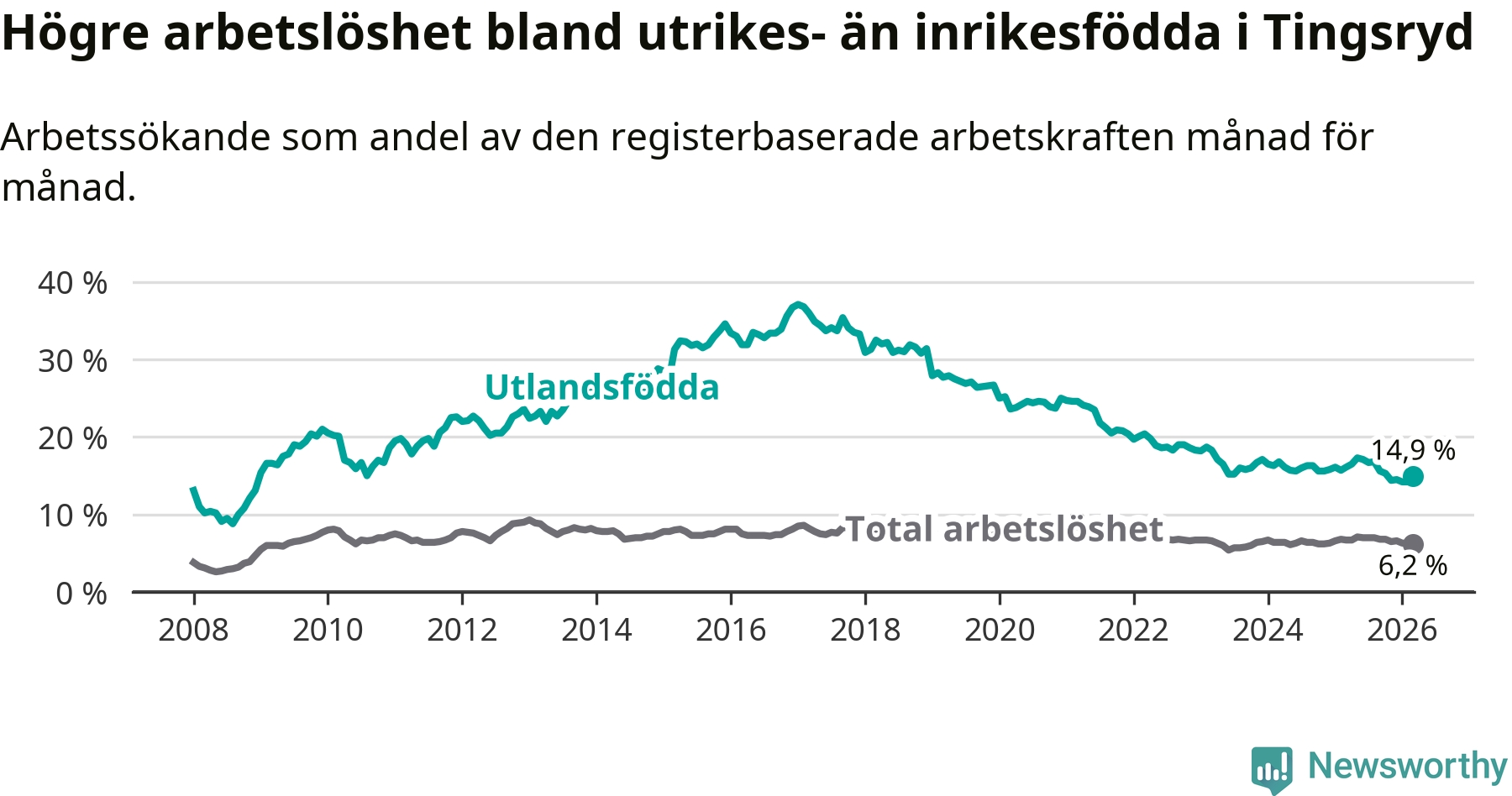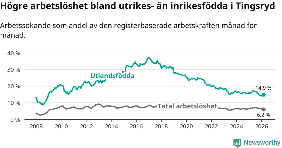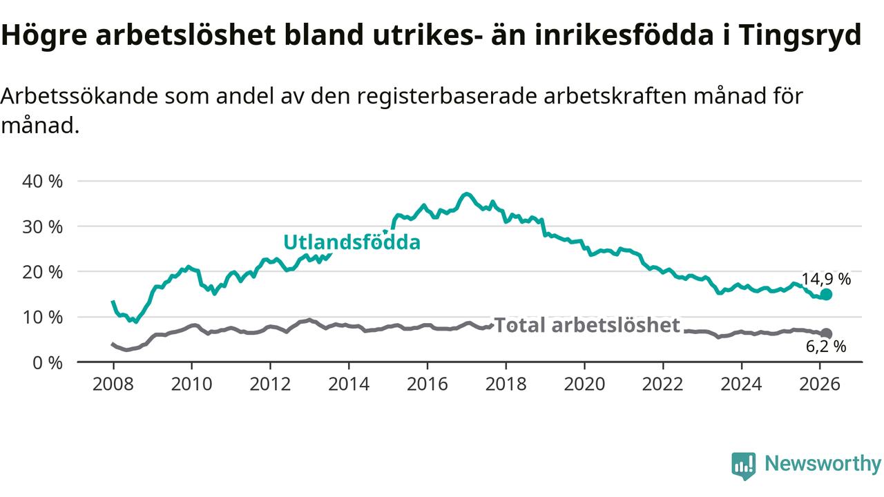 Arbetslösheten bland utlandsfödda var 14,9 procent i Tingsryd under mars månad, motsvarande 158 av 1 060 personer. Det är 1,2 procentenheter färre än vid samma tidpunkt i fjol (−11 om man räknar personer). Därmed är de utlandsföddas arbetslöshet lägre än vid samma tidpunkt i fjol för sjunde månaden i följd. Sedan augusti 2025 har arbetslösheten bland utlandsfödda minskat från 16,8 till 14,9 procent.