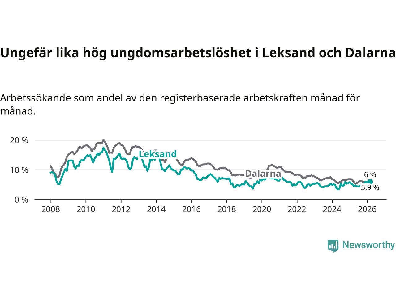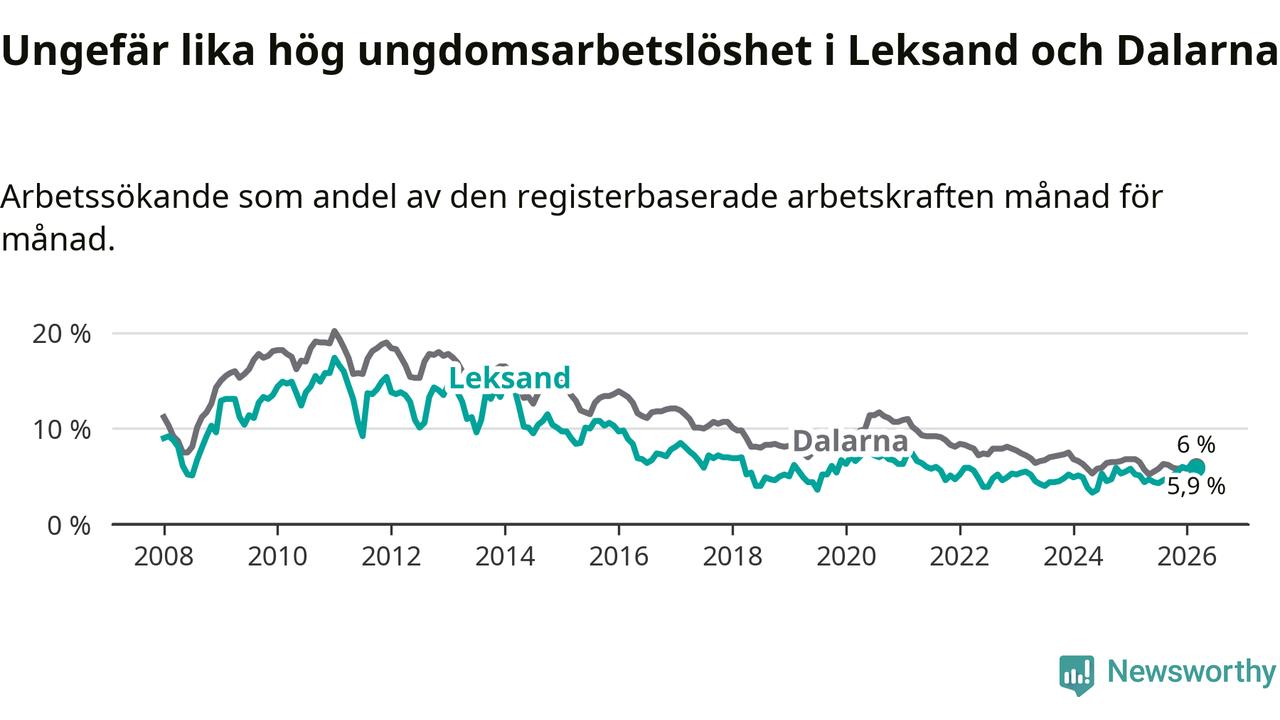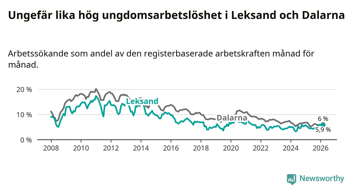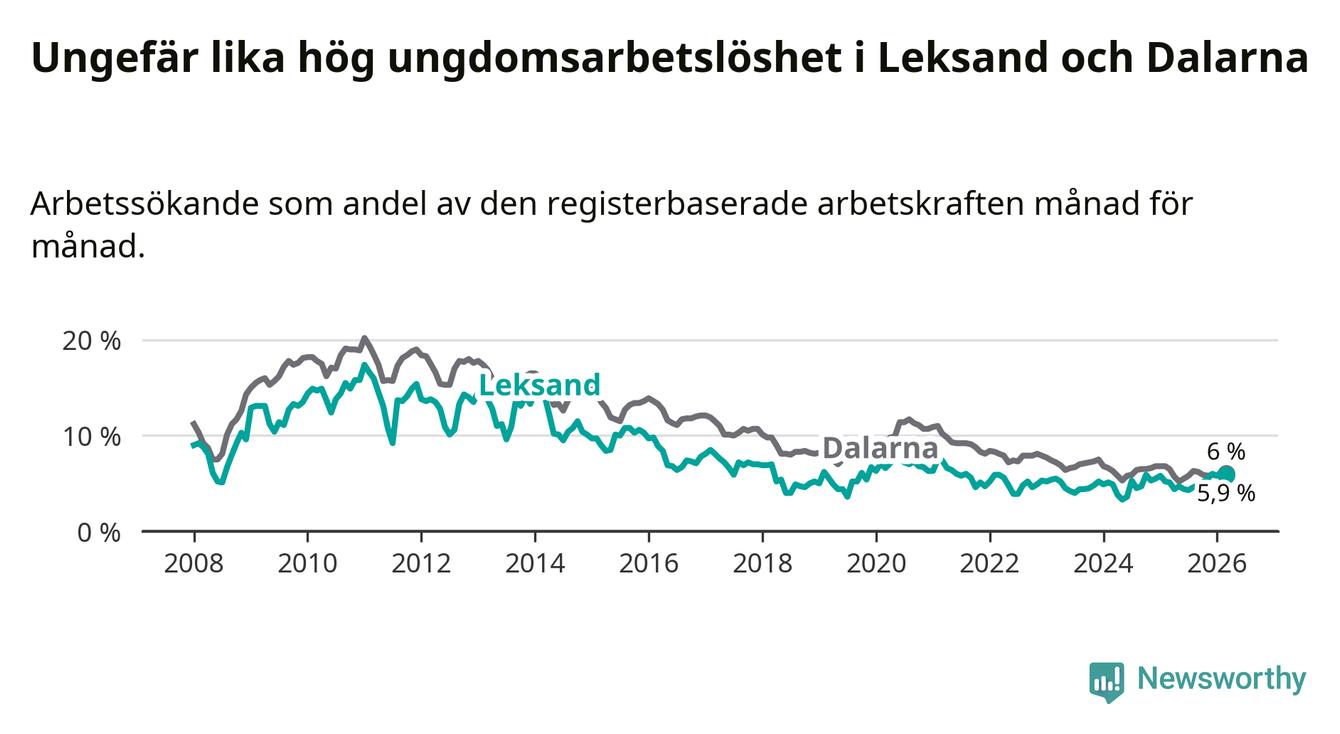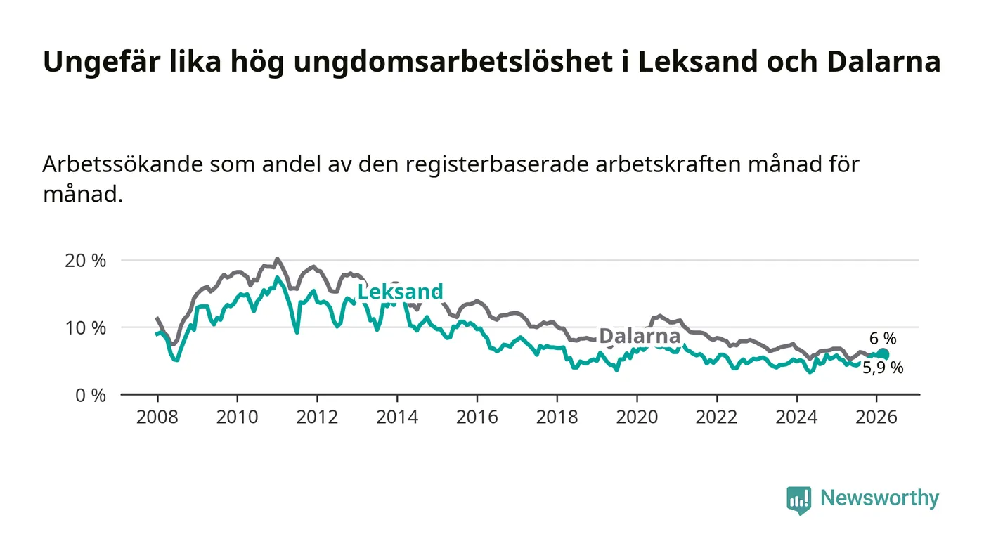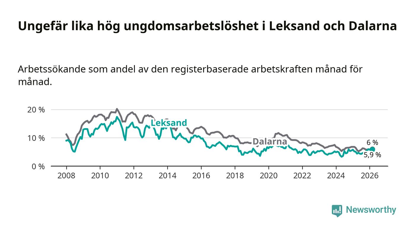 Medan Leksand har lägre total arbetslöshet än Dalarna, ligger ungdomsarbetslösheten på i stort sett samma nivå.