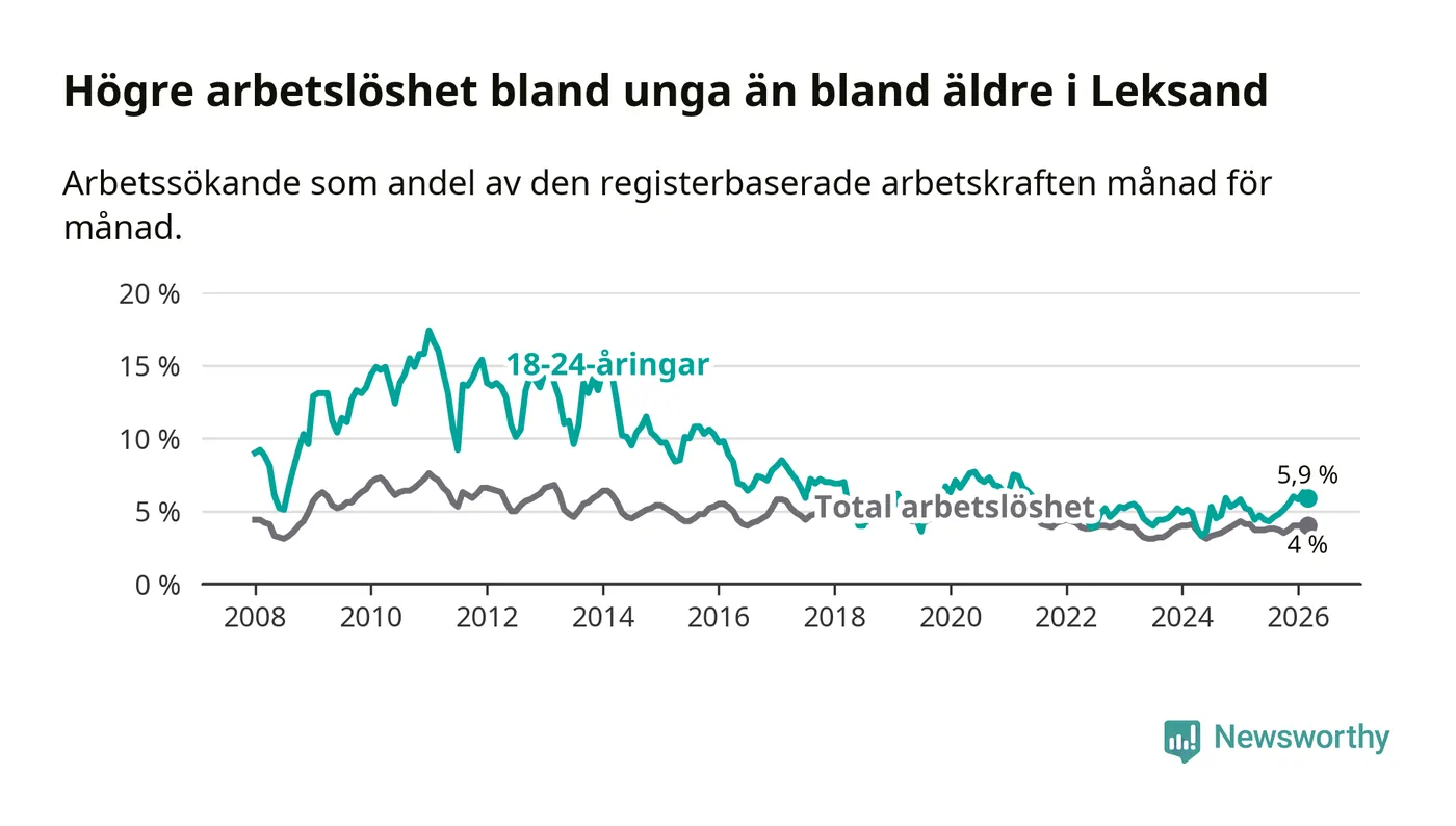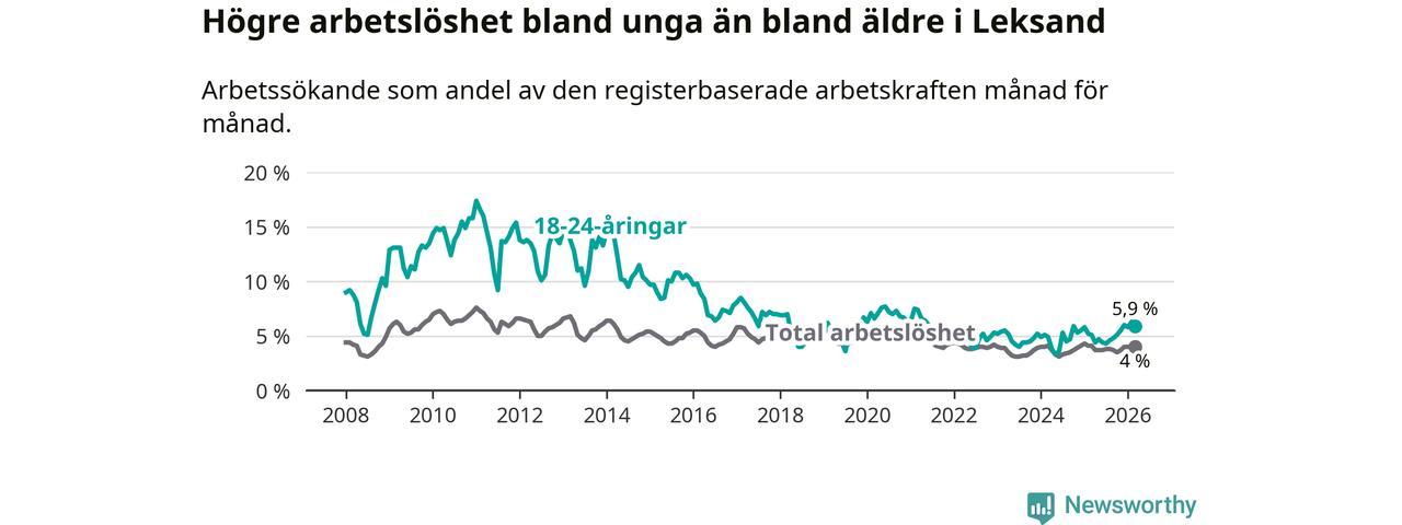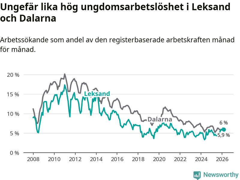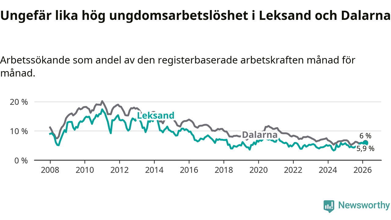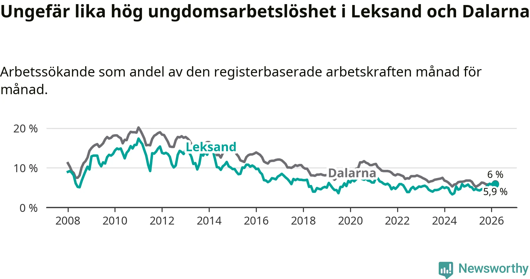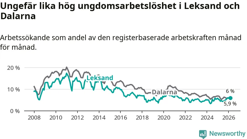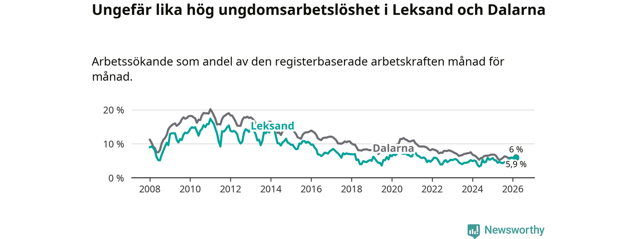 Medan Leksand har lägre total arbetslöshet än Dalarna, ligger ungdomsarbetslösheten på i stort sett samma nivå.