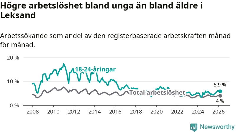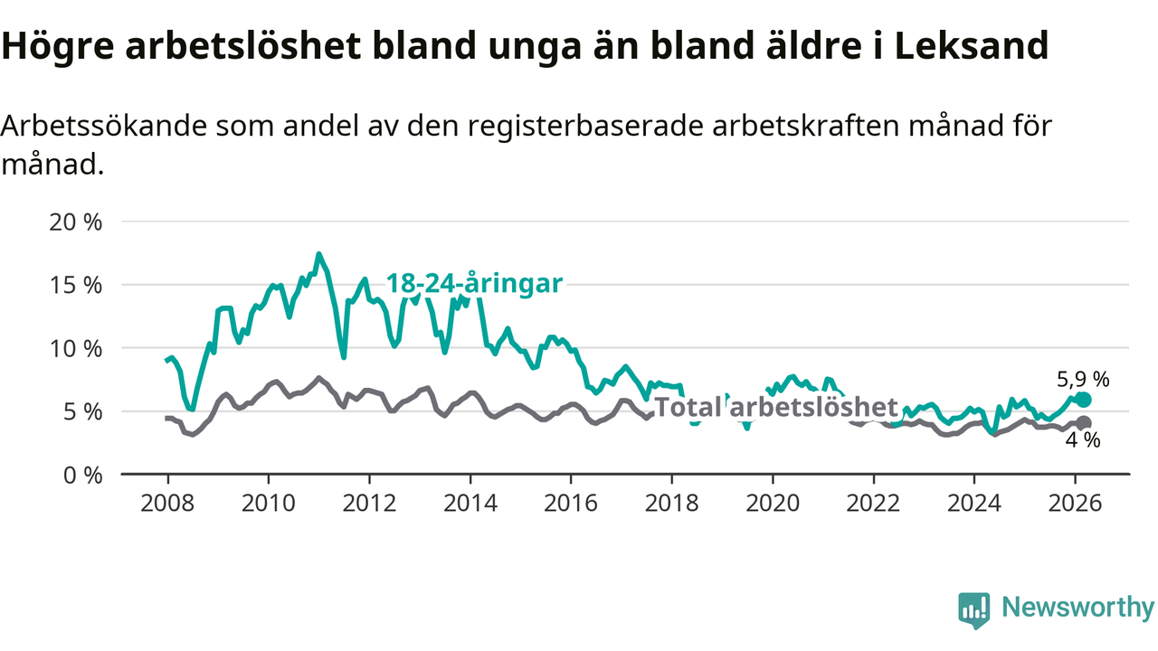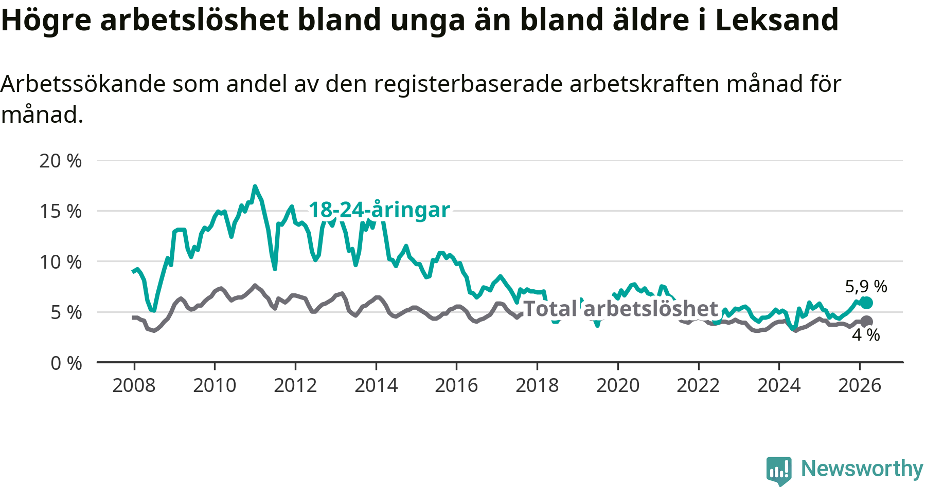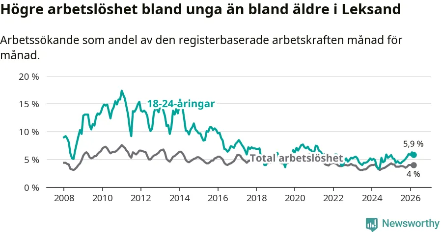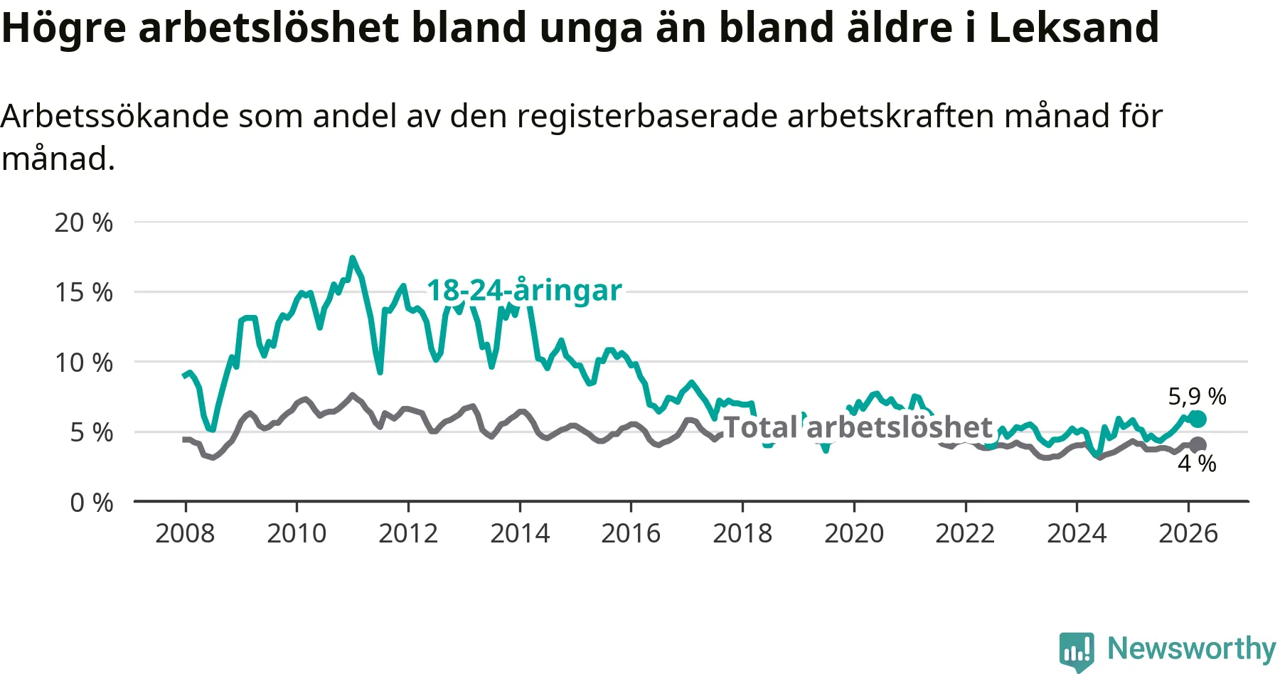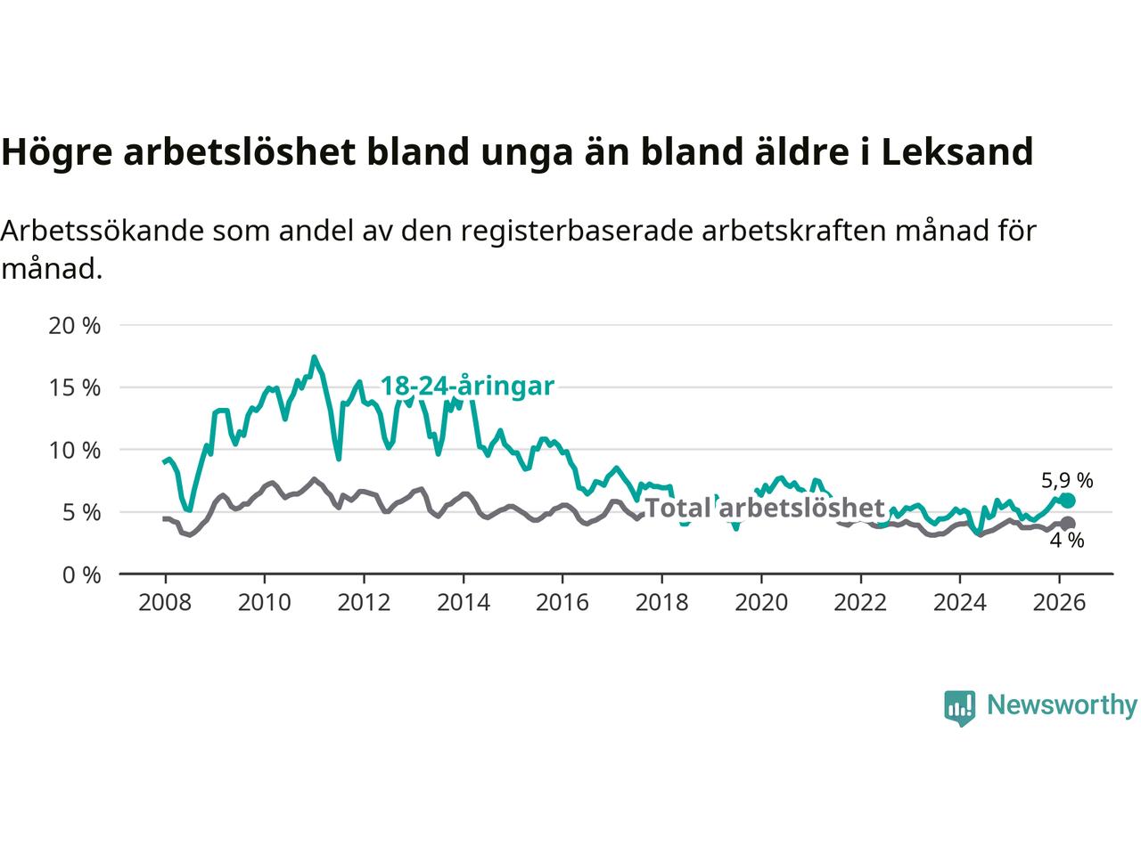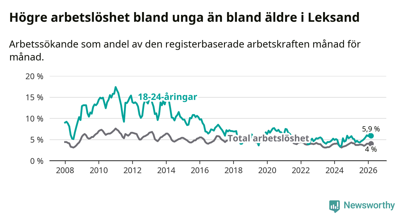 Medan Leksand har lägre total arbetslöshet än Dalarna, ligger ungdomsarbetslösheten på i stort sett samma nivå.