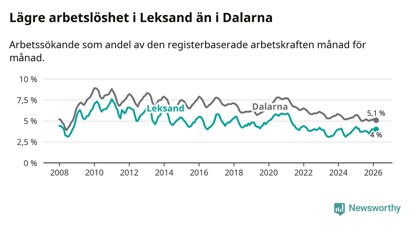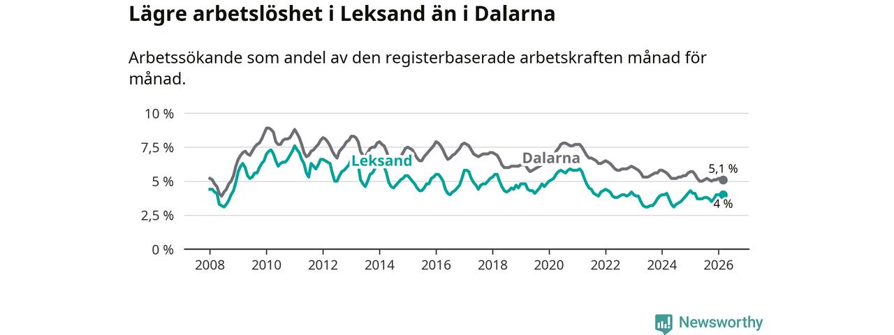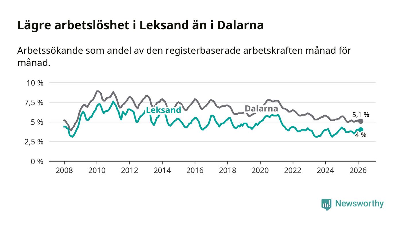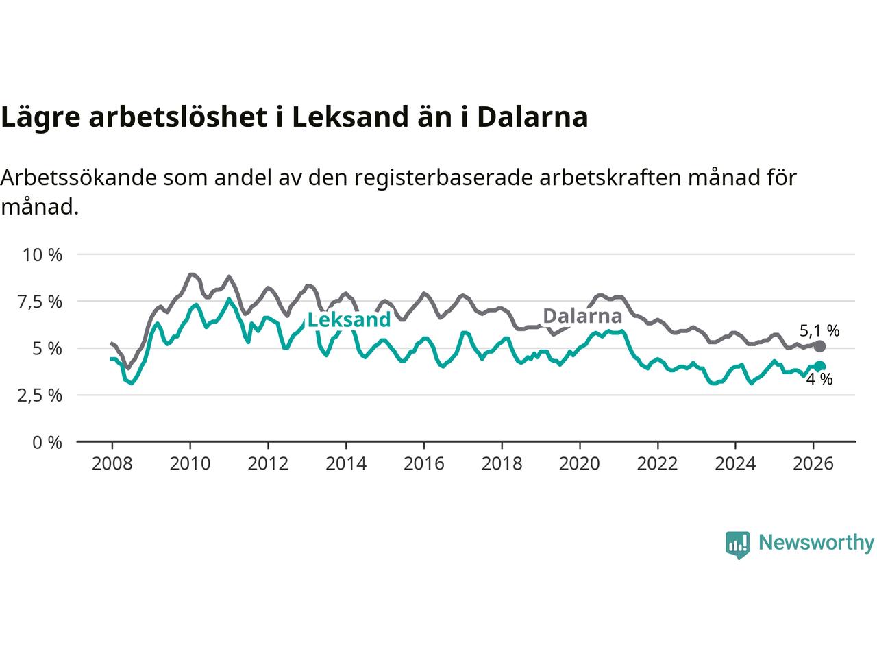 Under mars månad rapporterade Leksands kommun en total arbetslöshet på 4,0 procent. Det är en minskning jämfört med samma tidpunkt i fjol (−0,1 procentenheter). Även i Dalarnas län sjunker arbetslösheten .