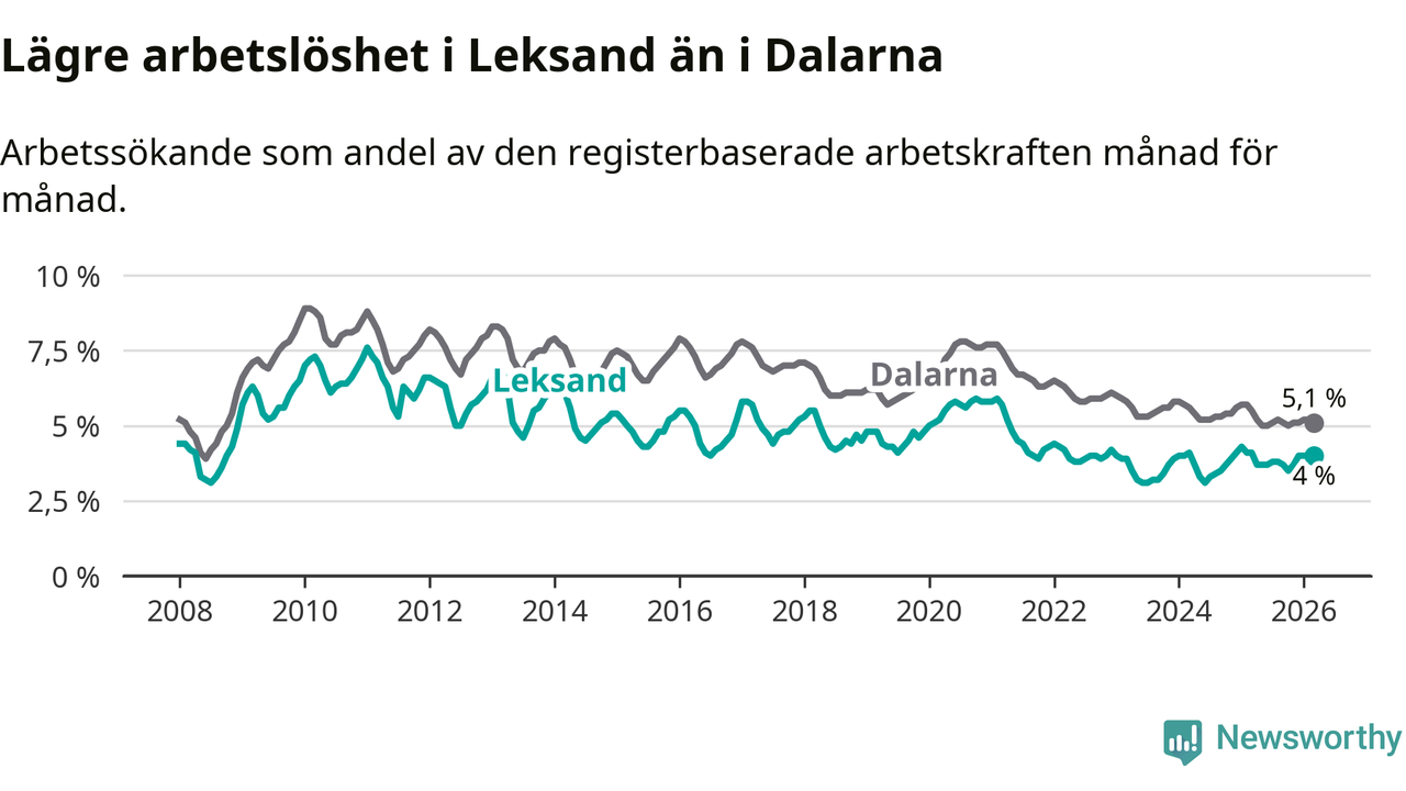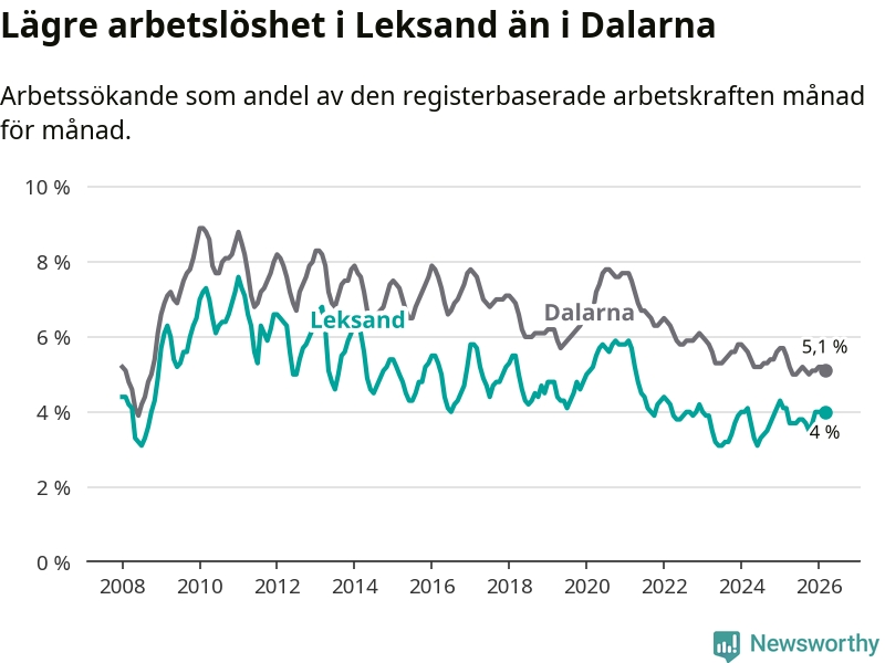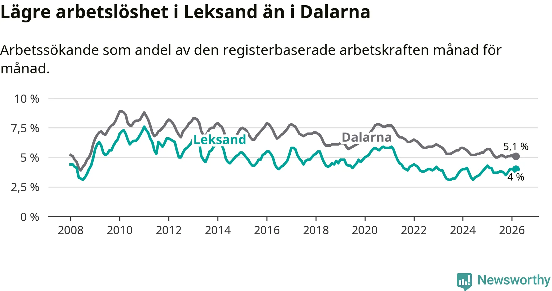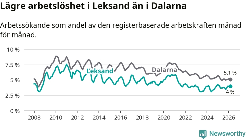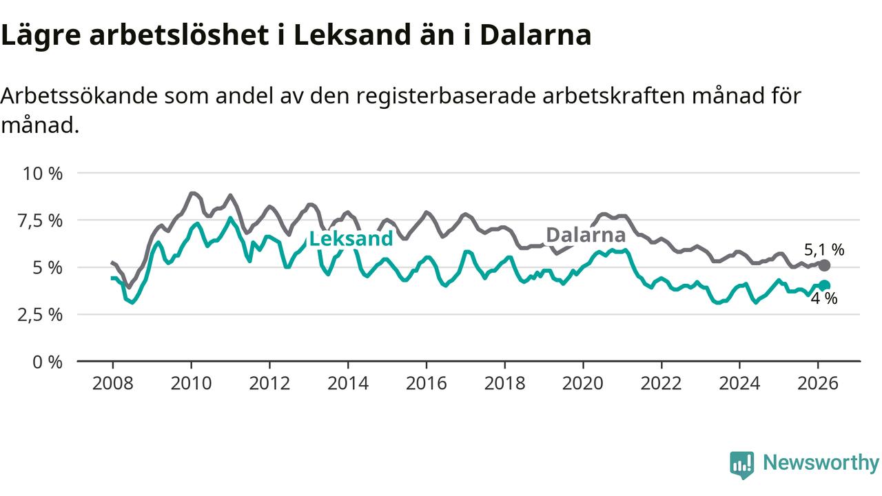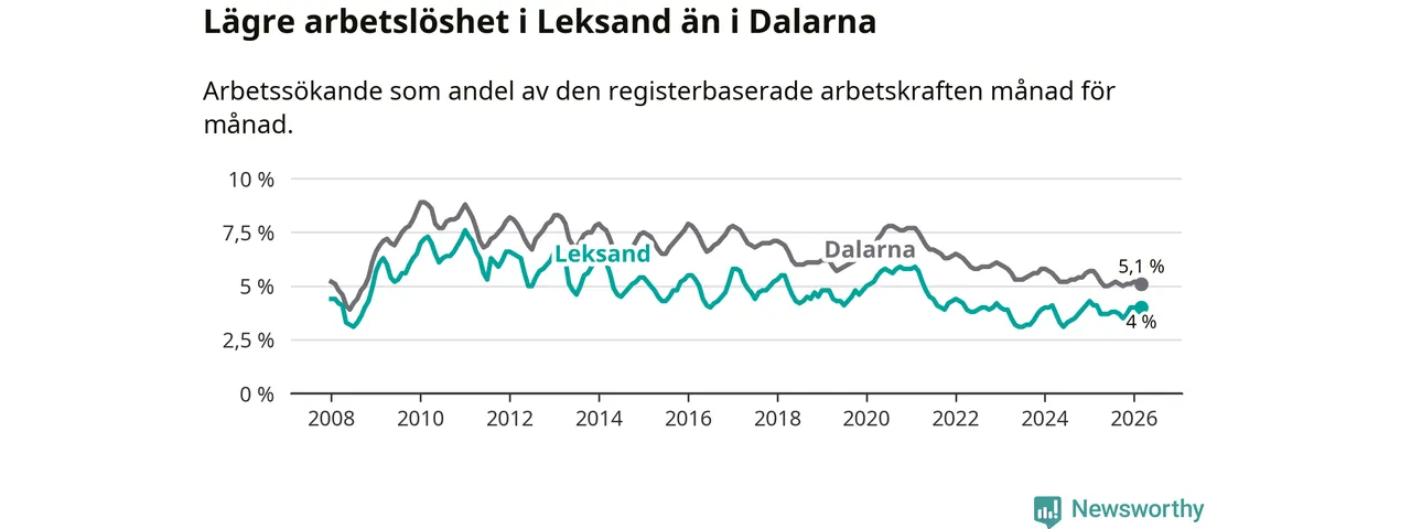 Under mars månad rapporterade Leksands kommun en total arbetslöshet på 4,0 procent. Det är en minskning jämfört med samma tidpunkt i fjol (−0,1 procentenheter). Även i Dalarnas län sjunker arbetslösheten .