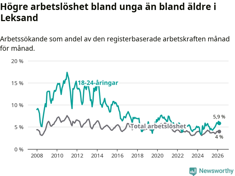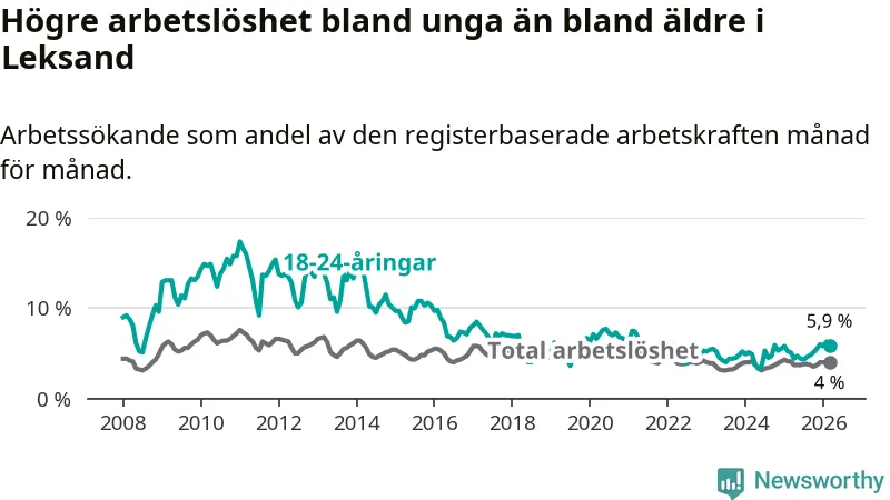 Till skillnad från den totala arbetslösheten stiger arbetslösheten bland unga (+0,8 procentenheter). I mars var 5,9 procent av 18–24-åringarna inskrivna som arbetssökande (motsvarande 37 personer). Mäter vi antalet inskrivna ser vi en ökning med fyra personer på ett års sikt.