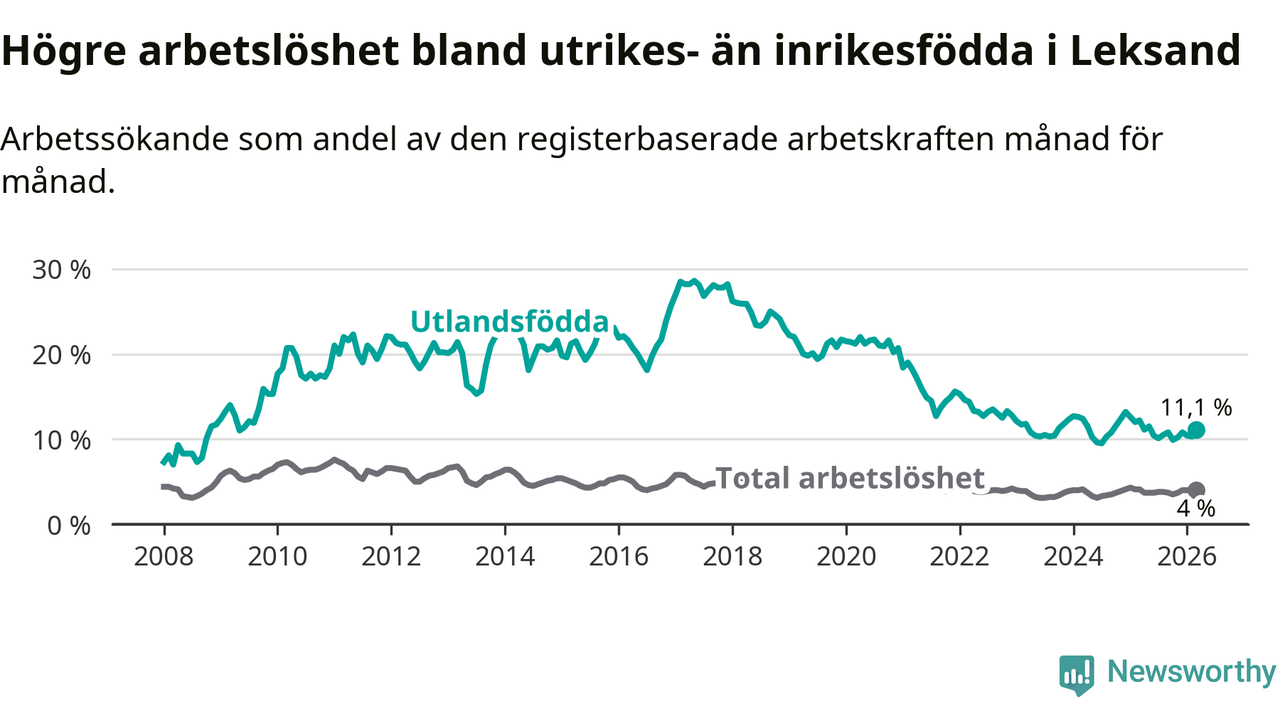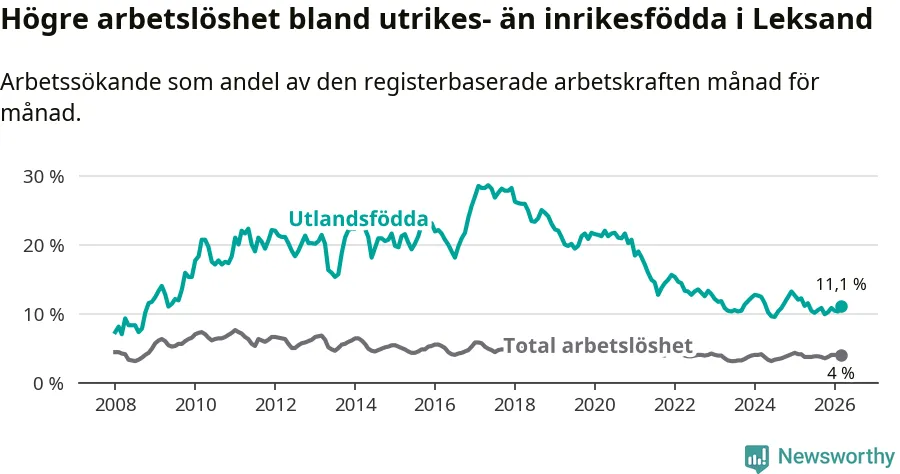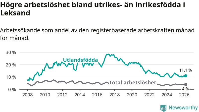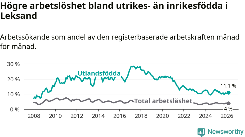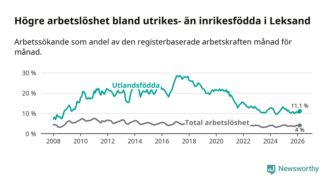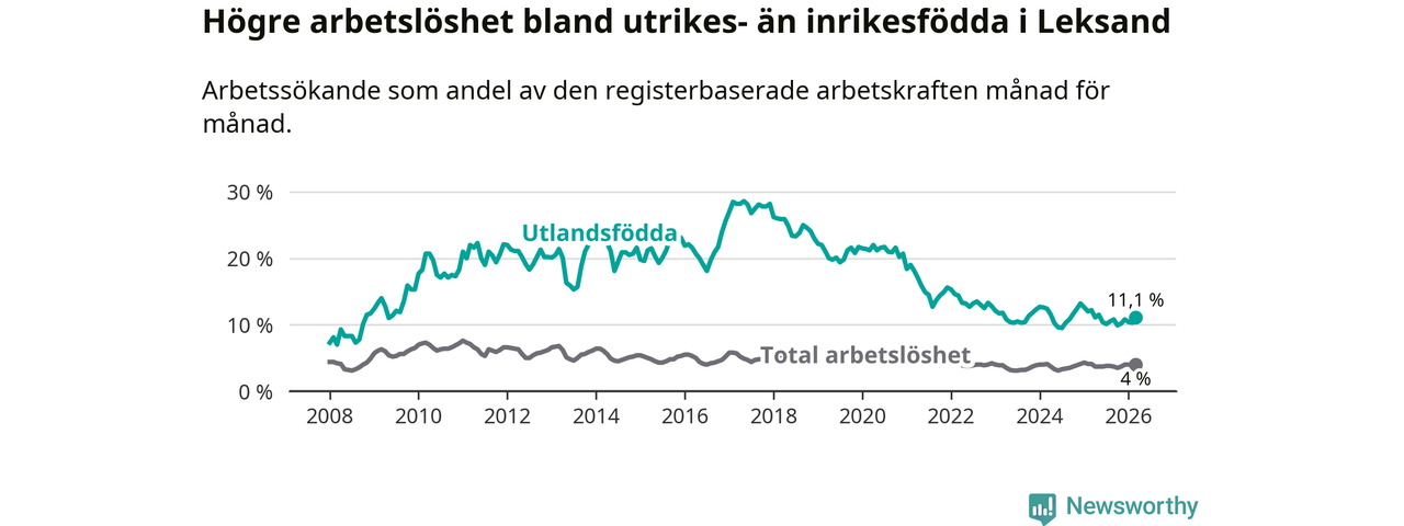 Skillnaden i arbetslöshet mellan utrikesfödda och hela befolkningen är 7,1 procentenheter i Leksand. Det är en mindre skillnad än för ett år sedan (−1,0 procentenheter).