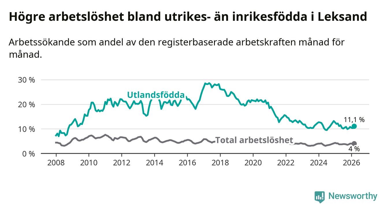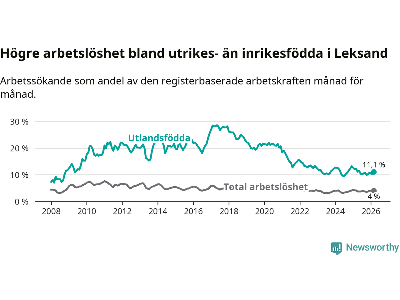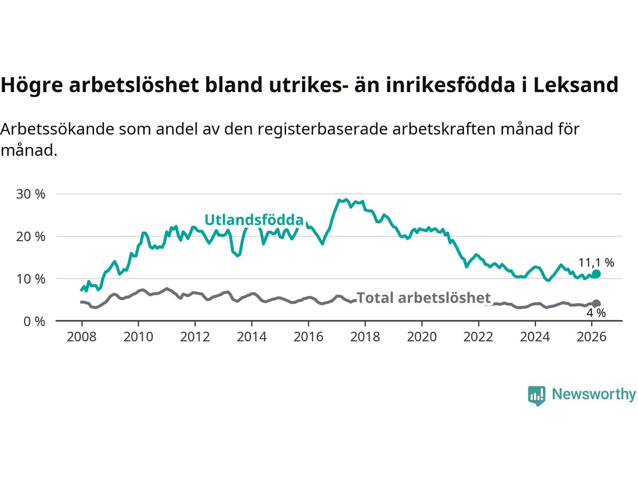 Arbetslösheten bland utlandsfödda var 11,1 procent i Leksand under mars månad, motsvarande 95 av 856 personer. Det är 1,1 procentenheter färre än vid samma tidpunkt i fjol (−7 om man räknar personer). Därmed är de utlandsföddas arbetslöshet lägre än vid samma tidpunkt i fjol för sjätte månaden i följd.