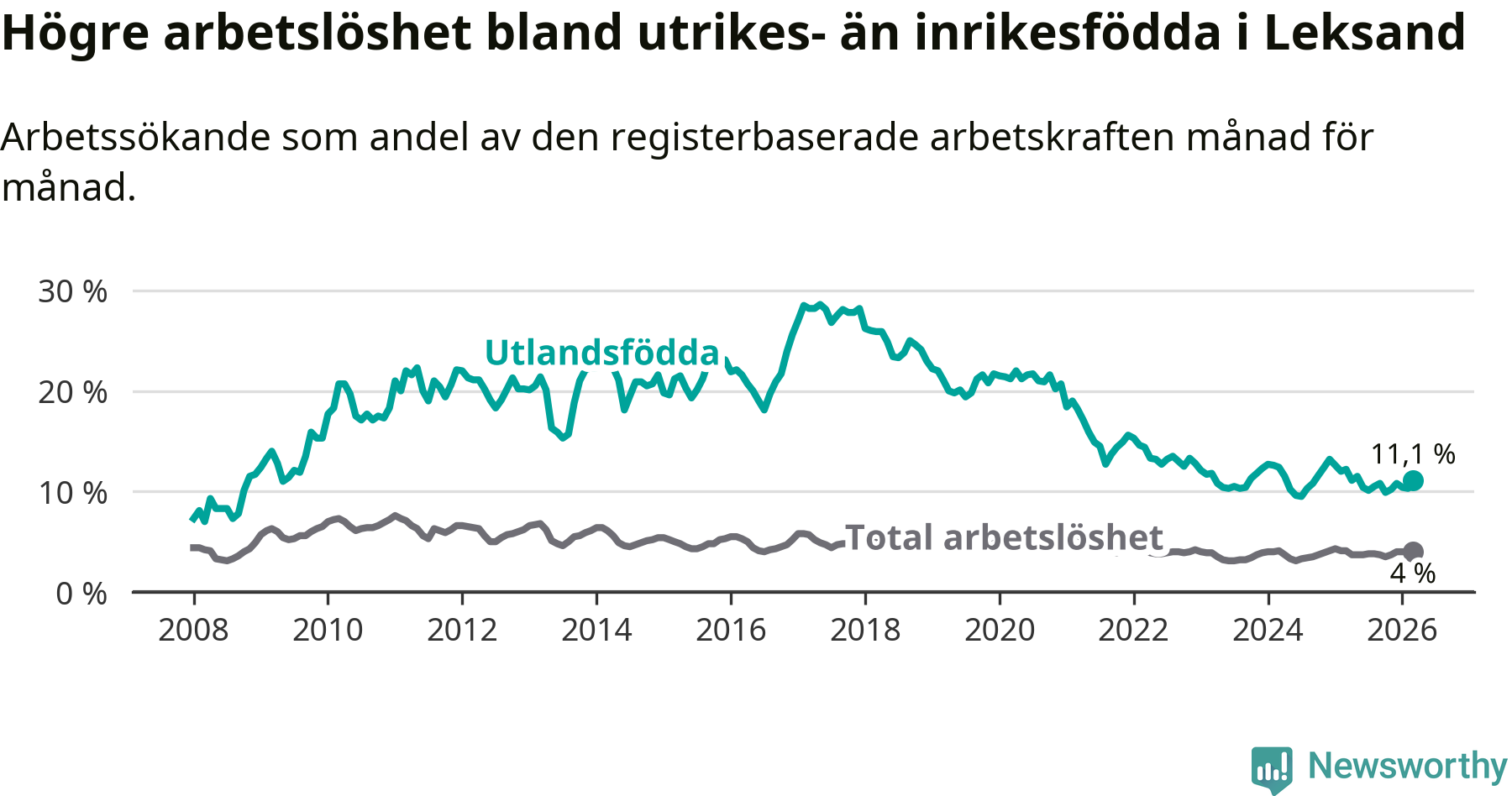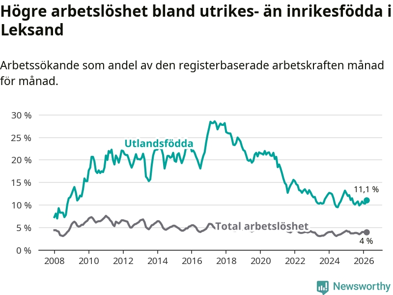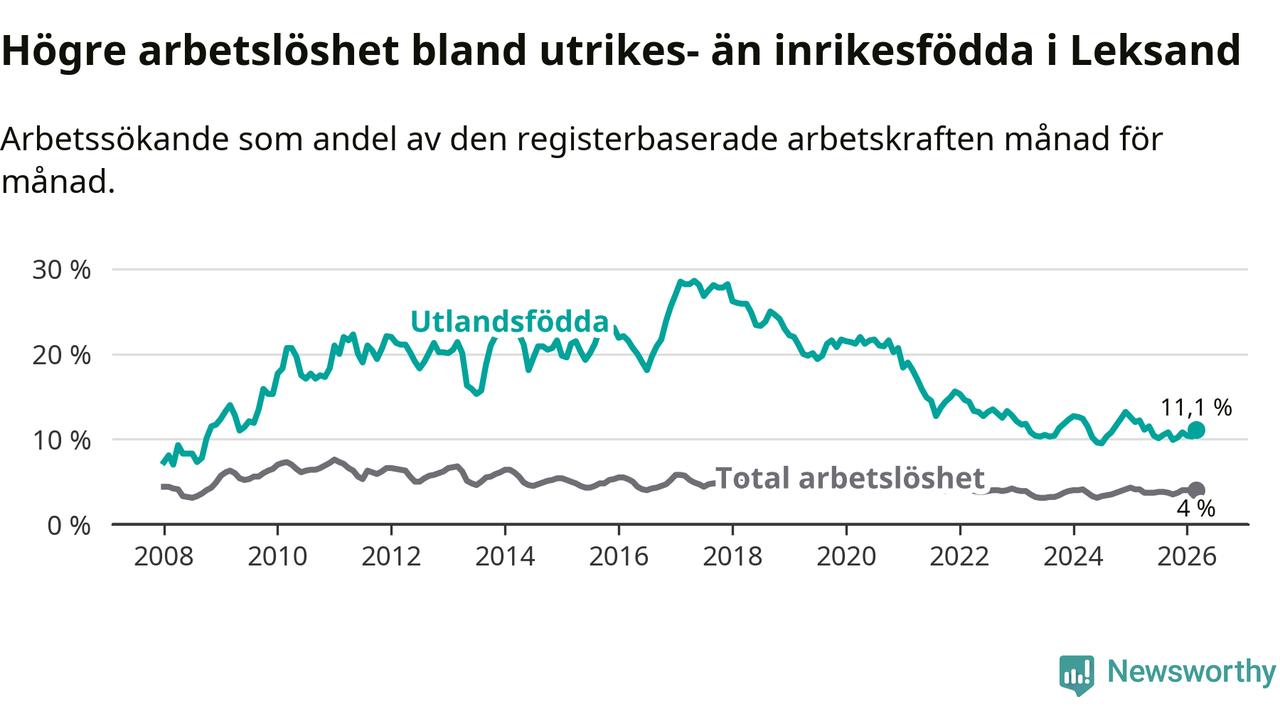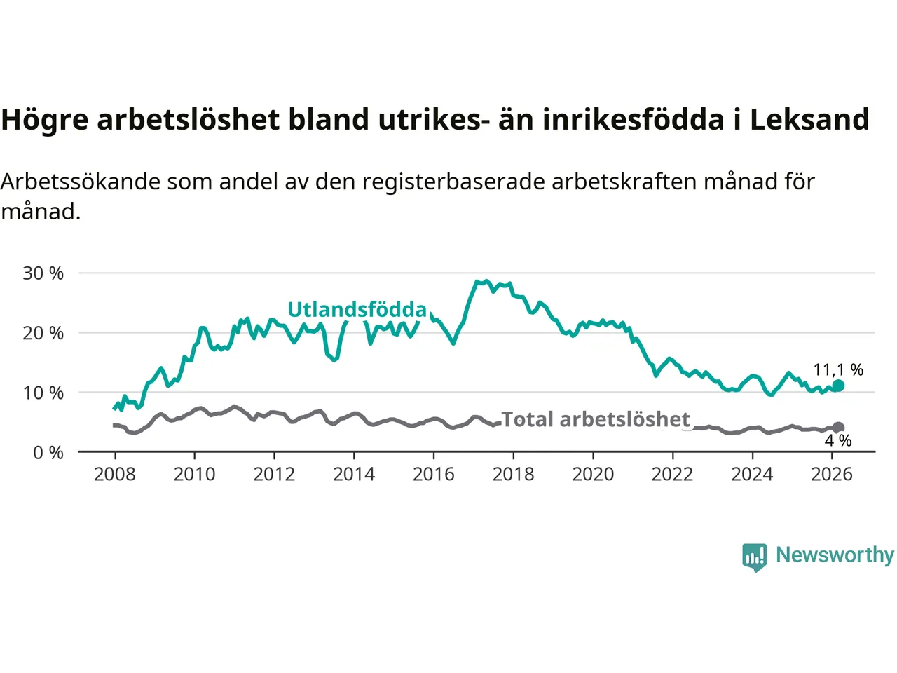 Arbetslösheten bland utlandsfödda var 11,1 procent i Leksand under mars månad, motsvarande 95 av 856 personer. Det är 1,1 procentenheter färre än vid samma tidpunkt i fjol (−7 om man räknar personer). Därmed är de utlandsföddas arbetslöshet lägre än vid samma tidpunkt i fjol för sjätte månaden i följd.