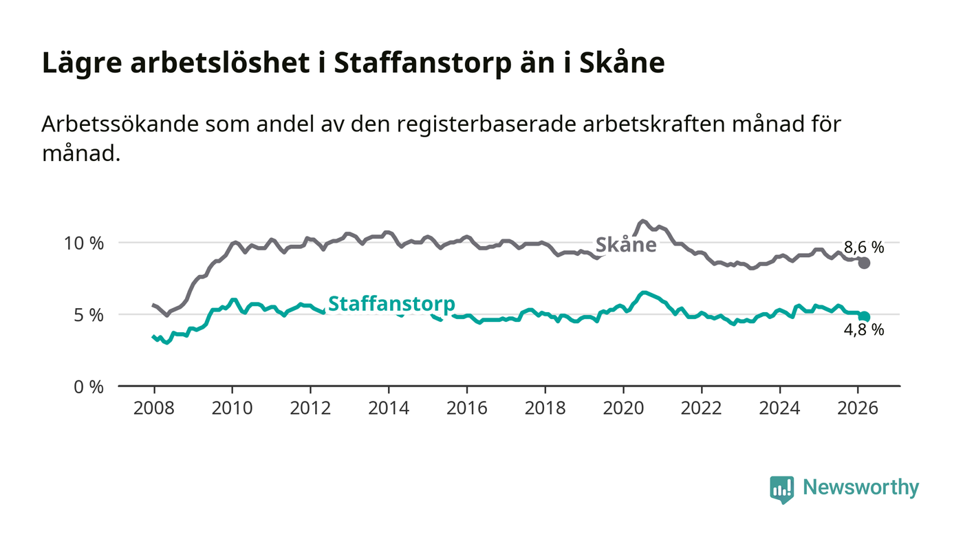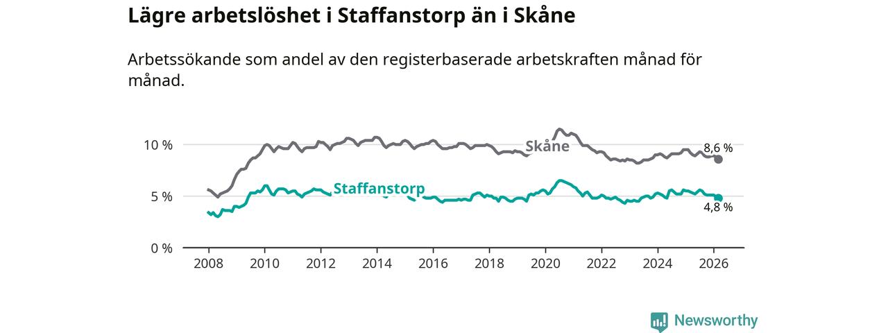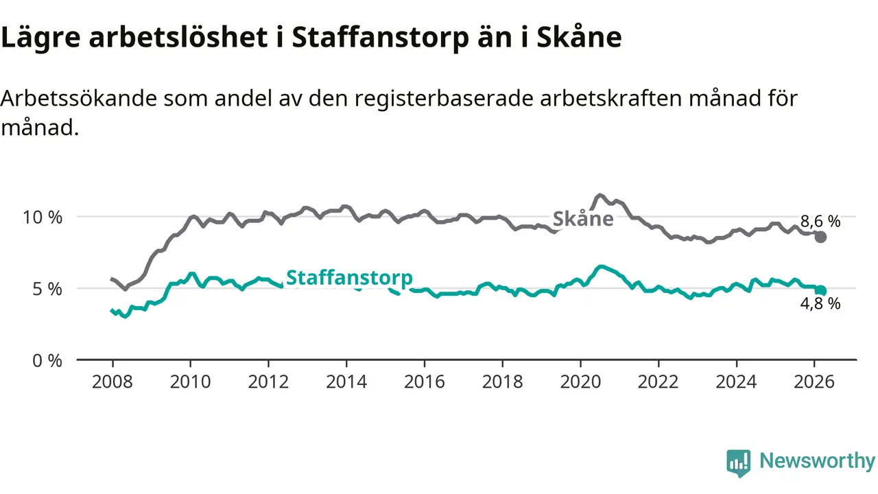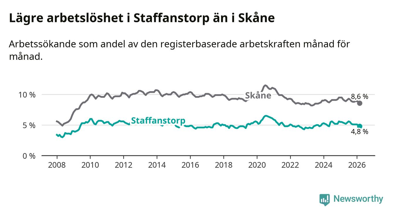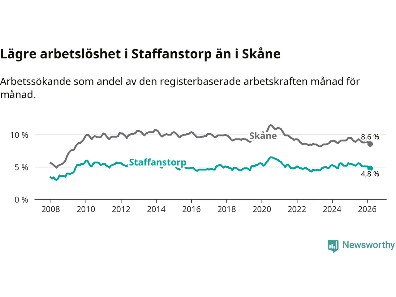 Under mars månad rapporterade Staffanstorps kommun en total arbetslöshet på 4,8 procent. Det är en minskning jämfört med samma tidpunkt i fjol (−0,6 procentenheter). Även i Skåne län sjunker arbetslösheten .