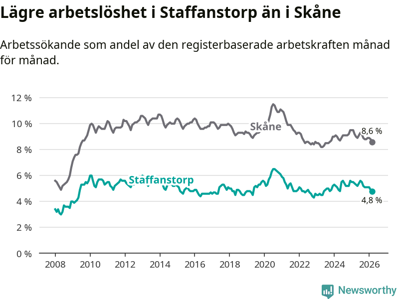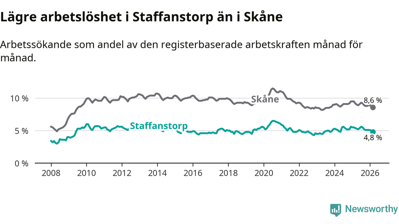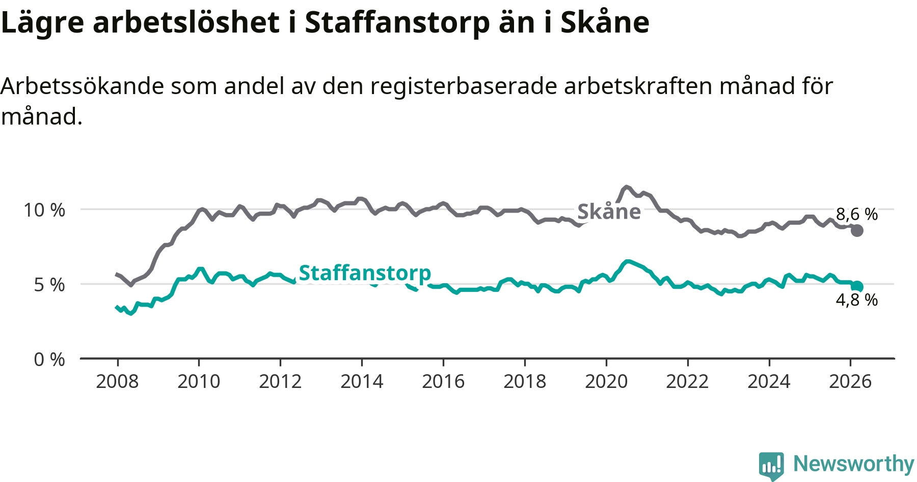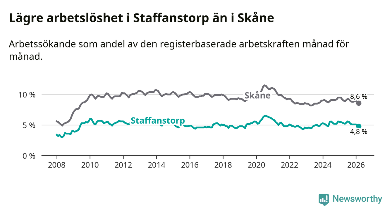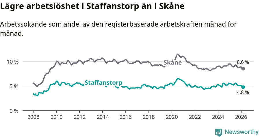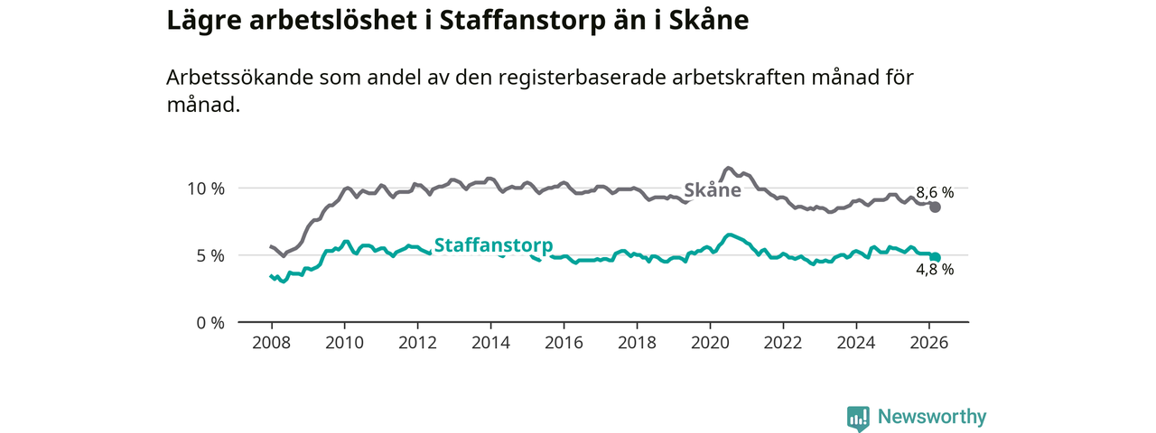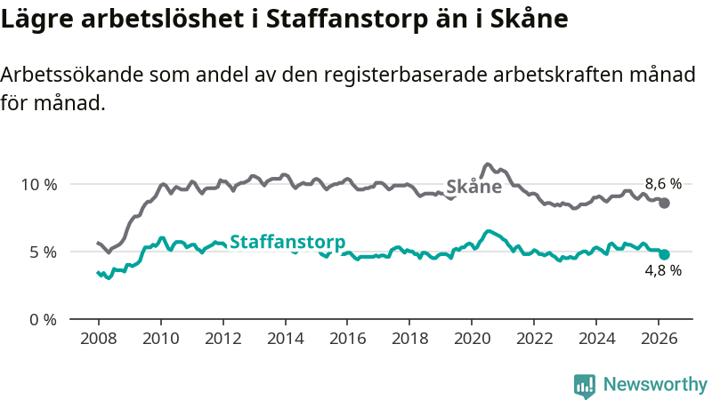 Under mars månad rapporterade Staffanstorps kommun en total arbetslöshet på 4,8 procent. Det är en minskning jämfört med samma tidpunkt i fjol (−0,6 procentenheter). Även i Skåne län sjunker arbetslösheten .