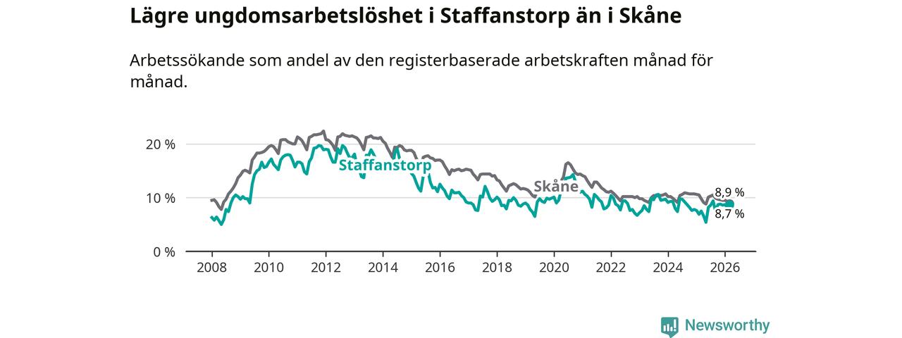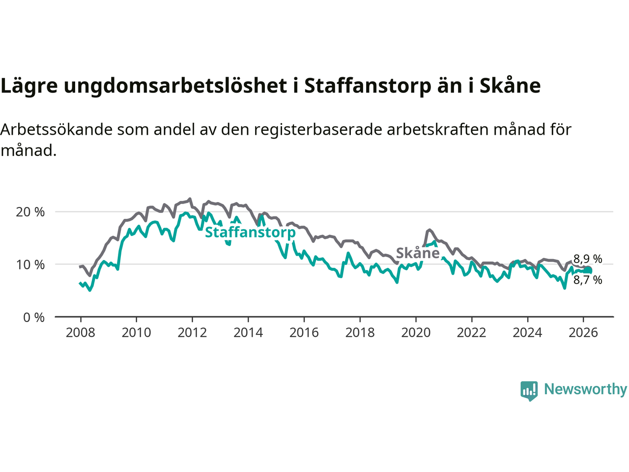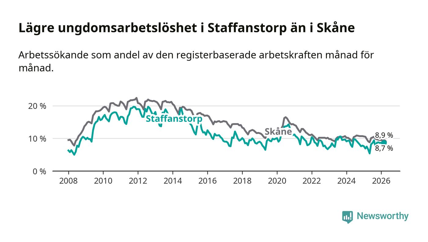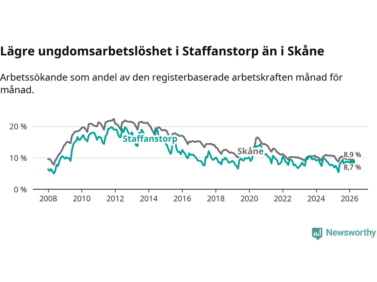 Precis som den totala arbetslösheten ligger ungdomsarbetslösheten i Staffanstorp lägre än i Skåne som helhet. Skillnaden mellan kommunen och länet är 0,2 procentenheter.