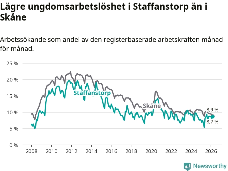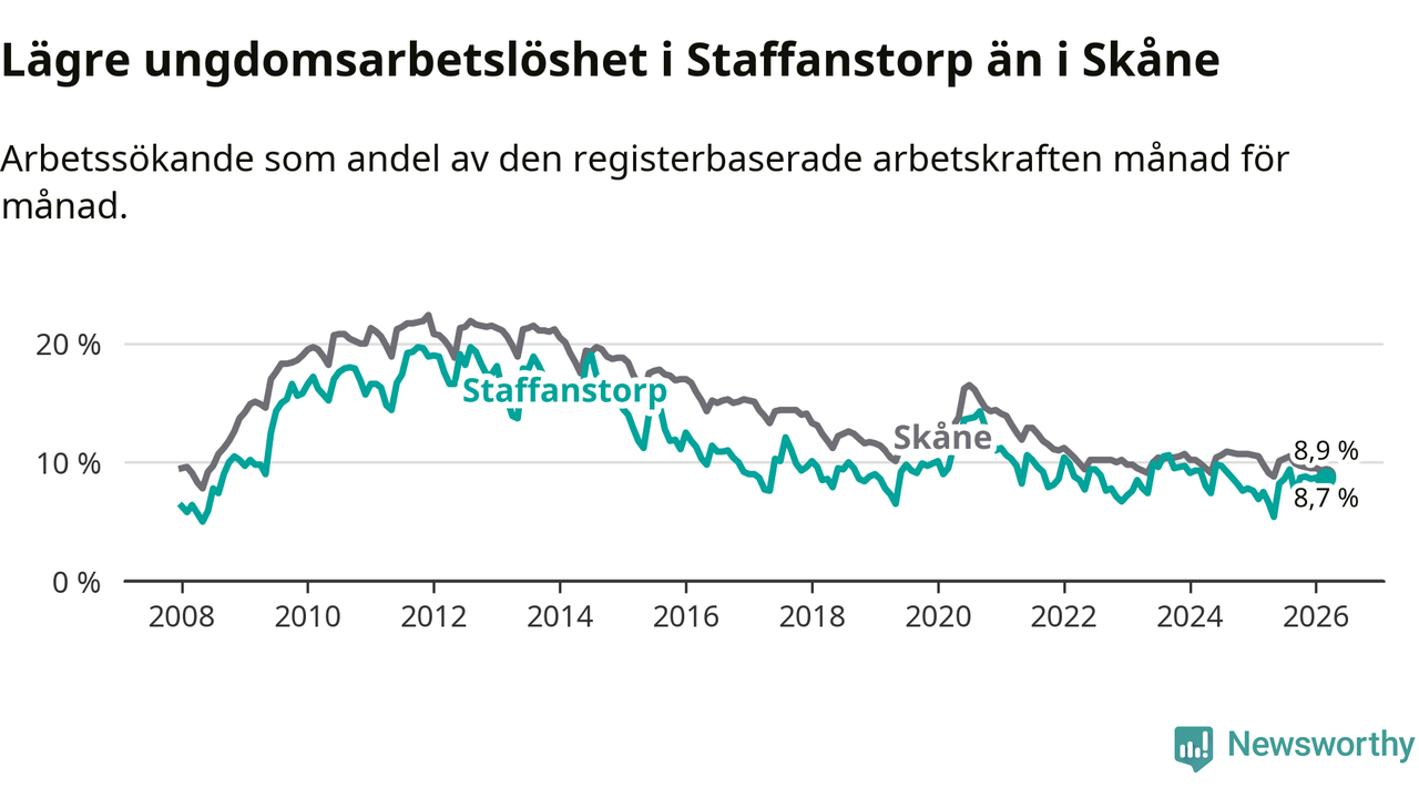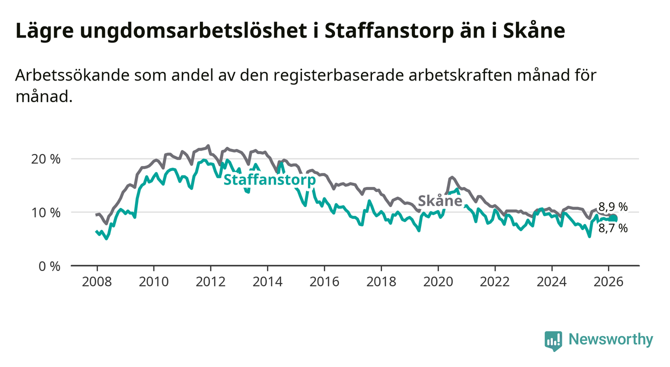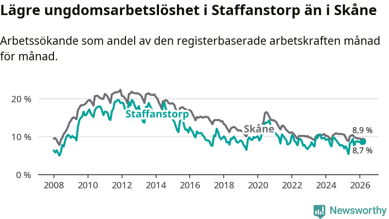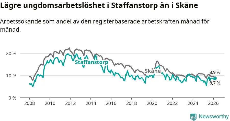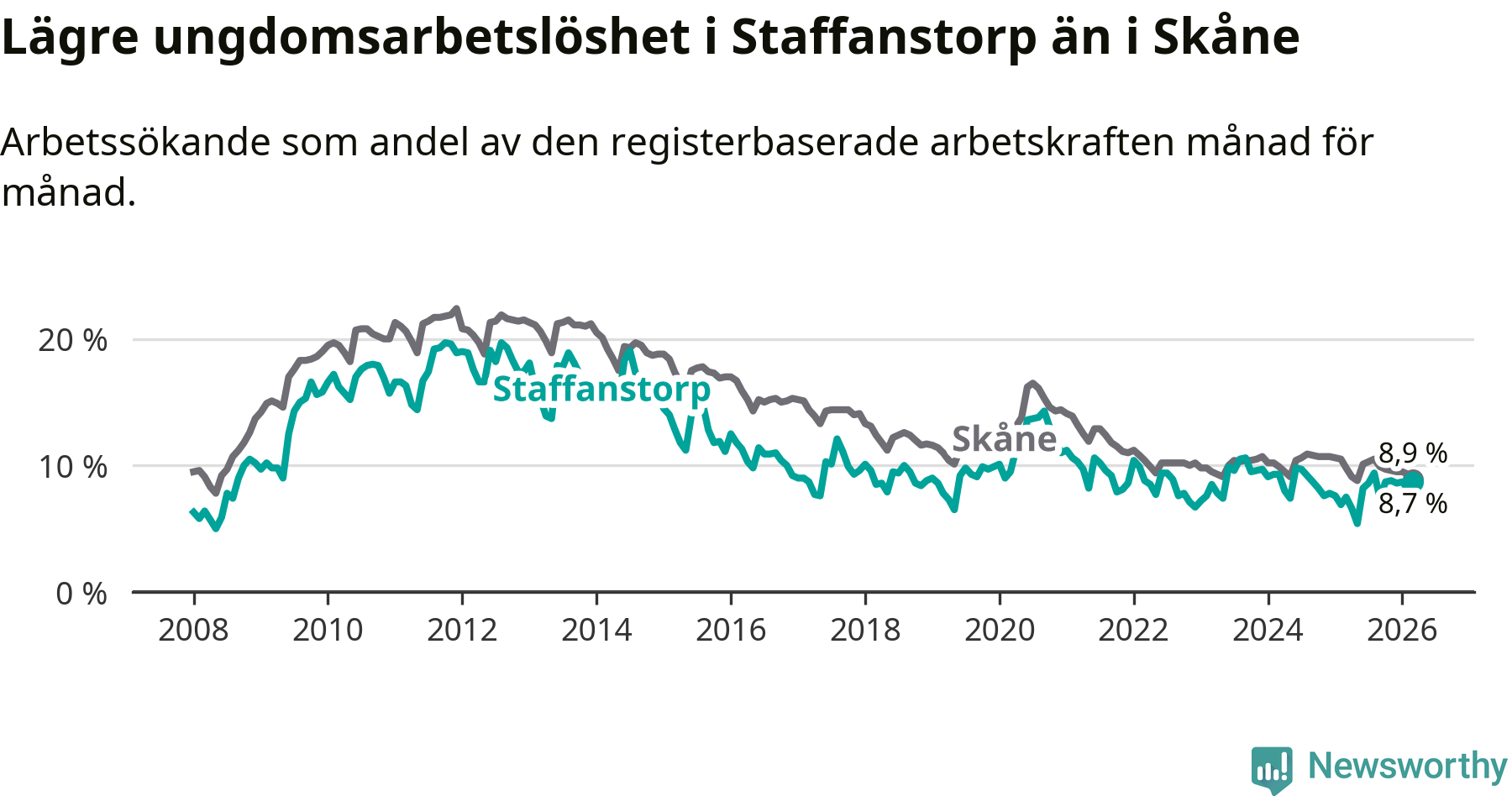 Precis som den totala arbetslösheten ligger ungdomsarbetslösheten i Staffanstorp lägre än i Skåne som helhet. Skillnaden mellan kommunen och länet är 0,2 procentenheter.