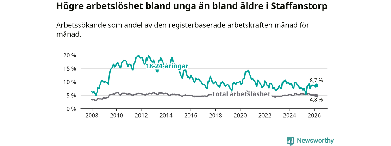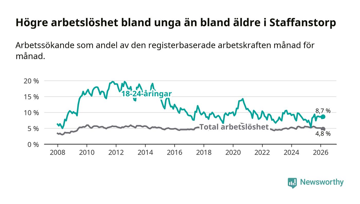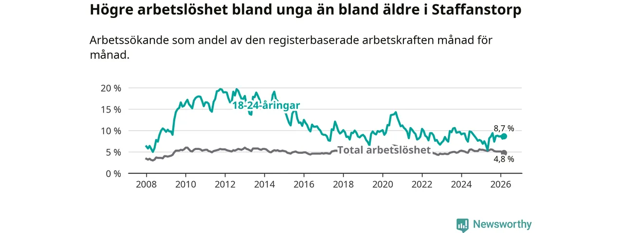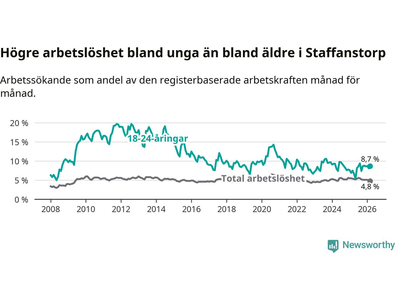 Den senaste månadsstatistiken från Arbetsförmedlingen visar på en uppgång i ungdomsarbetslöshet i Staffanstorps kommun med 1,2 procentenheter. Arbetslösheten bland personer i åldern 18–24 år låg i mars på 8,7 procent.