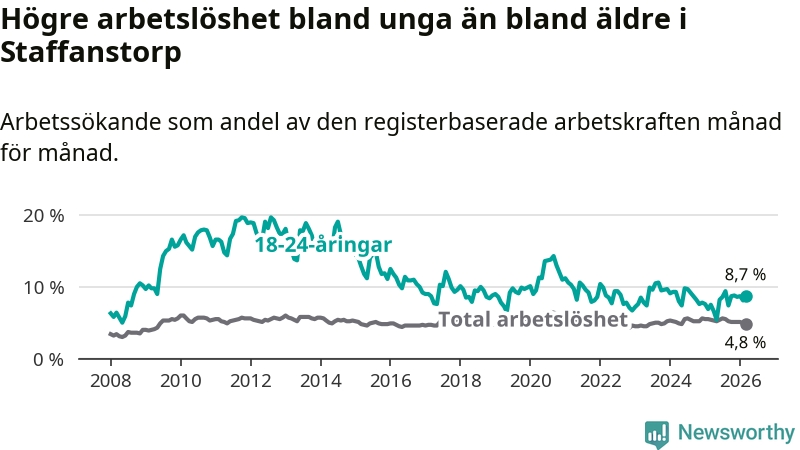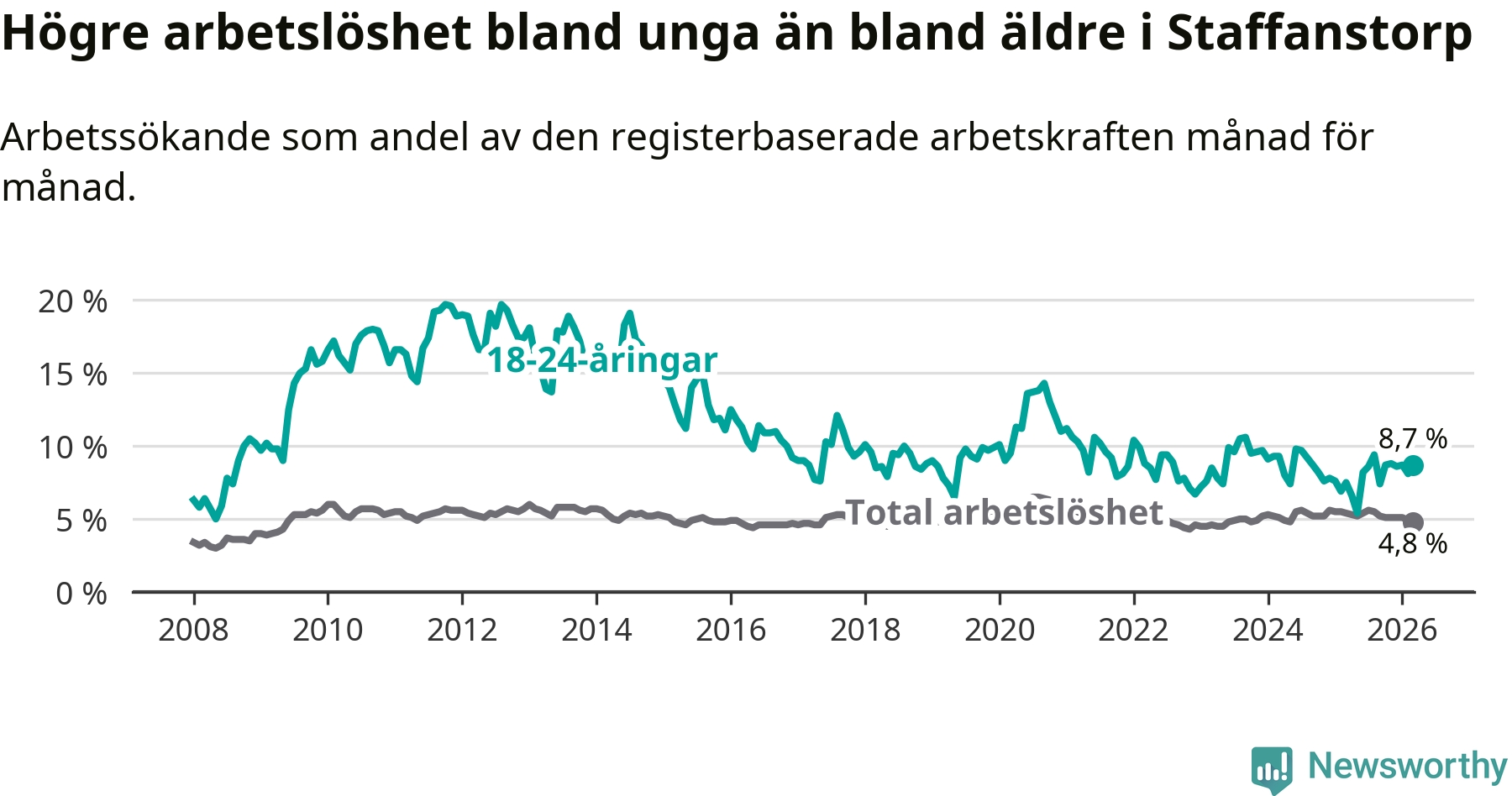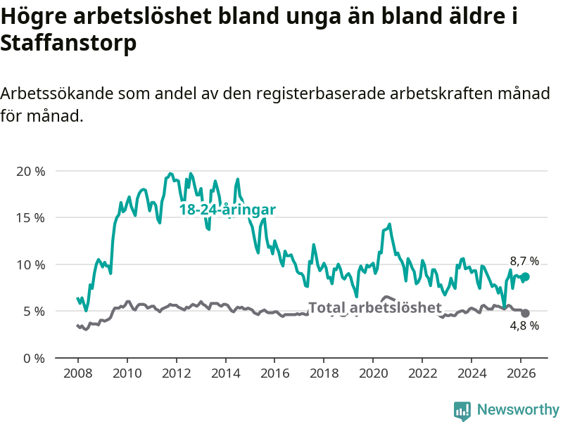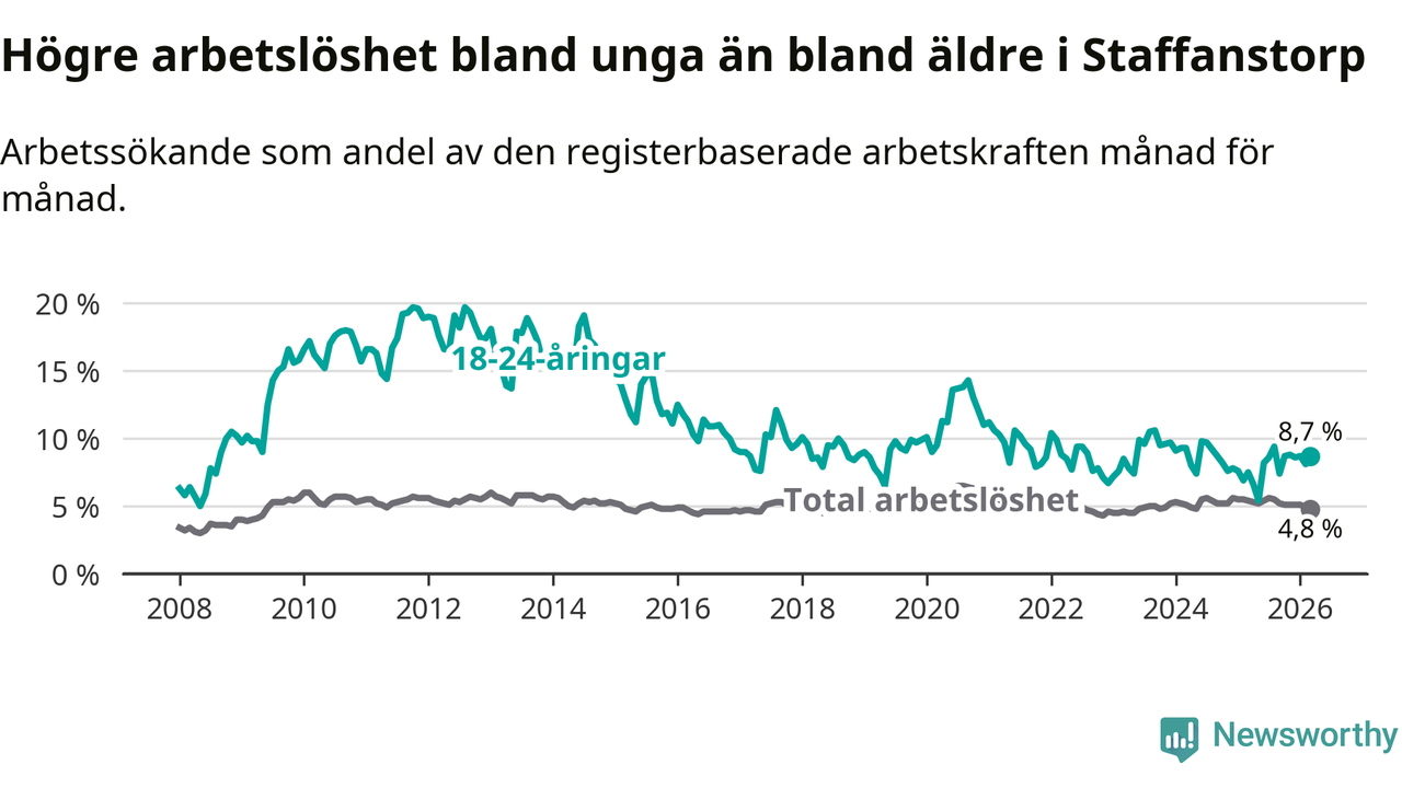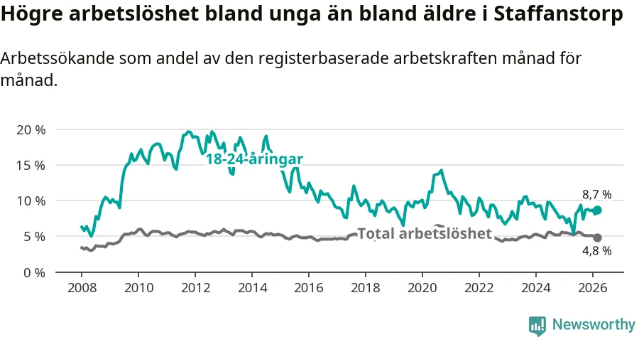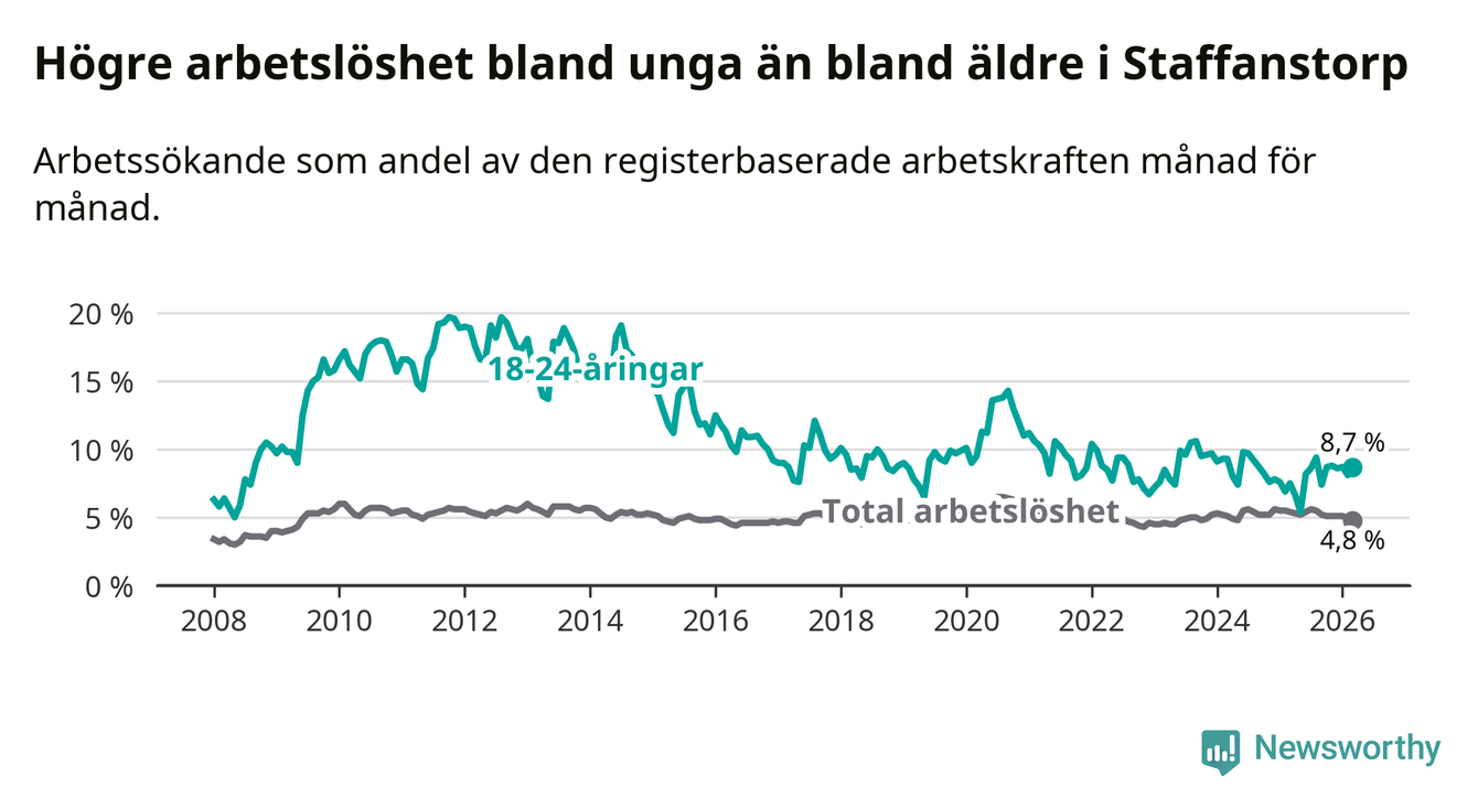 Den senaste månadsstatistiken från Arbetsförmedlingen visar på en uppgång i ungdomsarbetslöshet i Staffanstorps kommun med 1,2 procentenheter. Arbetslösheten bland personer i åldern 18–24 år låg i mars på 8,7 procent.