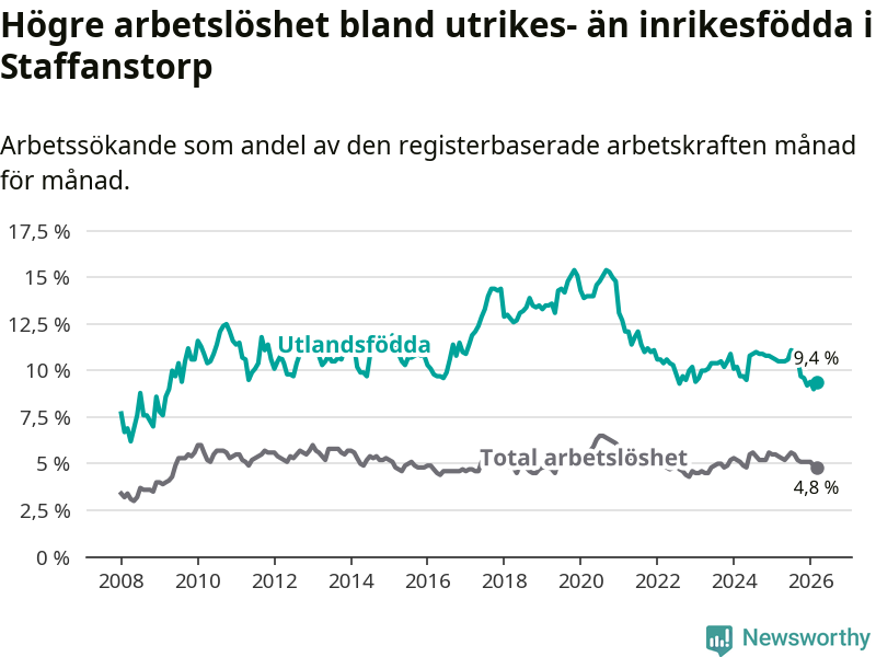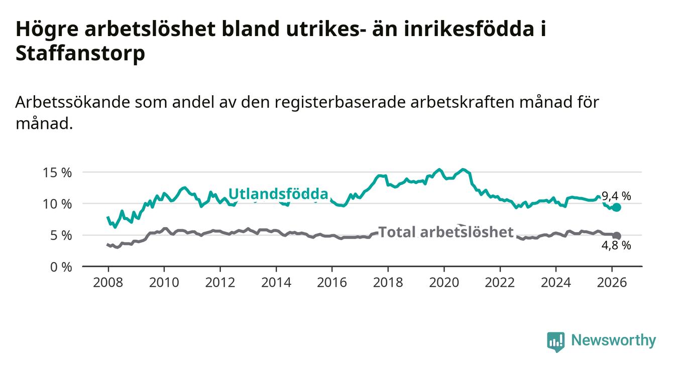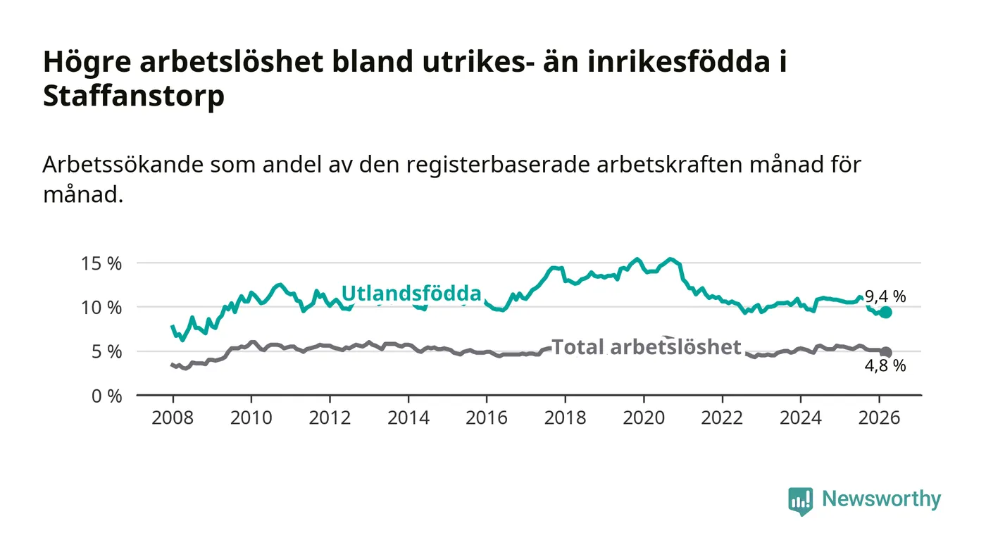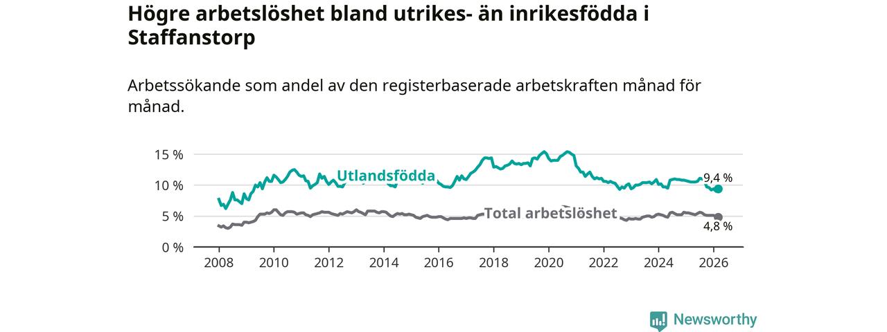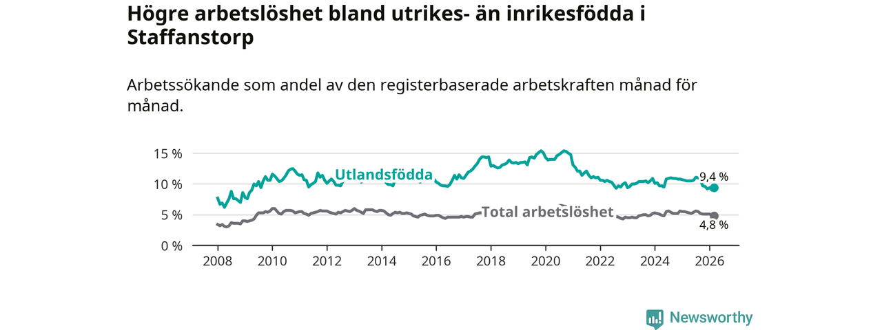 Arbetslösheten bland utlandsfödda var 9,4 procent i Staffanstorp under mars månad, motsvarande 270 av 2 872 personer. Det är 1,1 procentenheter färre än vid samma tidpunkt i fjol (−22 om man räknar personer). Därmed är de utlandsföddas arbetslöshet lägre än vid samma tidpunkt i fjol för sjunde månaden i följd. Sedan augusti 2025 har arbetslösheten bland utlandsfödda minskat från 11,0 till 9,4 procent.