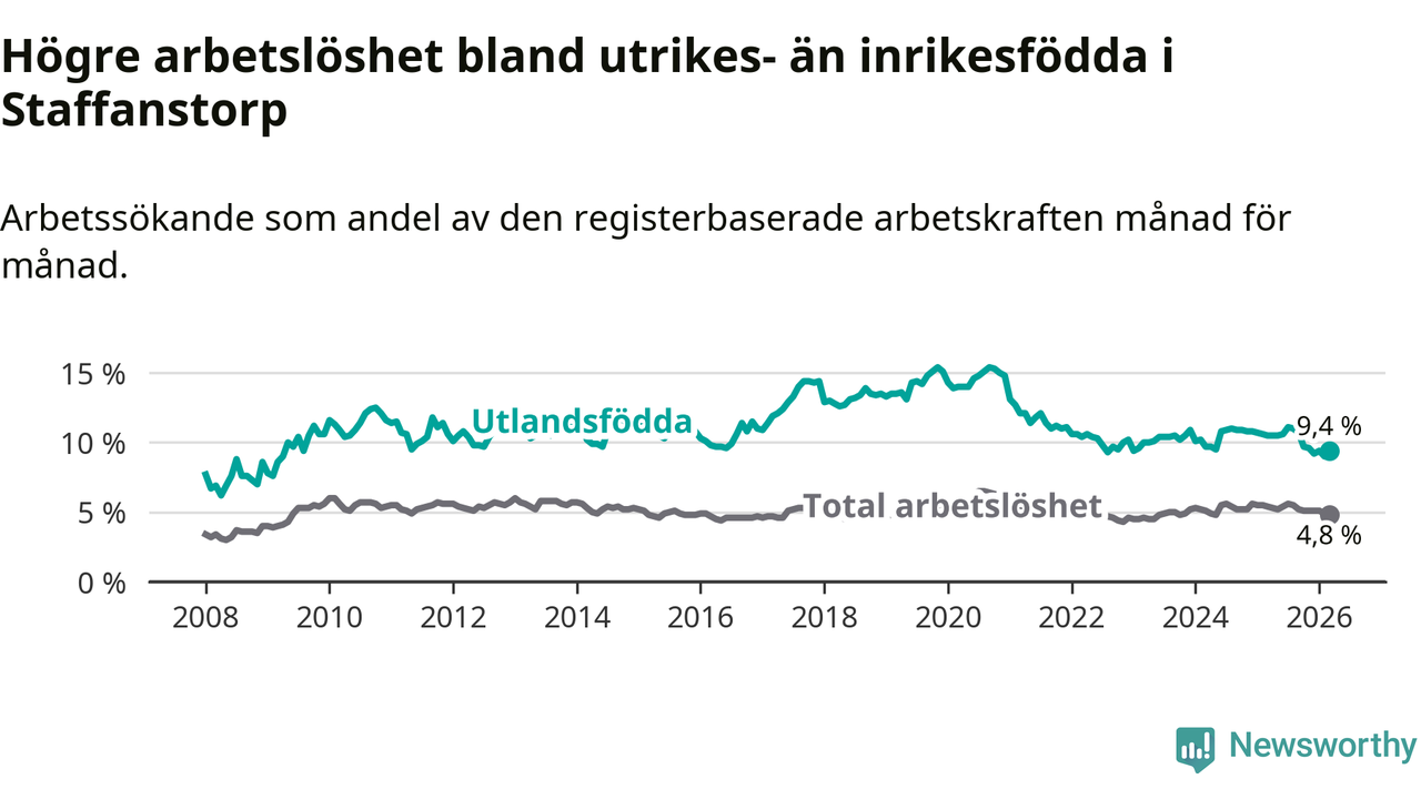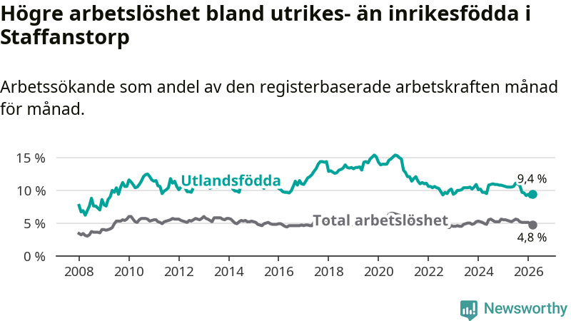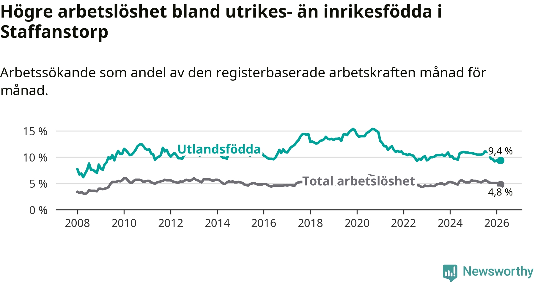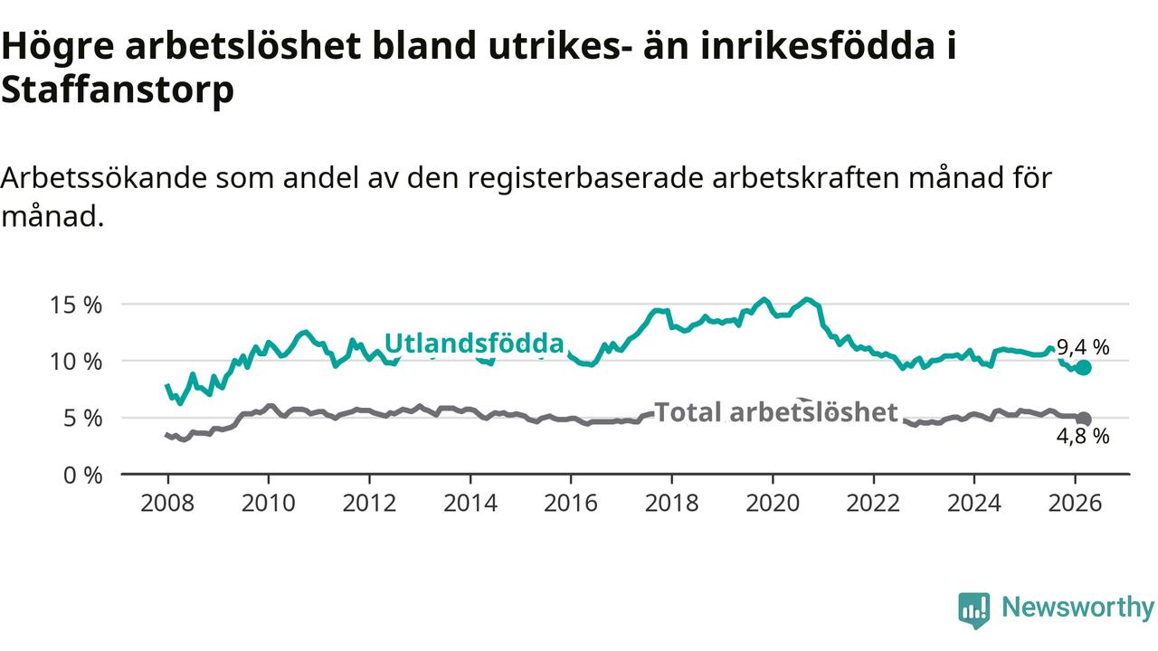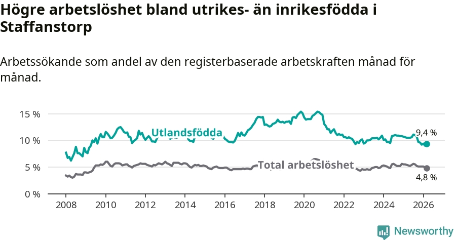 Arbetslösheten bland utlandsfödda var 9,4 procent i Staffanstorp under mars månad, motsvarande 270 av 2 872 personer. Det är 1,1 procentenheter färre än vid samma tidpunkt i fjol (−22 om man räknar personer). Därmed är de utlandsföddas arbetslöshet lägre än vid samma tidpunkt i fjol för sjunde månaden i följd. Sedan augusti 2025 har arbetslösheten bland utlandsfödda minskat från 11,0 till 9,4 procent.